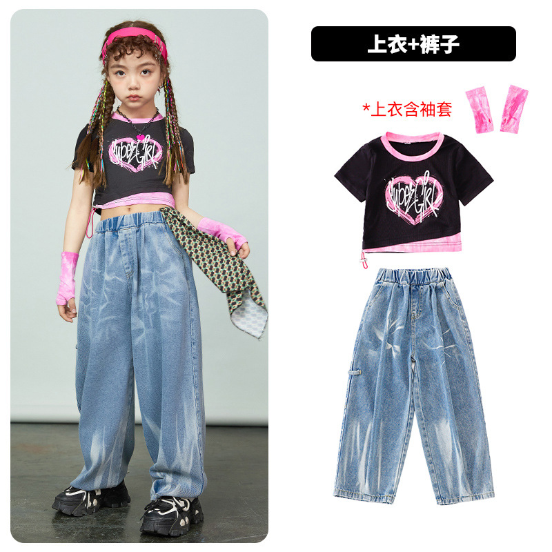 소녀 재즈 댄스 의류 어린이 캣워크 패션 멋진 유행 청바지 세트 배꼽 최고의 어린이 공연 의류 여름