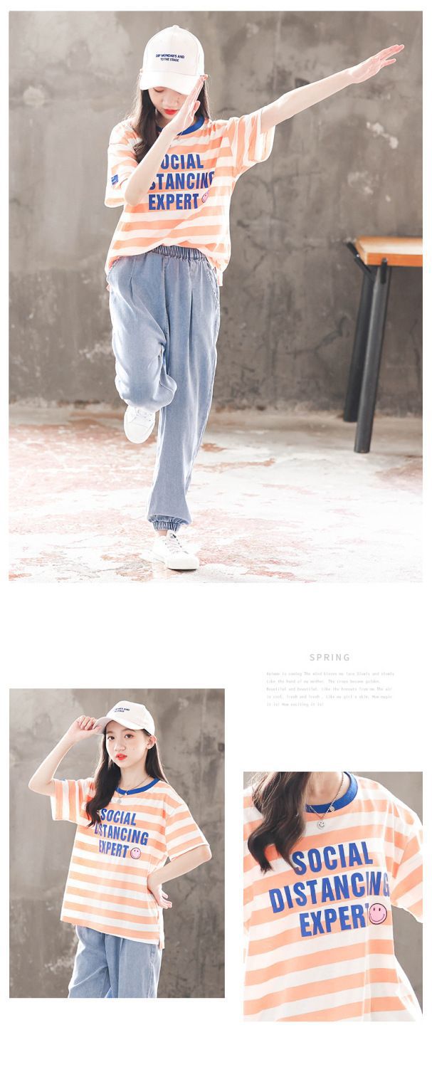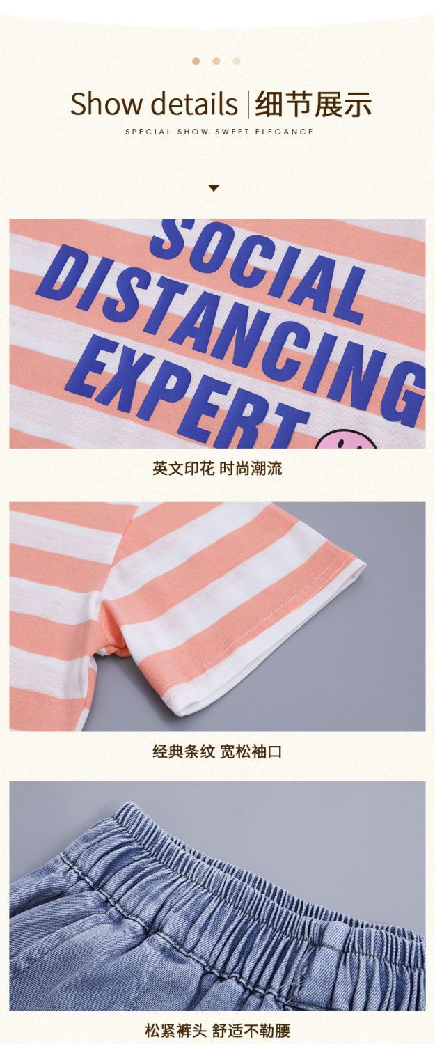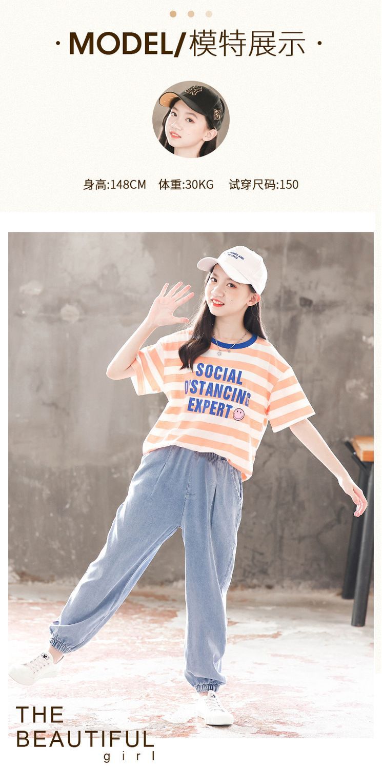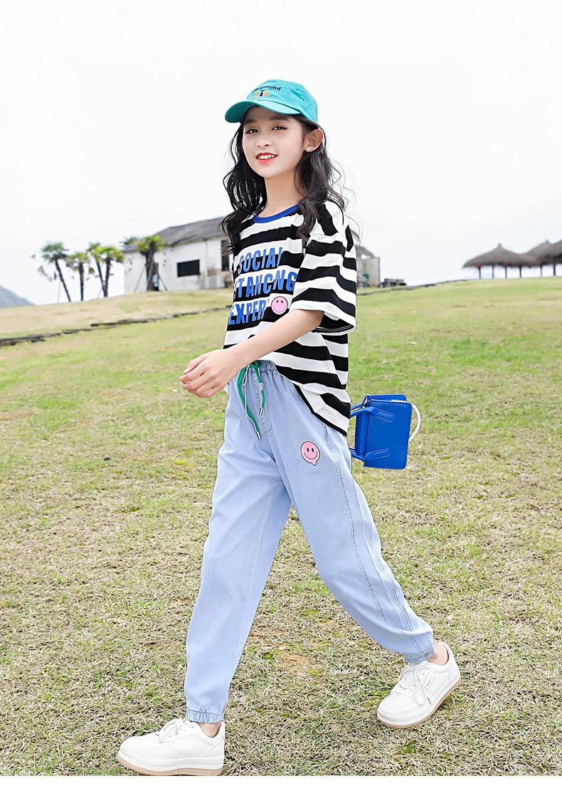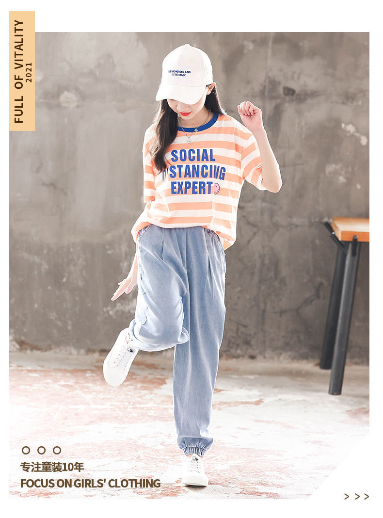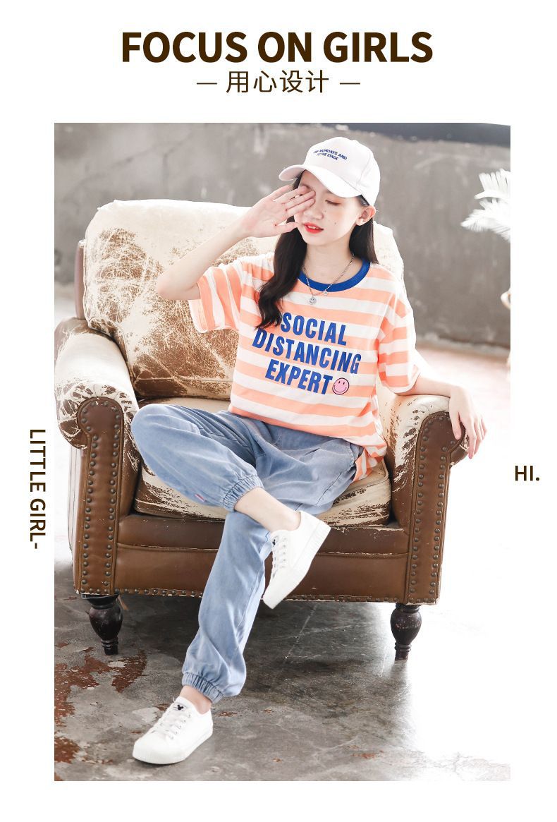 여자 여름 세트 2023 여름 새로운 어린이 스트라이프 티셔츠 청바지 큰 아이 스포츠 투피스 트렌디 세트스토어 가기