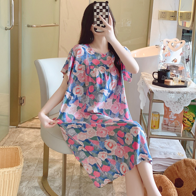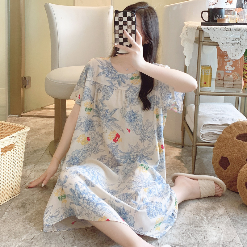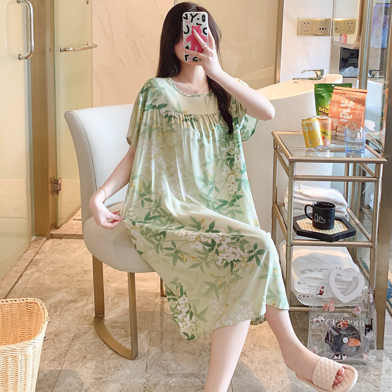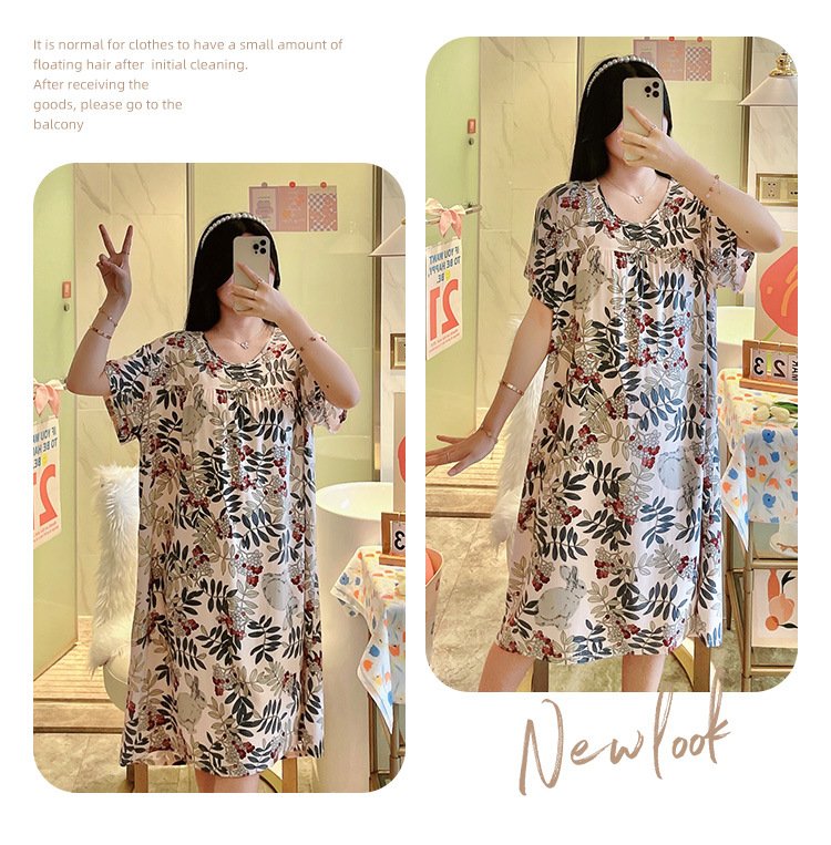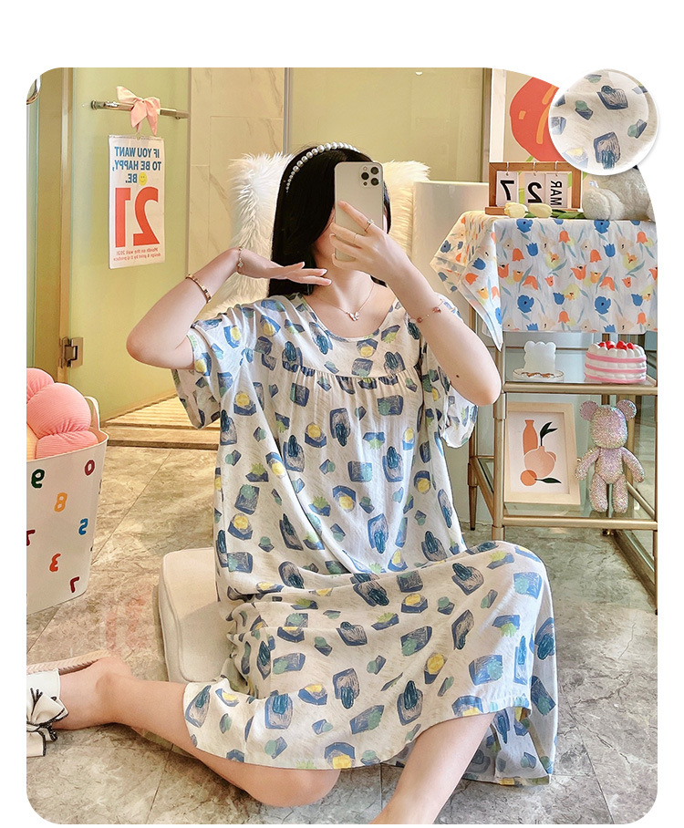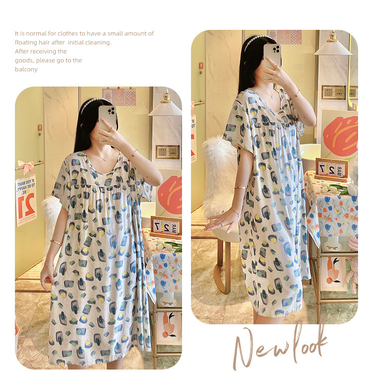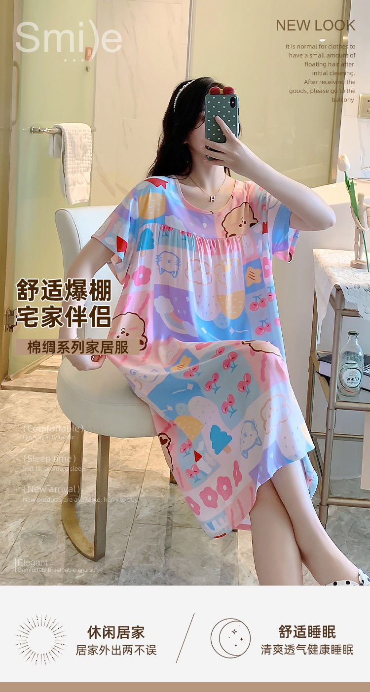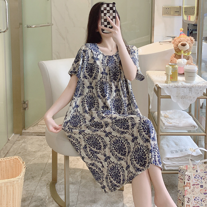 면 실크 나이트 드레스 여성의 여름 얇은 잠옷 홈 하이 엔드 센스 인쇄 인공 면 반소매 면 실크 원피스 플러스 사이즈스토어 가기