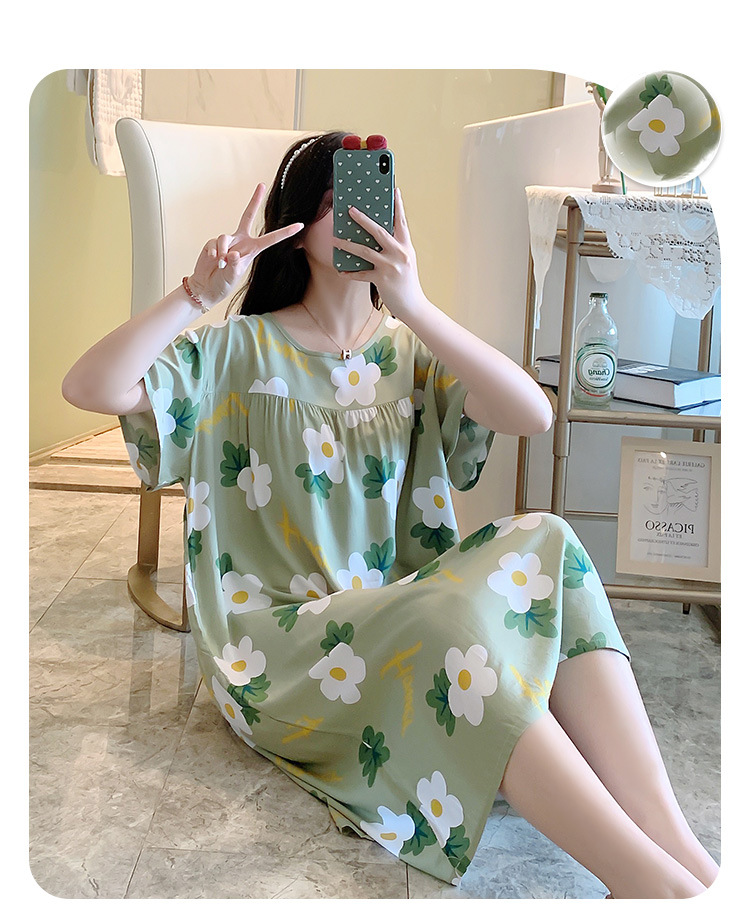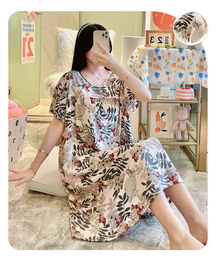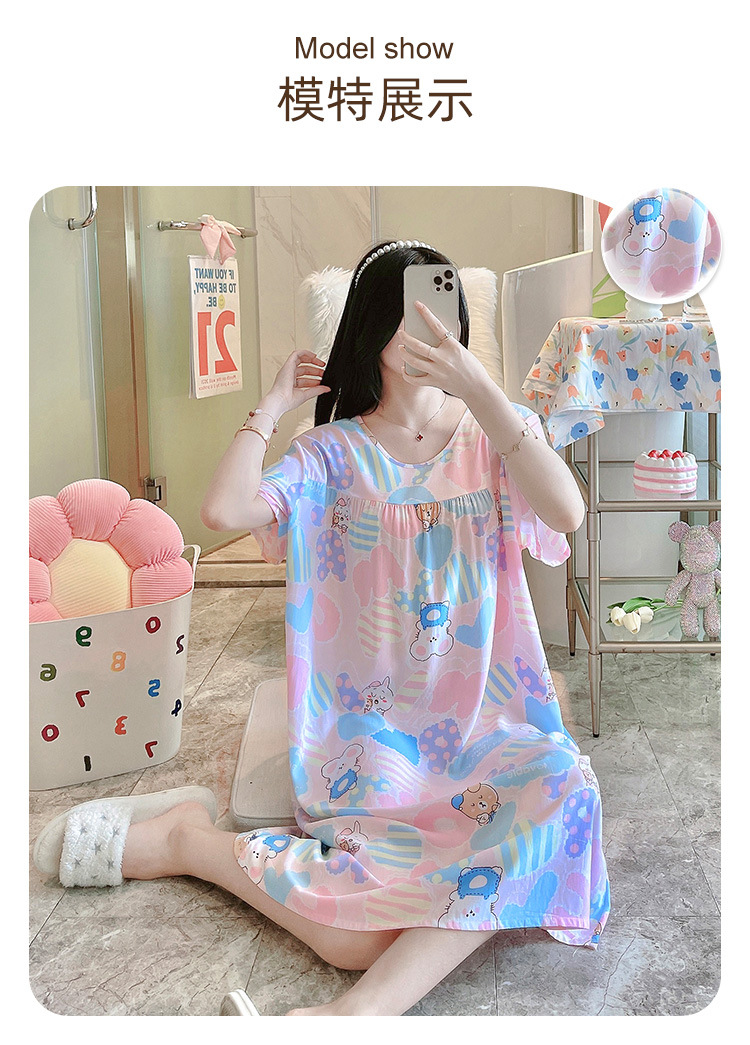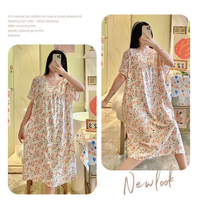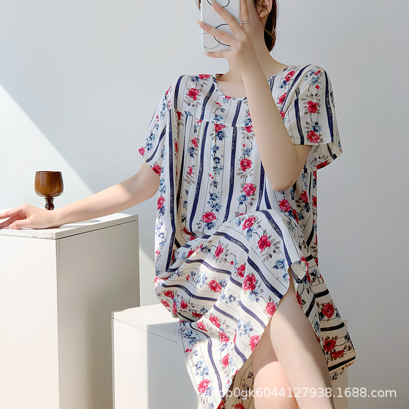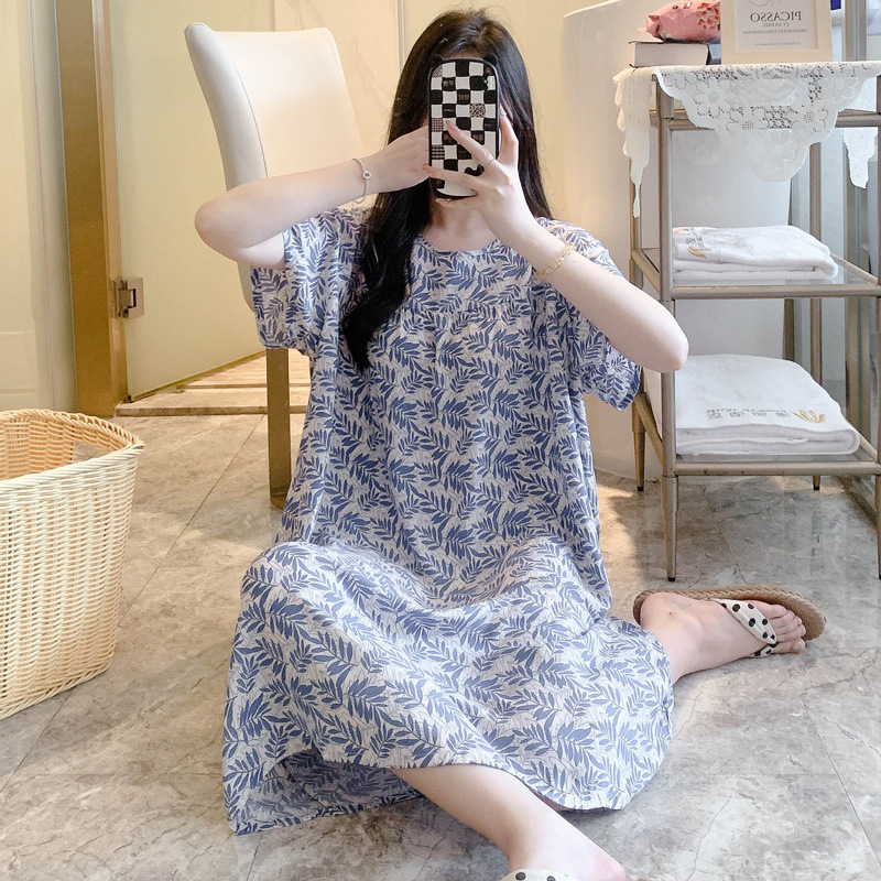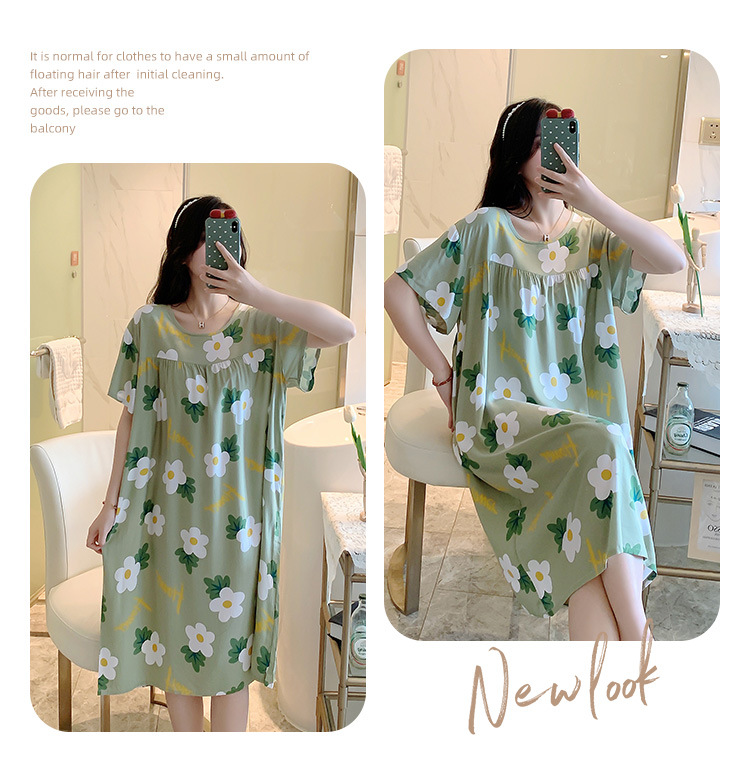 면 실크 나이트 드레스 여성의 여름 얇은 잠옷 홈 하이 엔드 센스 인쇄 인공 면 반소매 면 실크 원피스 플러스 사이즈스토어 가기