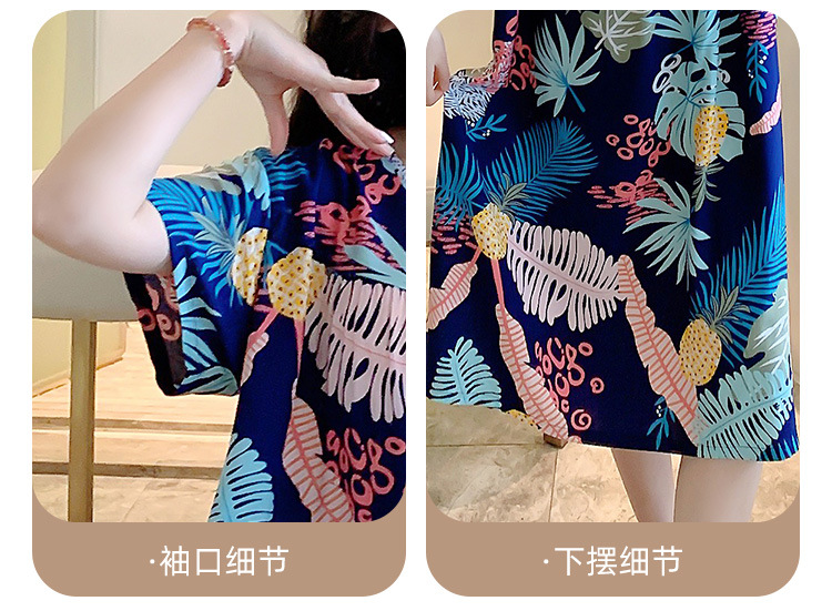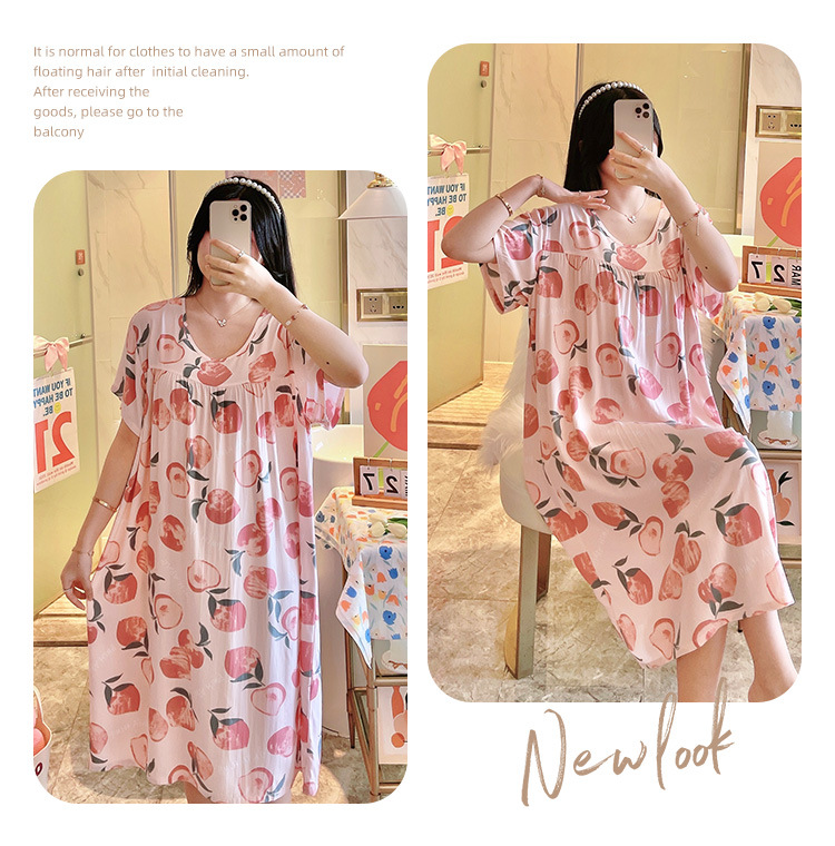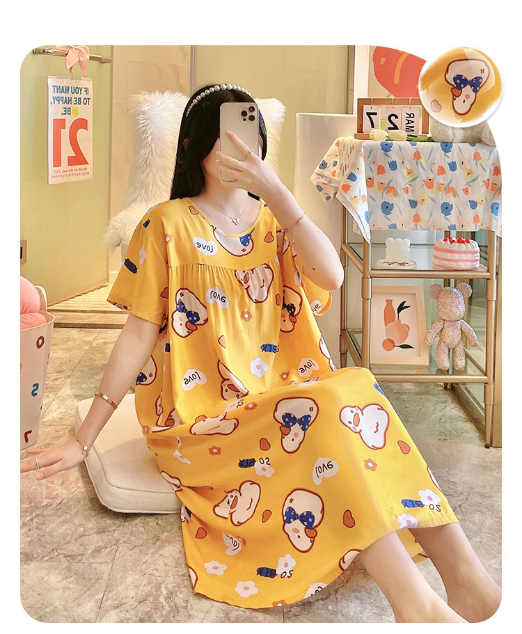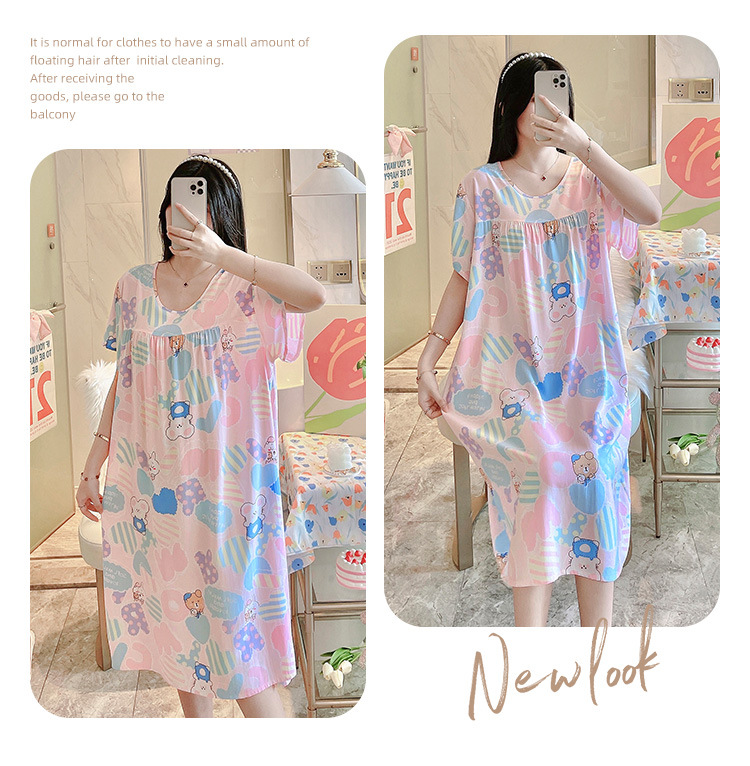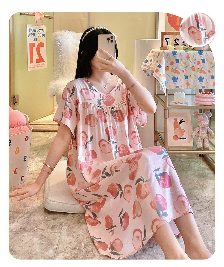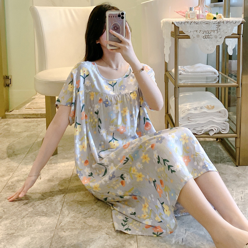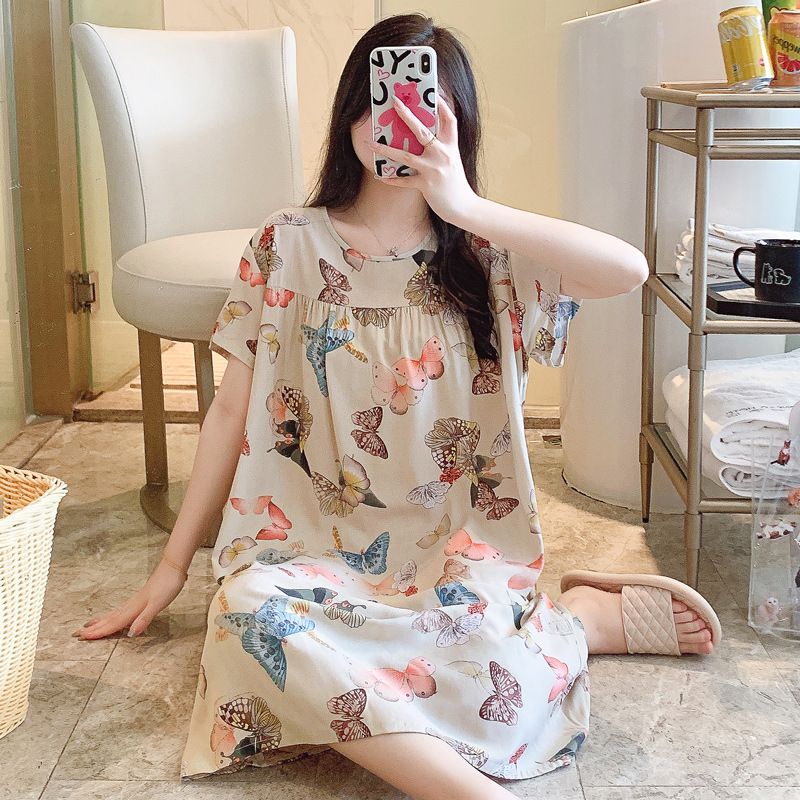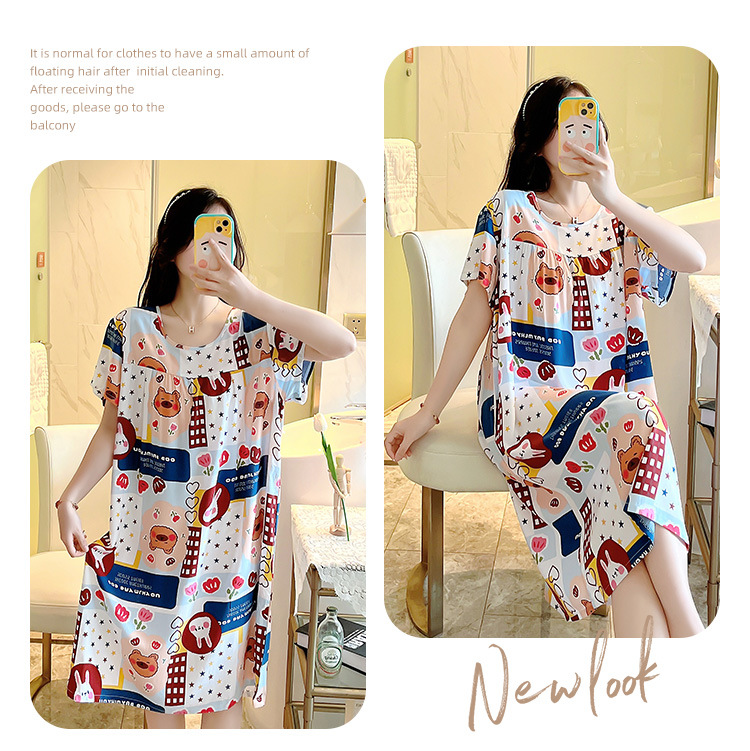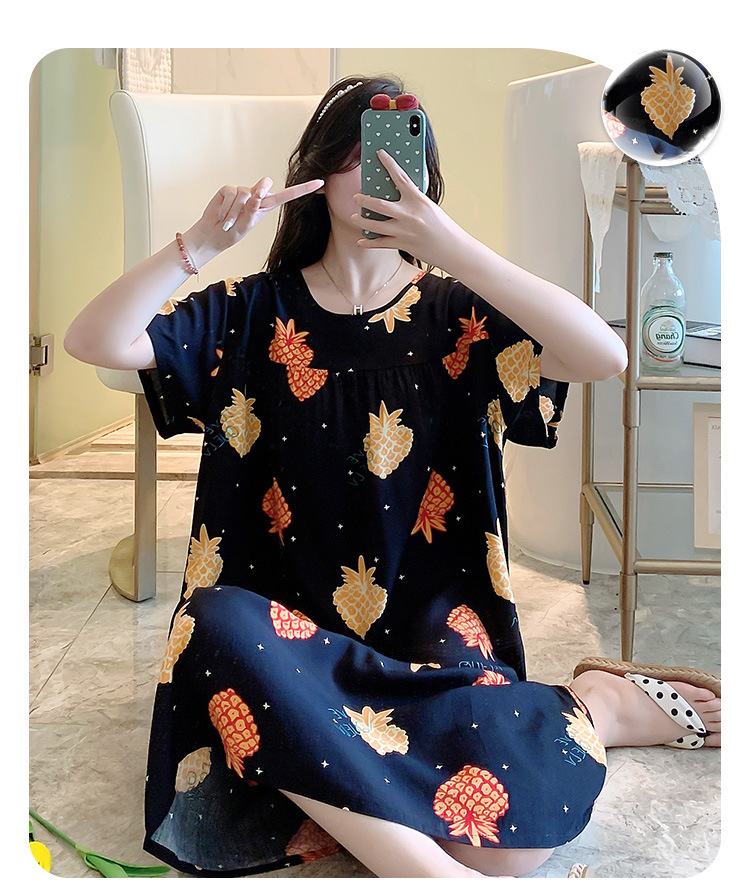 면 실크 나이트 드레스 여성의 여름 얇은 잠옷 홈 하이 엔드 센스 인쇄 인공 면 반소매 면 실크 원피스 플러스 사이즈스토어 가기