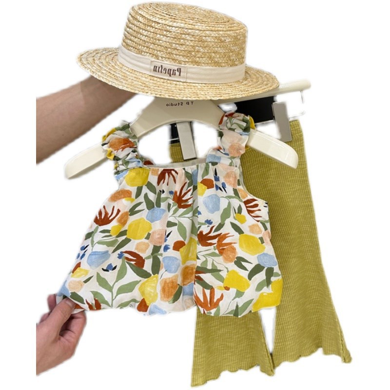 여자 정장 꽃 서스펜더 버드 탑 플러스 스트레치 벨 바지 25 여름 의류 새로운 대외 무역 아동 의류 세대