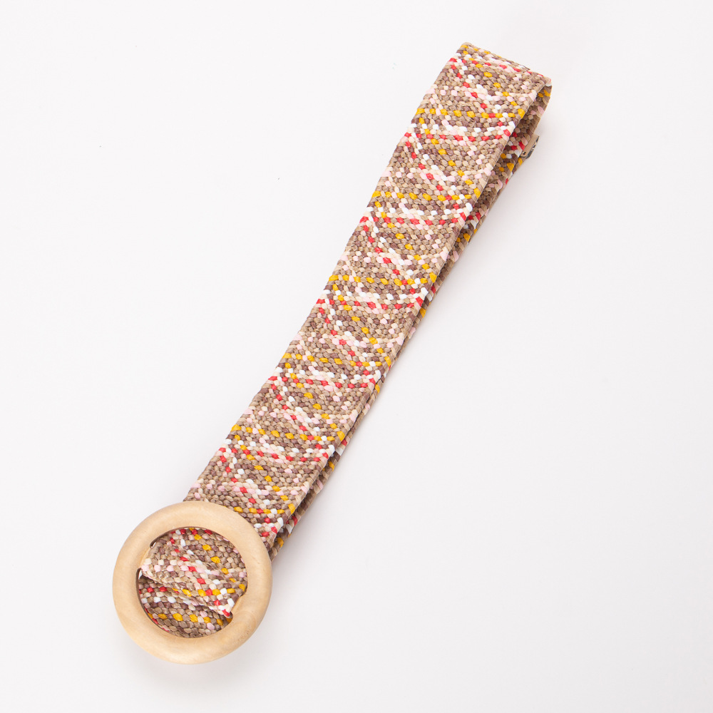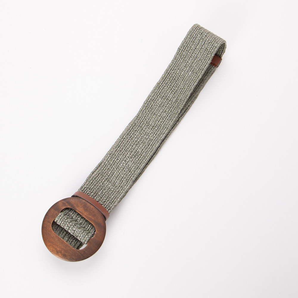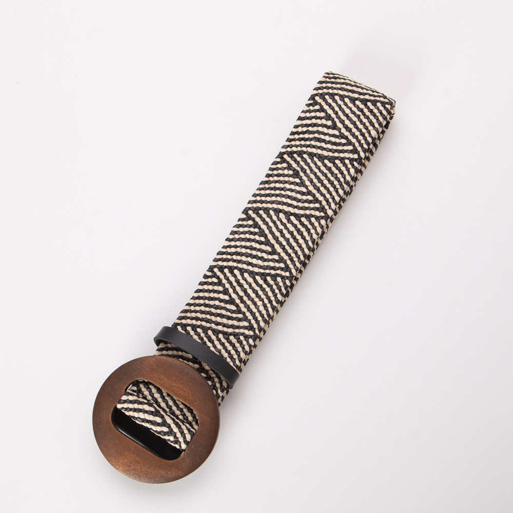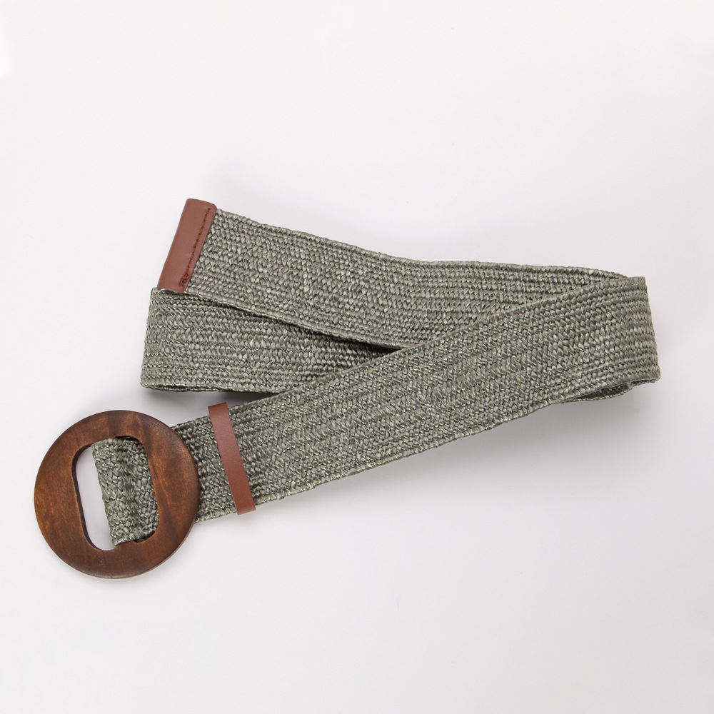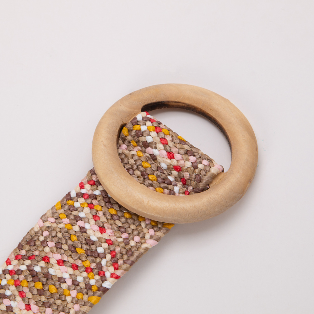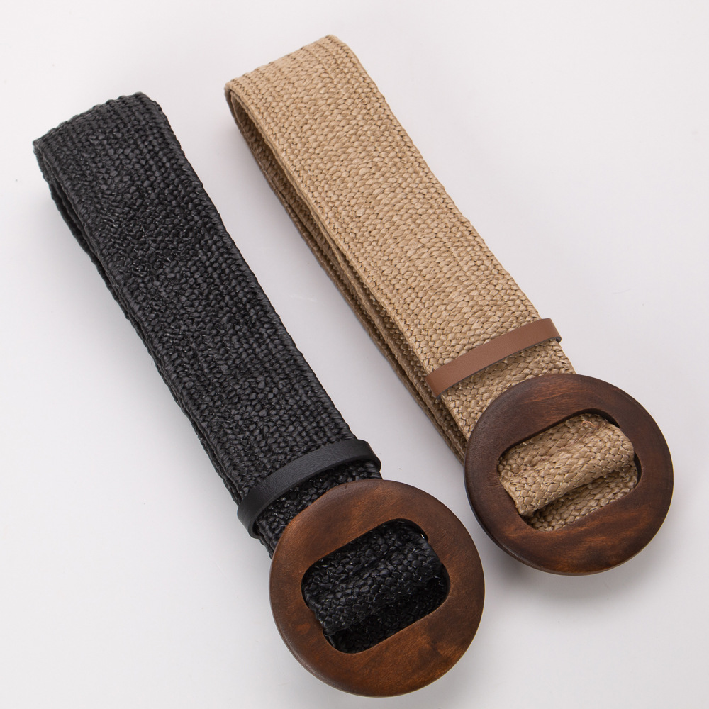 에스닉 스타일 PP 잔디 짠 벨트 나무 버클 라운드 버클 탄성 비 다공성 와이드 벨트 보헤미안 린넨 벨트 허리 씰스토어 가기