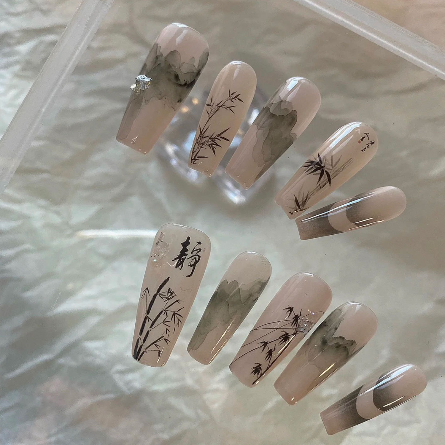 그물 빨간 네일 아트 중국식 잉크 대나무 스티커 복고풍 대나무 잎 접착제 손톱 얇은 터프 데칼 보석 도매