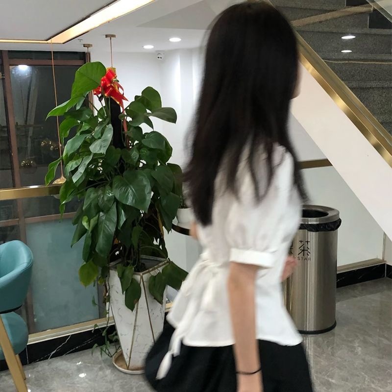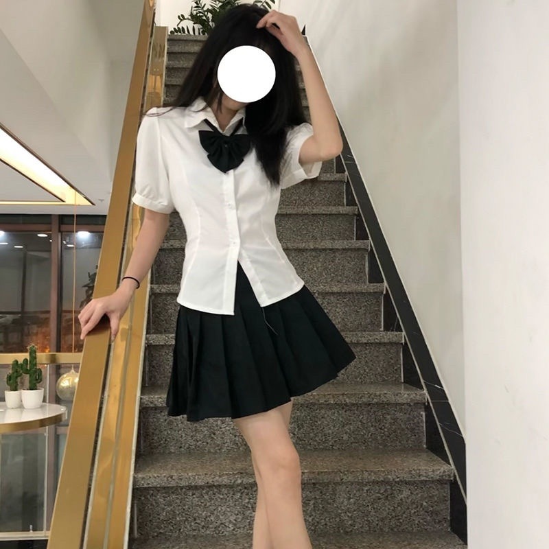 • 꽉 허리 셔츠 + 검은 나비 넥타이 + 검은 주름 치마 (세트)