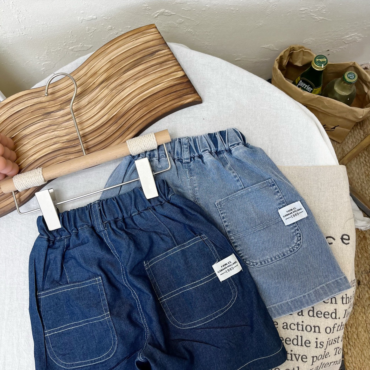 새로운 2023 여름 어린이 텐셀 데님 라벨 반바지 소년과 소녀 한국 스타일 캐주얼 바지 소프트 데님 트렌디 바지스토어 가기