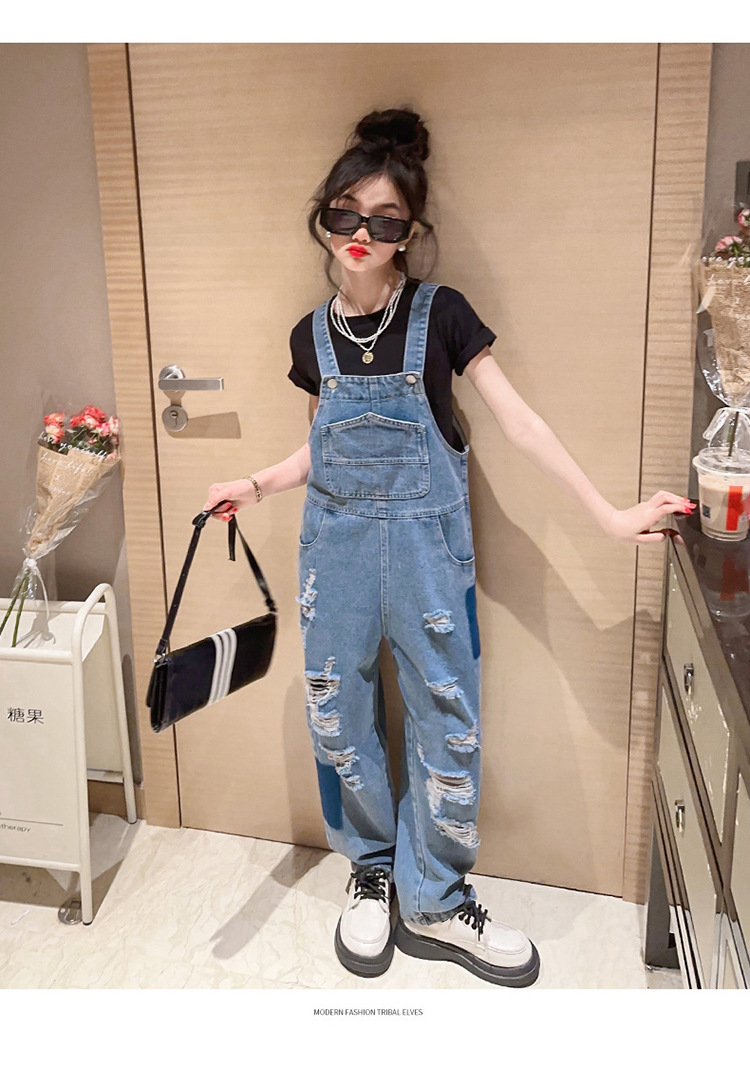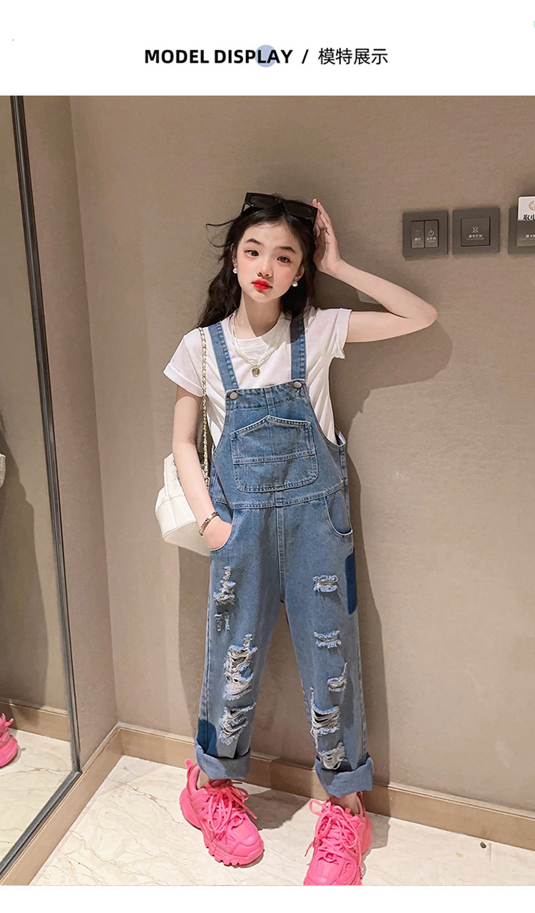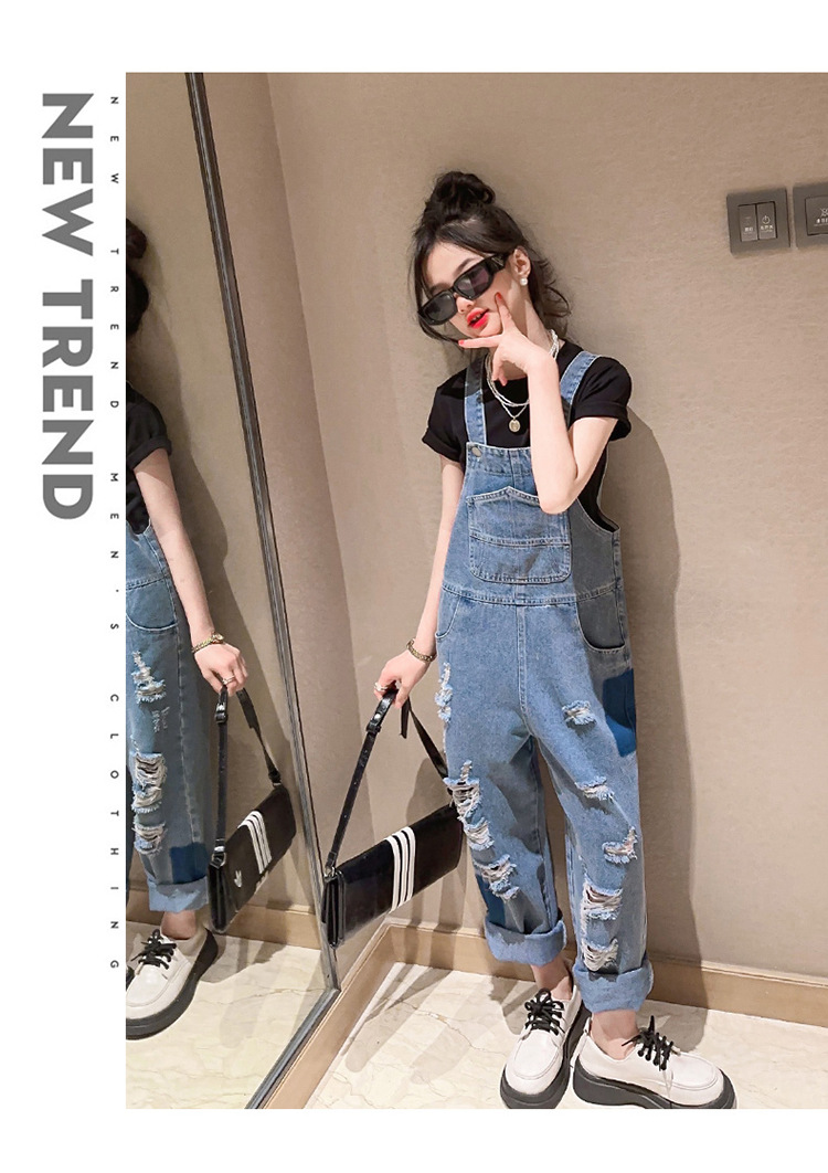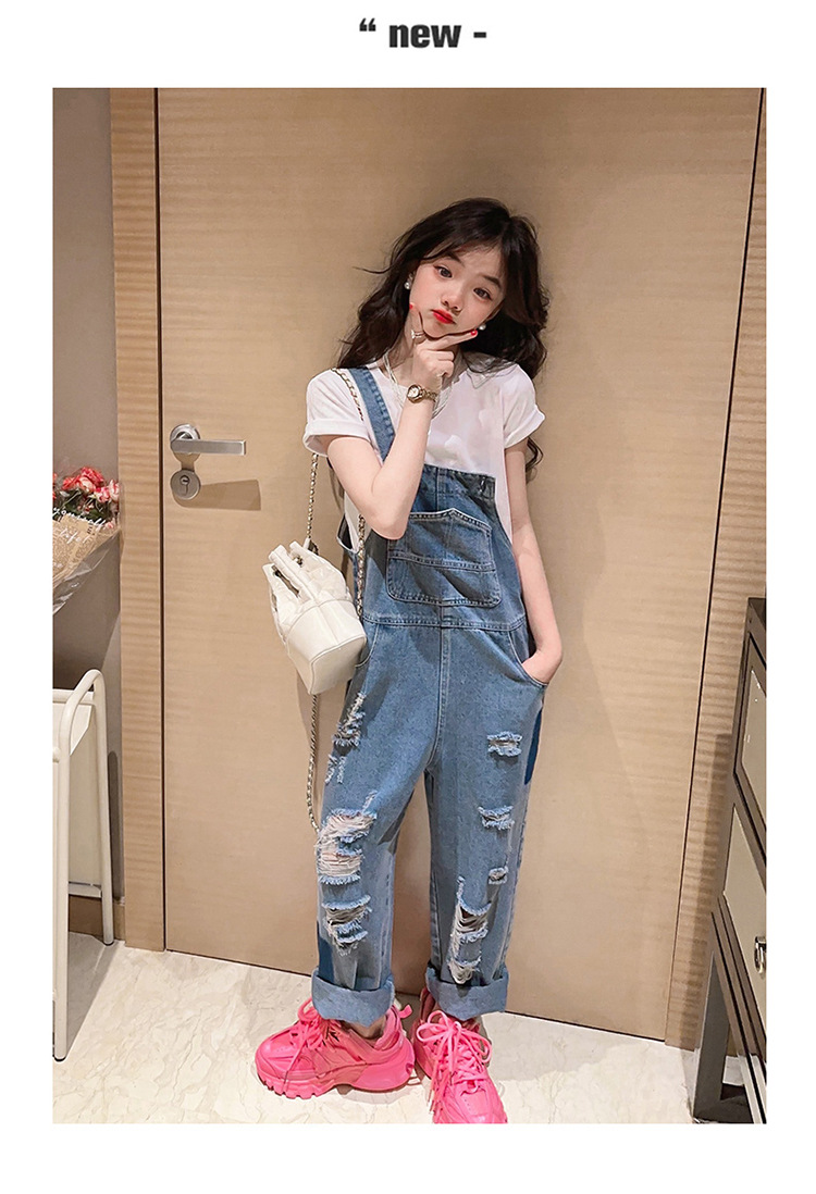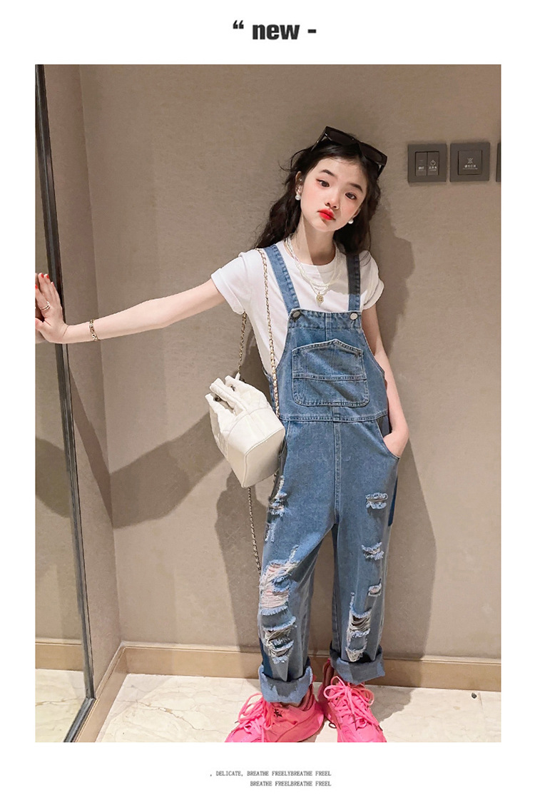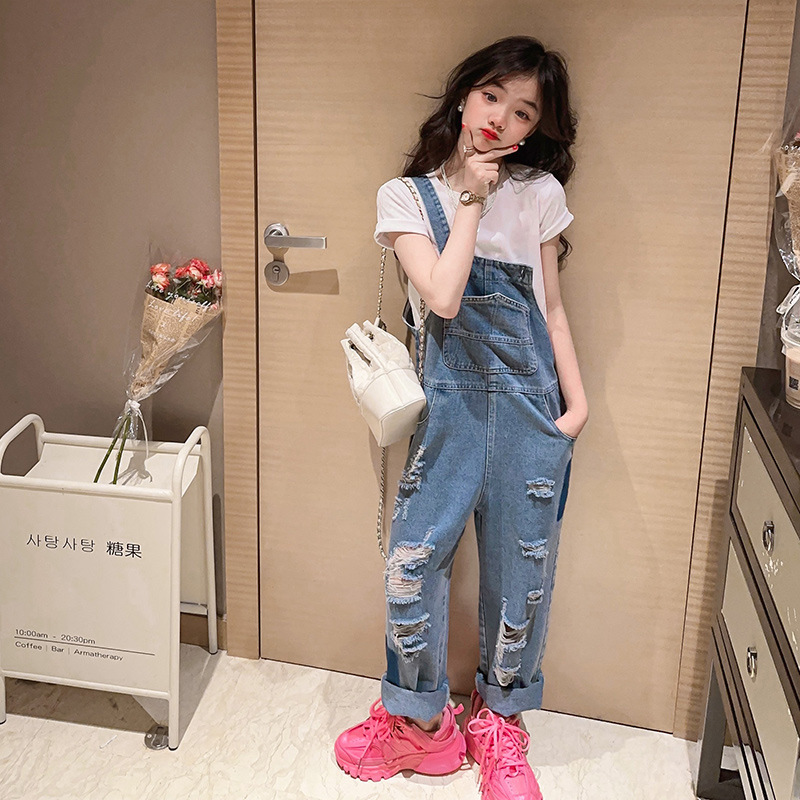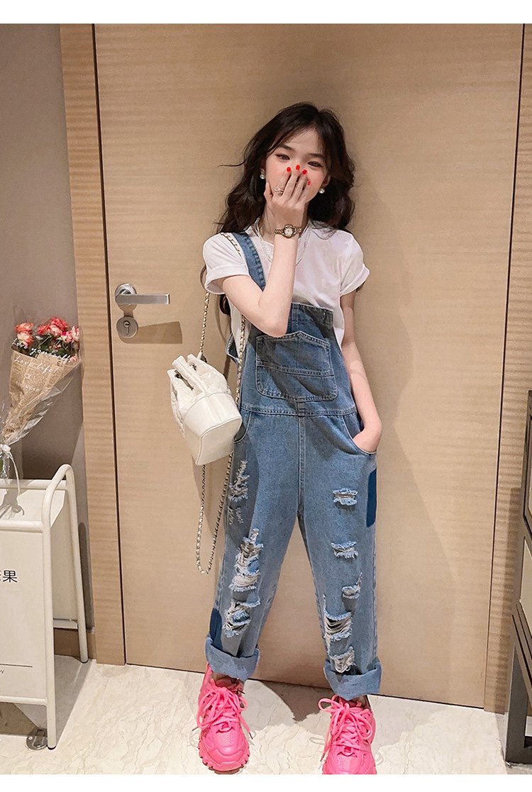 여자 여름 데님 멜빵 바지 세트 2023 새로운 한국 스타일 인터넷 연예인 큰 아이들 느슨한 찢어진 토레 바지스토어 가기