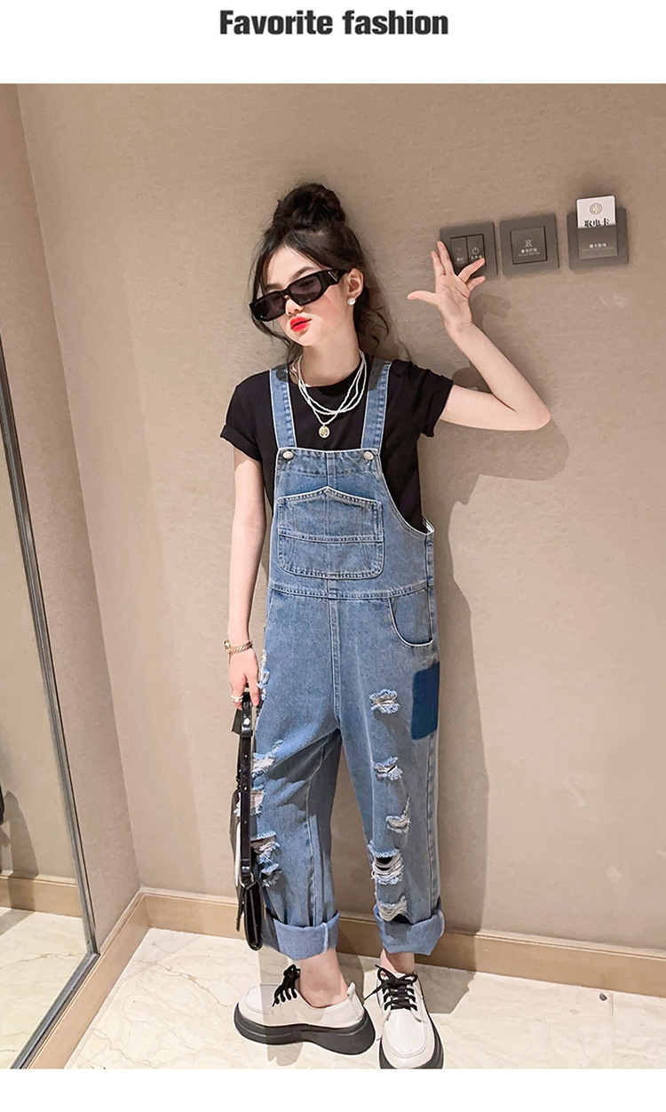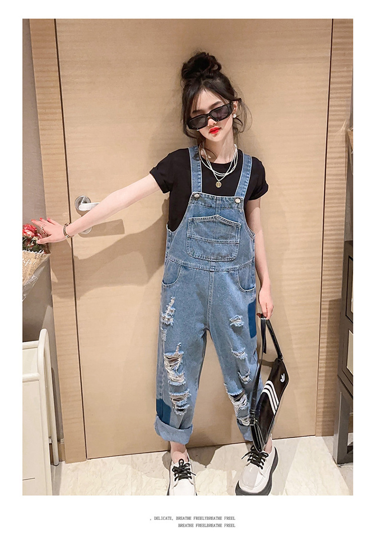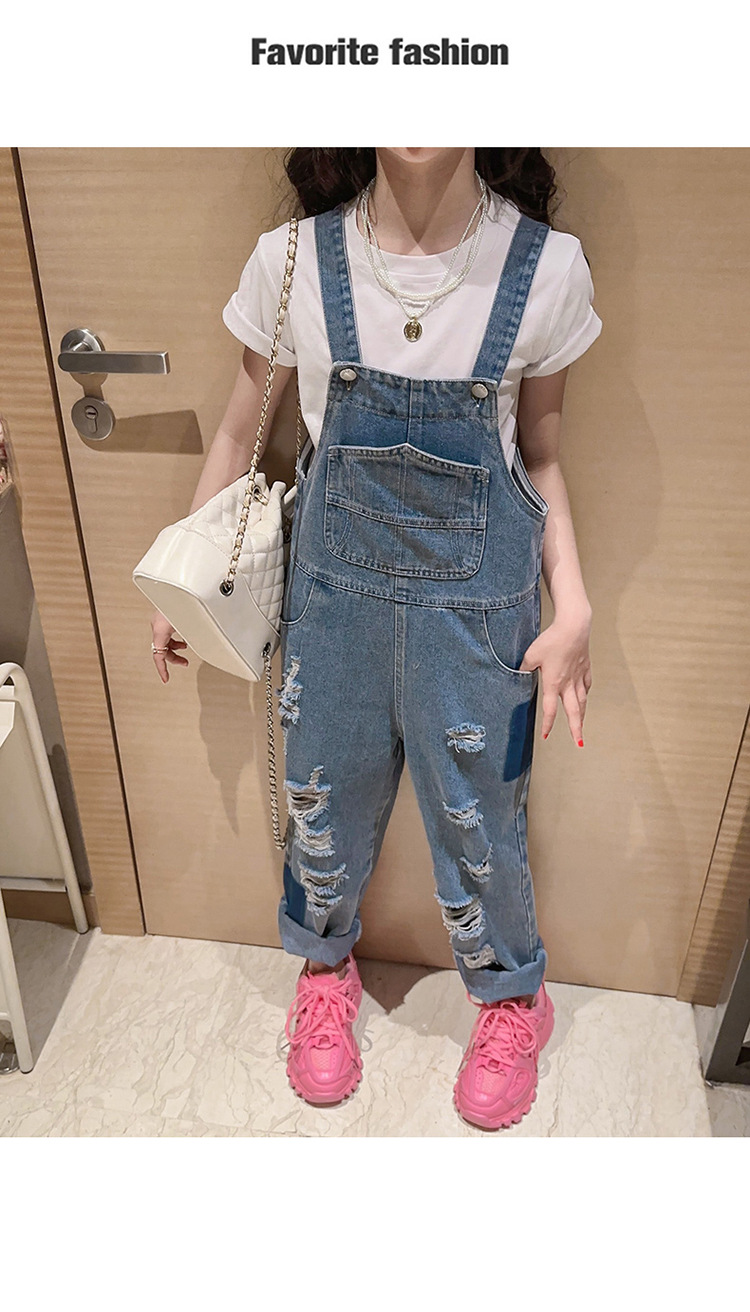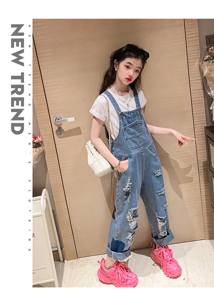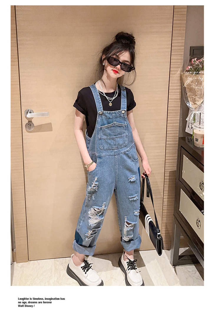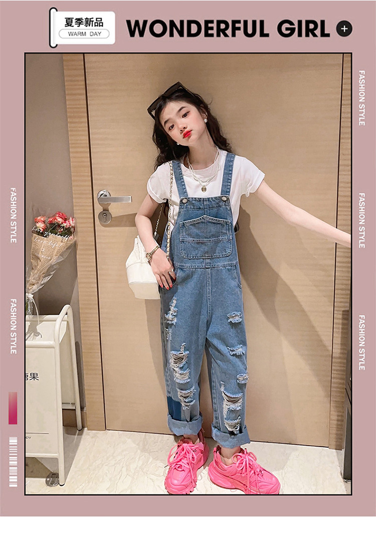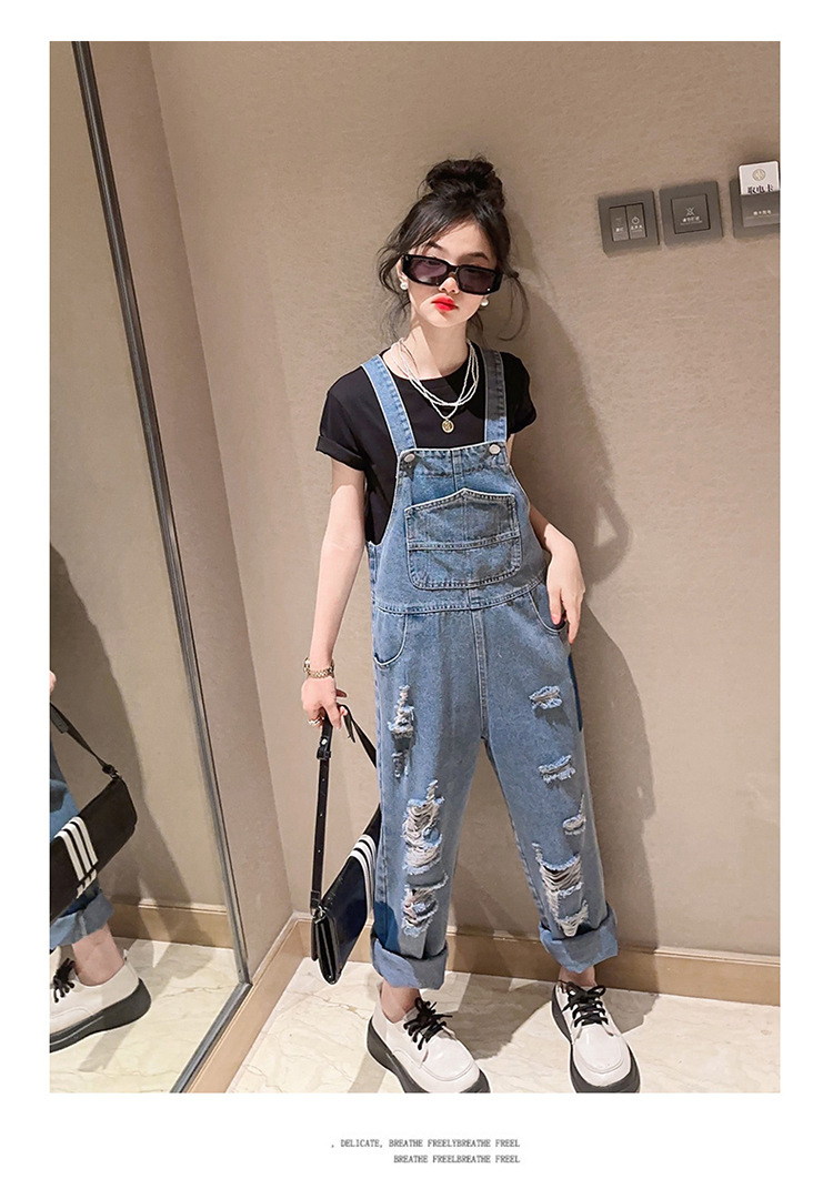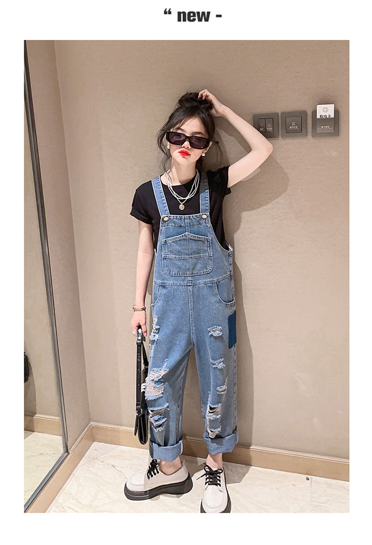 여자 여름 데님 멜빵 바지 세트 2023 새로운 한국 스타일 인터넷 연예인 큰 아이들 느슨한 찢어진 토레 바지스토어 가기