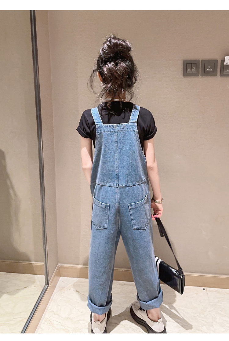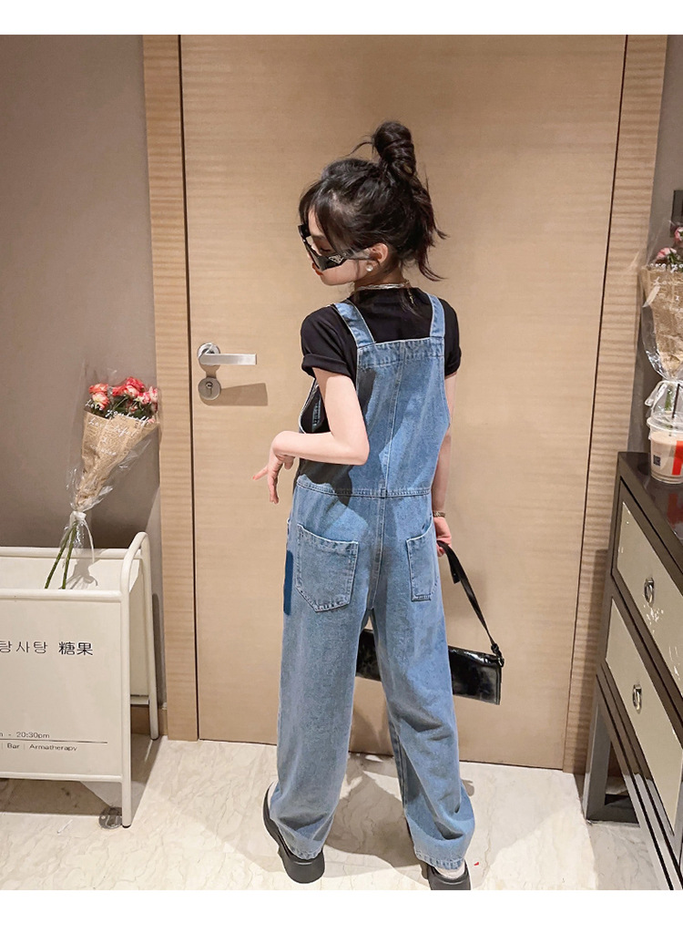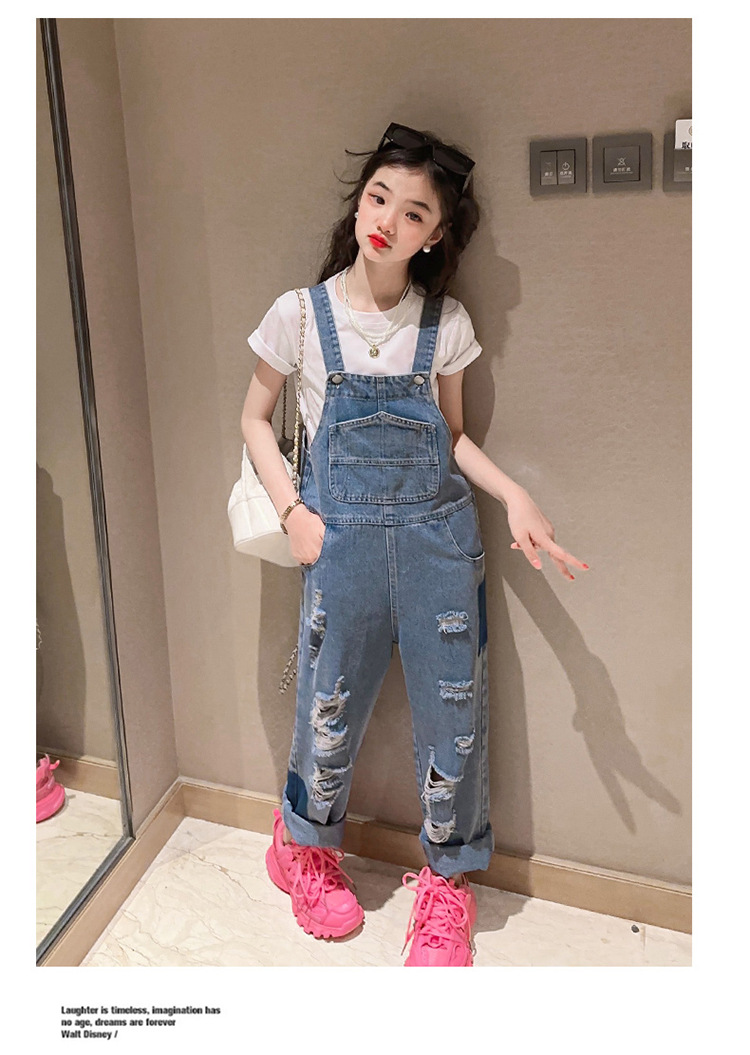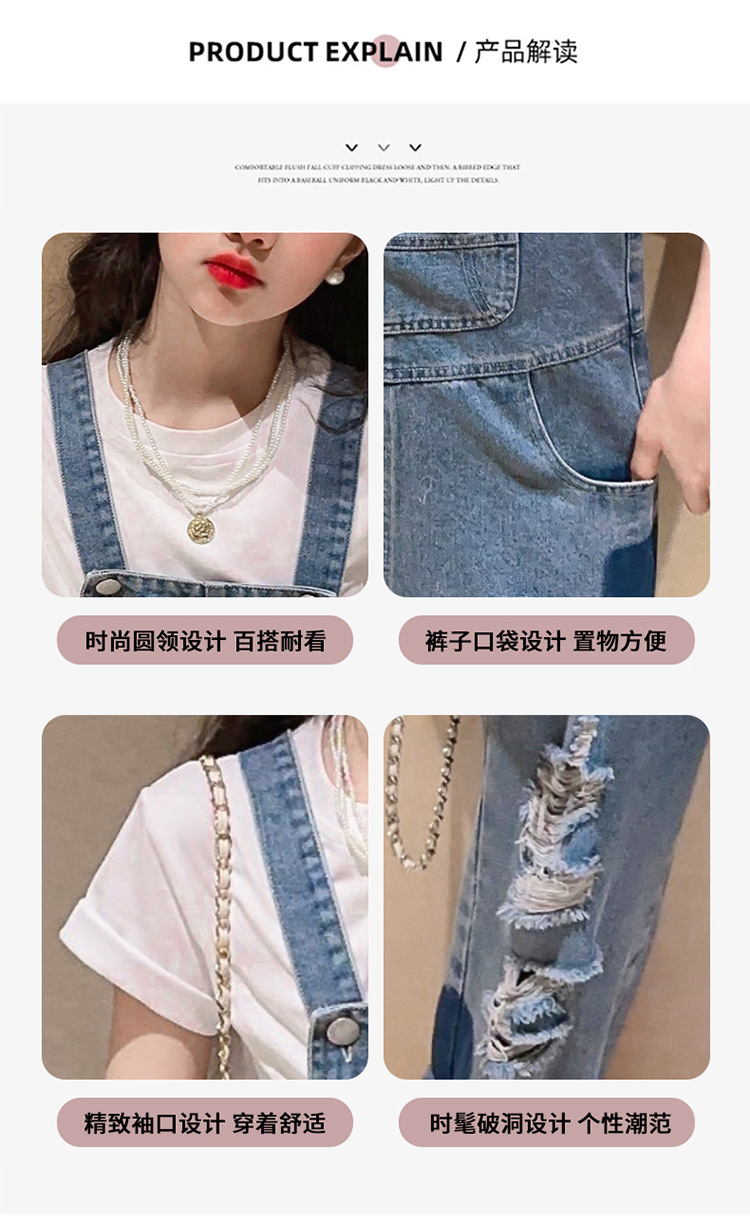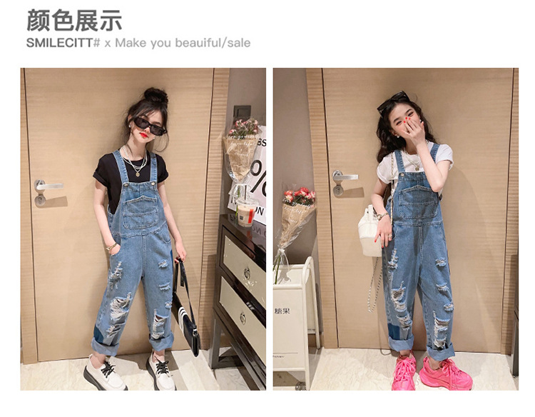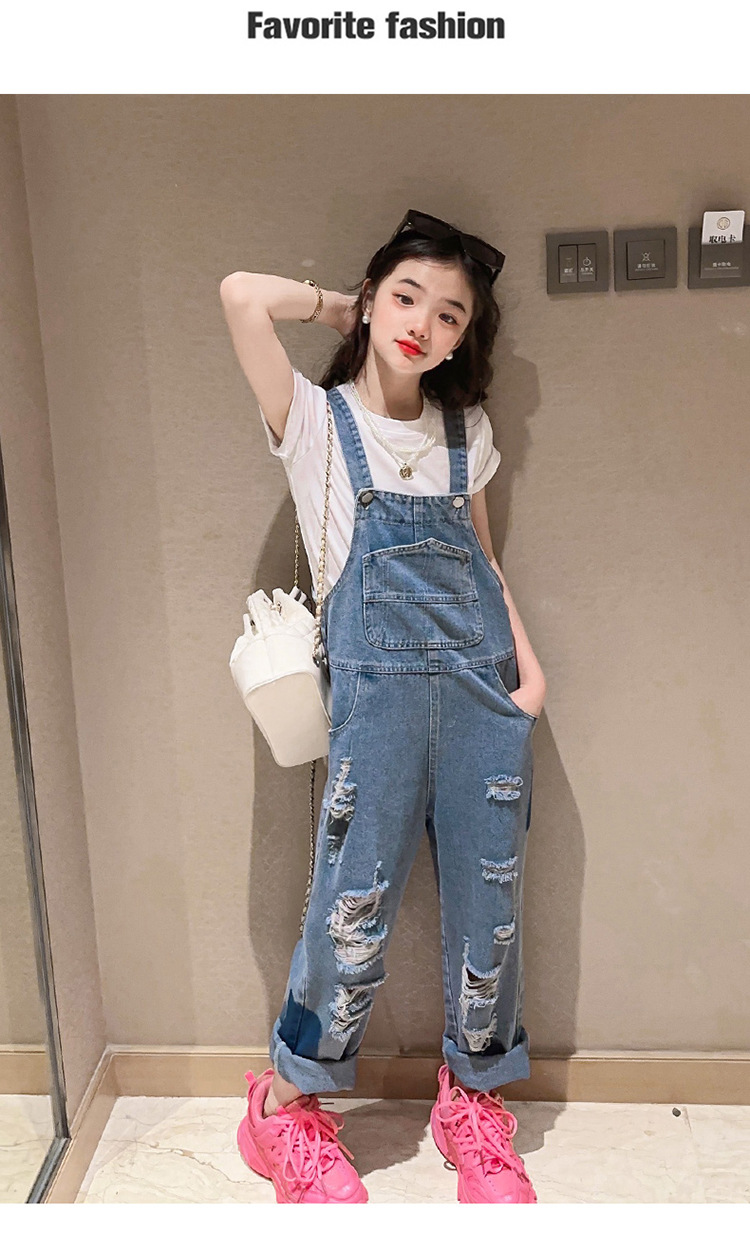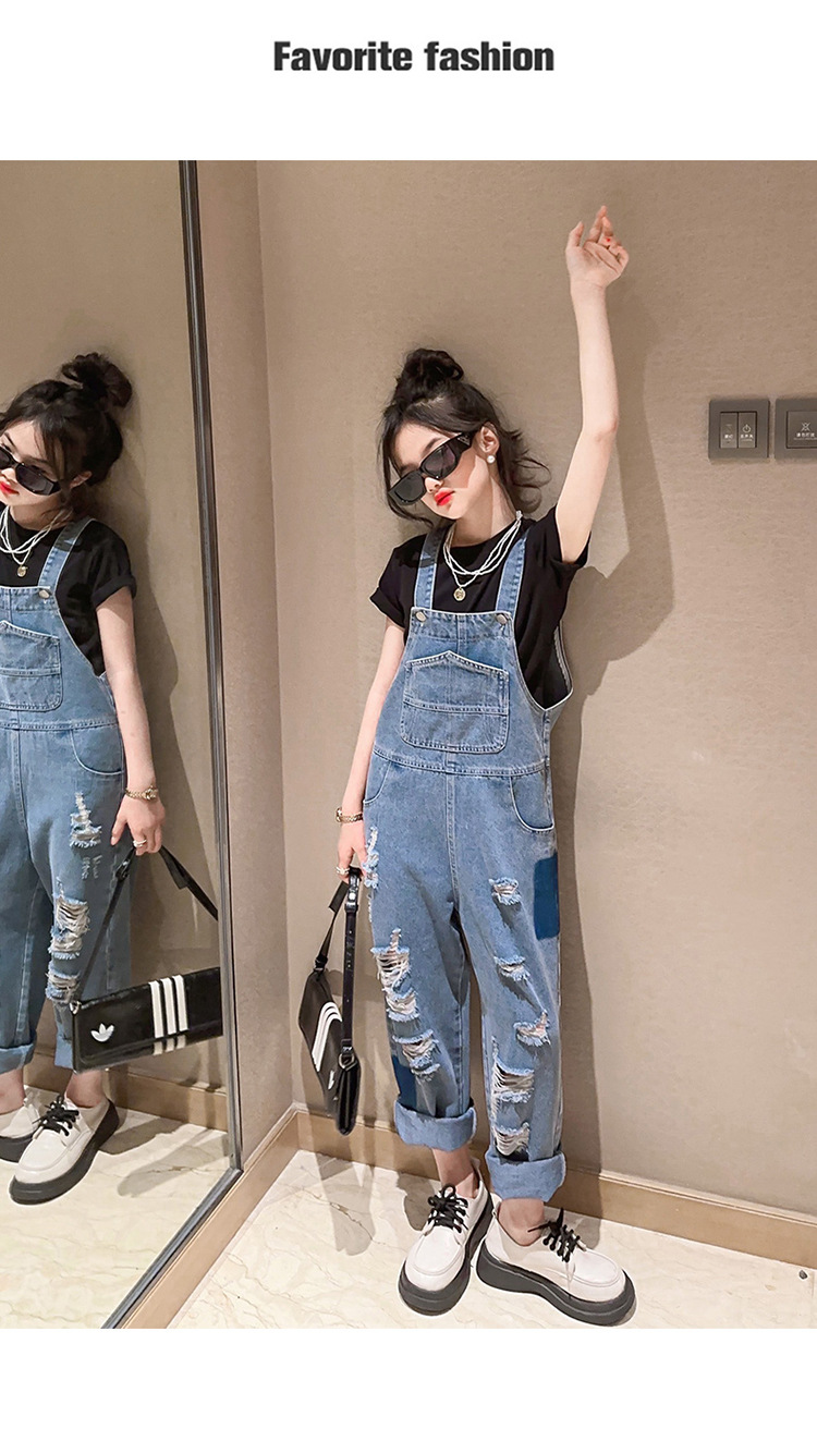 여자 여름 데님 멜빵 바지 세트 2023 새로운 한국 스타일 인터넷 연예인 큰 아이들 느슨한 찢어진 토레 바지스토어 가기