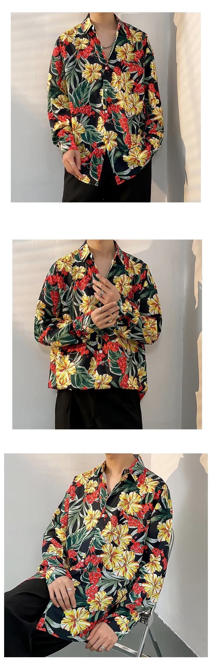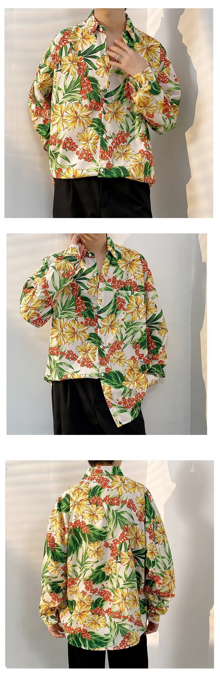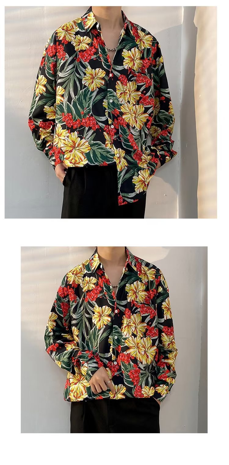일본 스타일 인스 타 그램 스타일 여름 긴 소매 꽃 셔츠 남자와 여자를 위한 복고풍 느슨한 셔츠 하와이 해변 커플스토어 가기