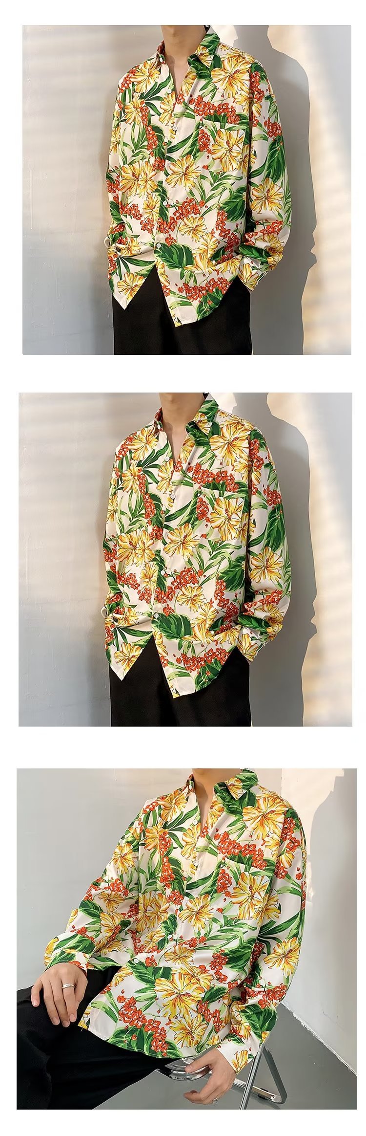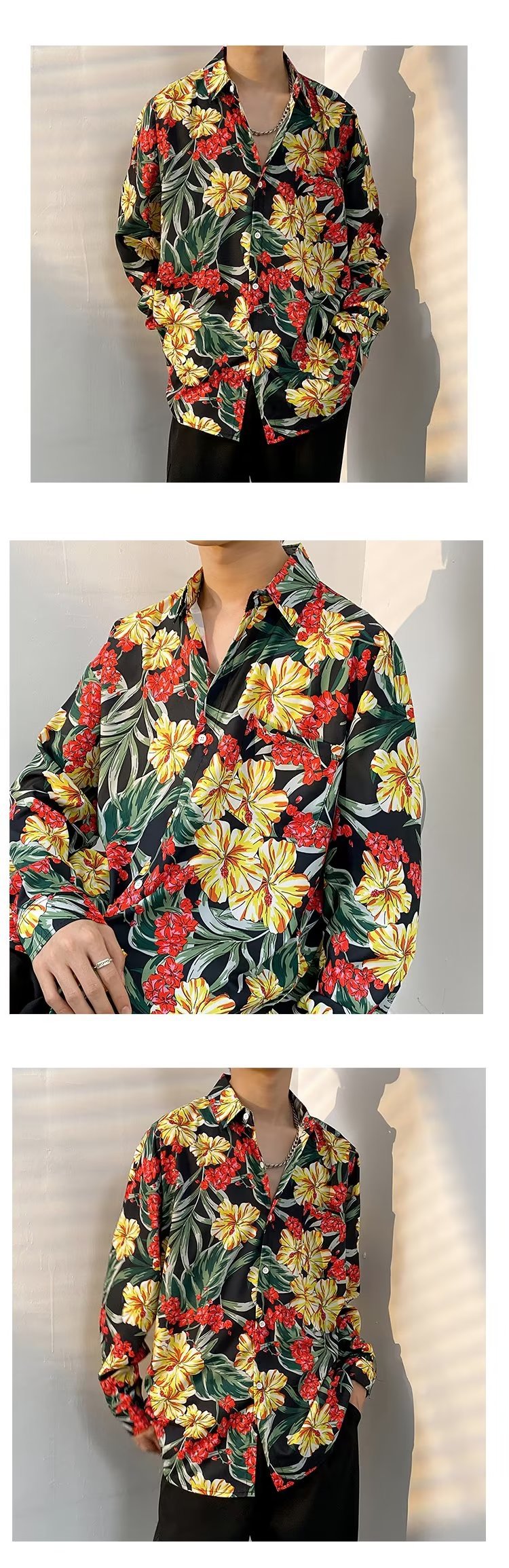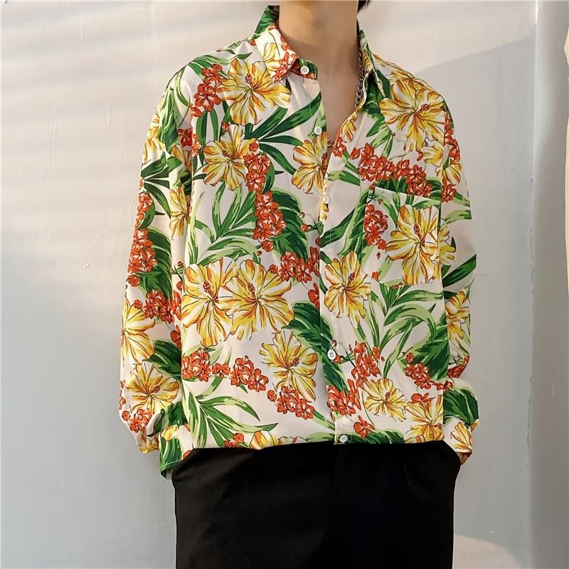 일본 스타일 인스 타 그램 스타일 여름 긴 소매 꽃 셔츠 남자와 여자를 위한 복고풍 느슨한 셔츠 하와이 해변 커플스토어 가기