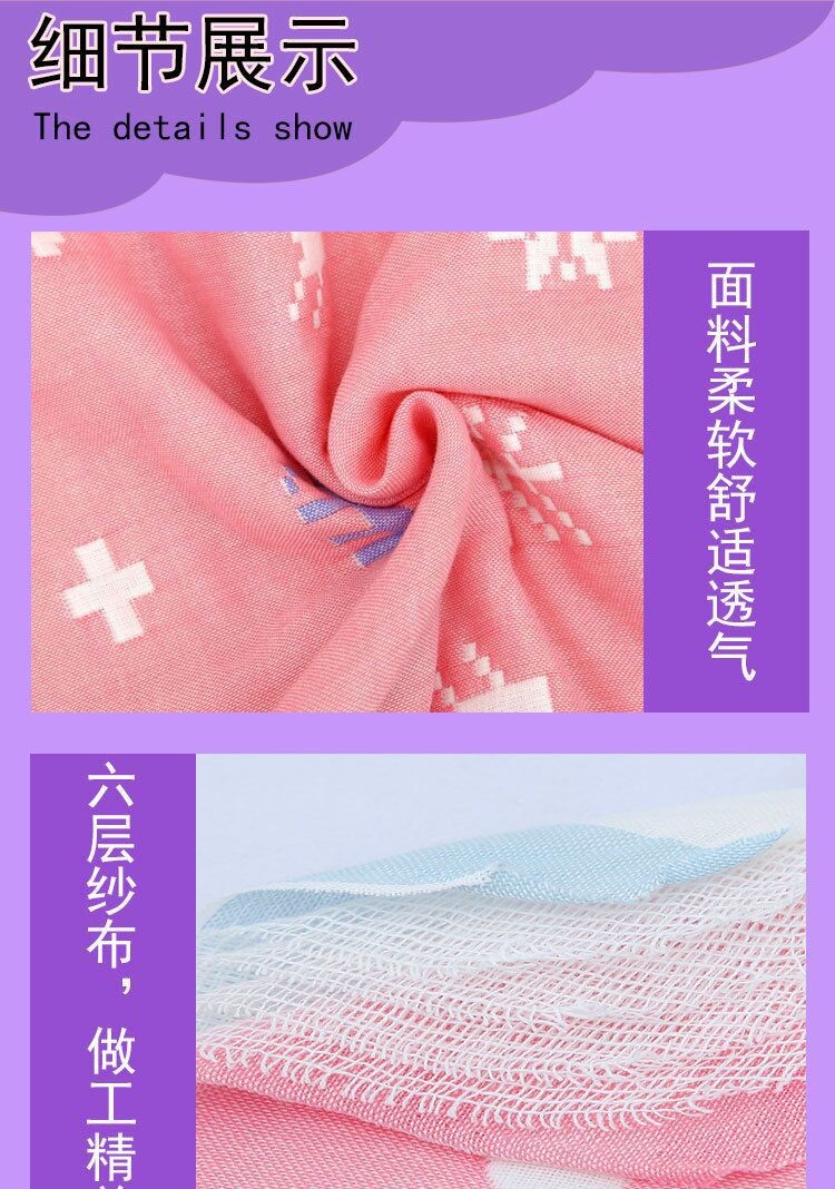 纯棉六层纱布双面提花 卡通图案,不掉毛,不起球,不掉色,无异味, 无甲醛和荧光剂,柔软亲肤 吸汗透气 舒适自然 ,人工测量剪裁有1厘米左右的误差.纯棉纱布有缩水现象5%,洗涤要求单独常温手洗或着柔和档位机洗,抚平晾干