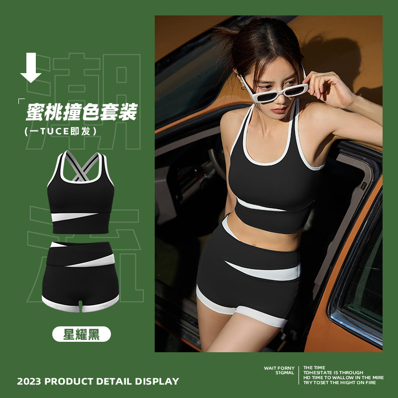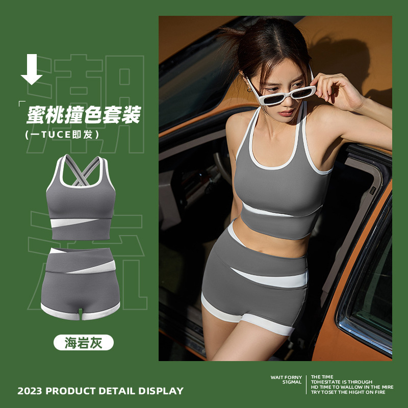 여름 새로운 복숭아 대조 색상 노웨어 브래지어 조끼 탑 겉옷 모닝 런 피트니스 스포츠 3 점 반바지 세트스토어 가기