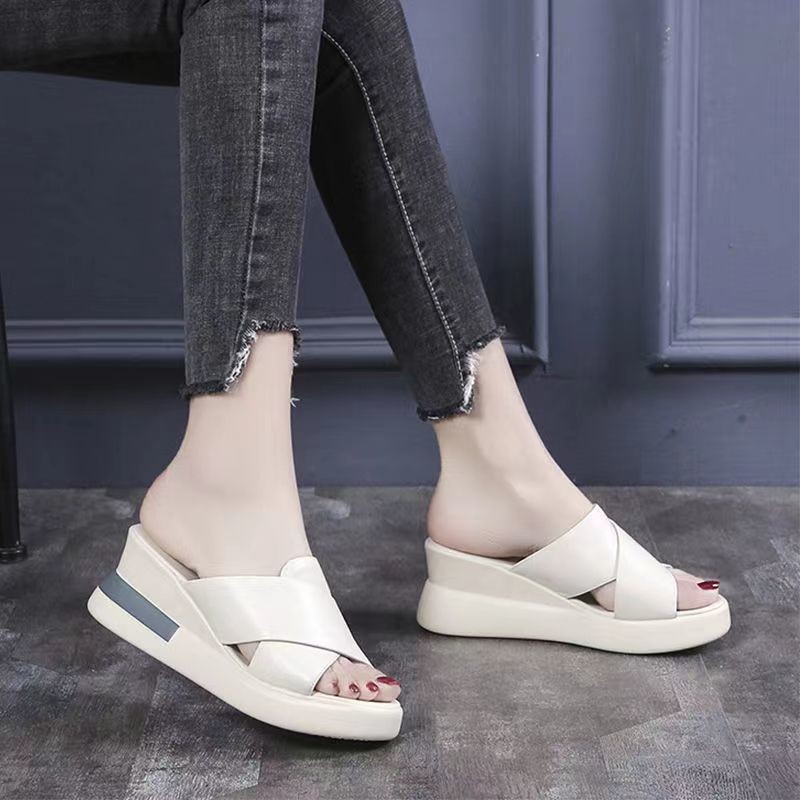 여성을위한 웨지 슬리퍼 2023 여름 새로운 캐주얼 오픈 발가락 요정 스타일 두꺼운 밑창 플랫폼 크로스 여성용 대형 슬리퍼스토어 가기