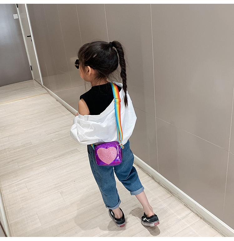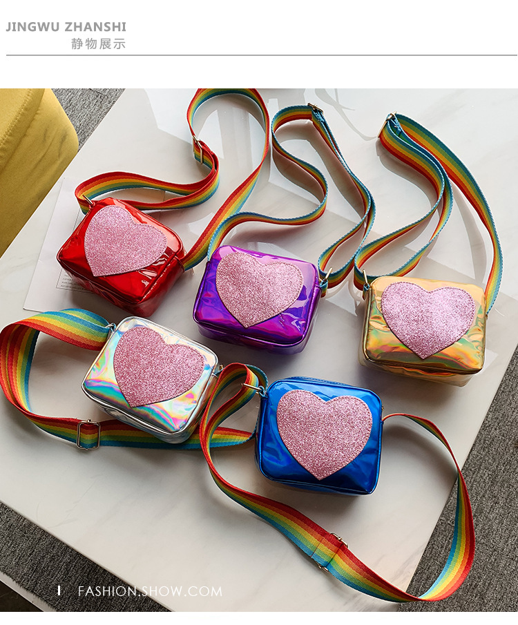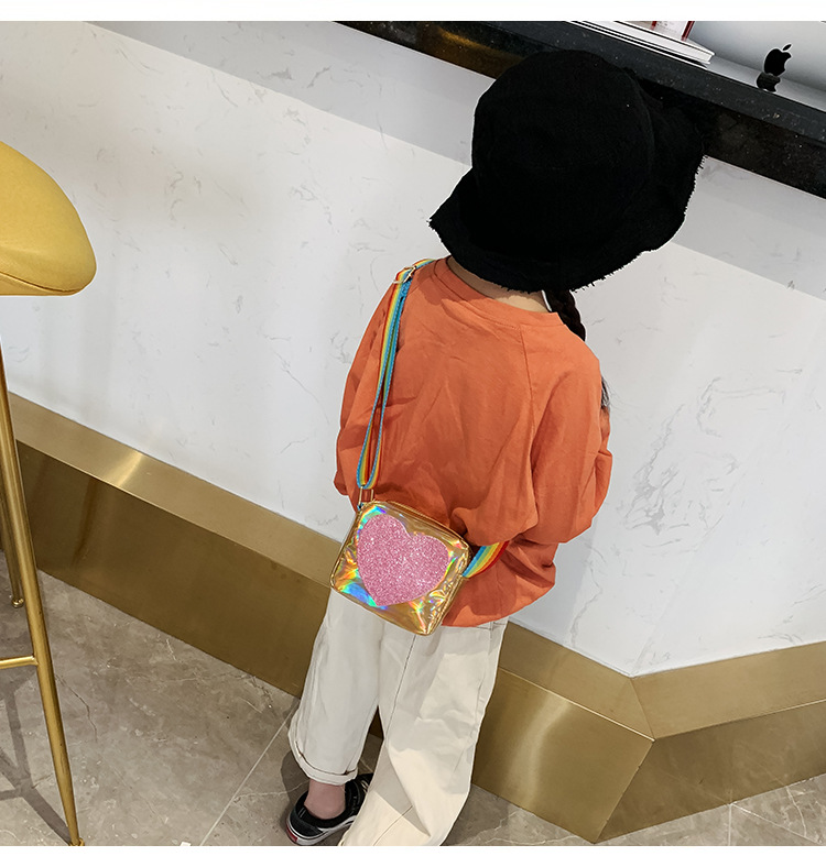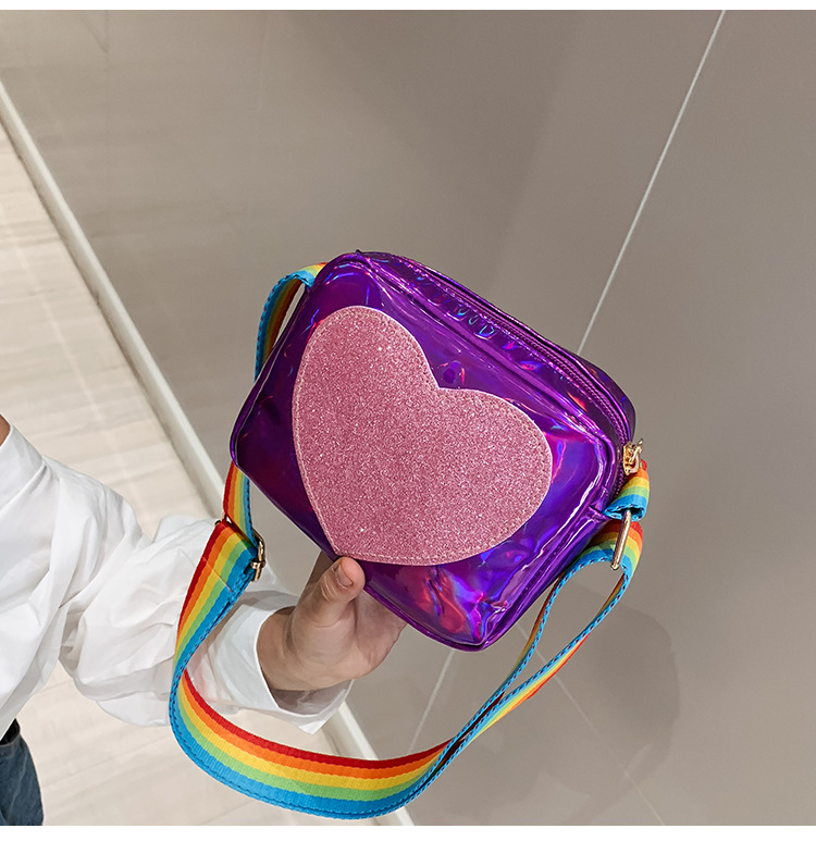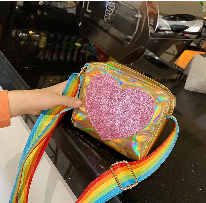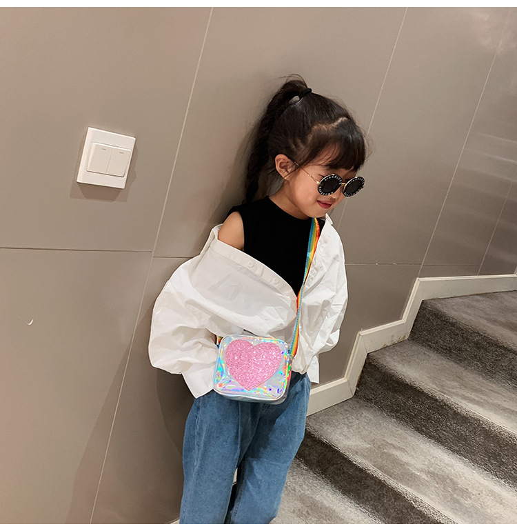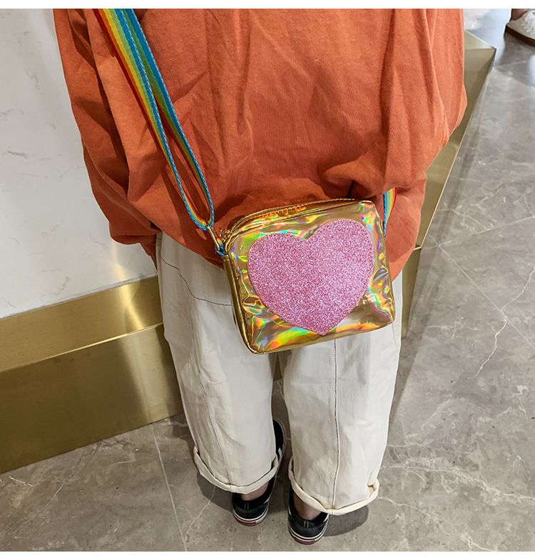 한국 스타일 어린이 미니 가방 레이저 Pu 광택 복숭아 심장 어깨 메신저 가방 소녀의 여름 장식 동전 지갑스토어 가기