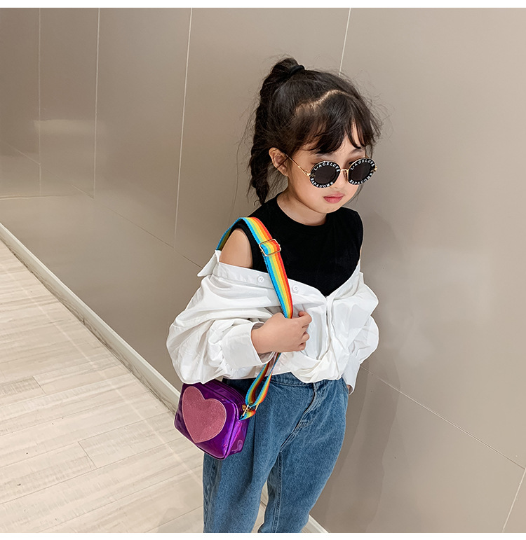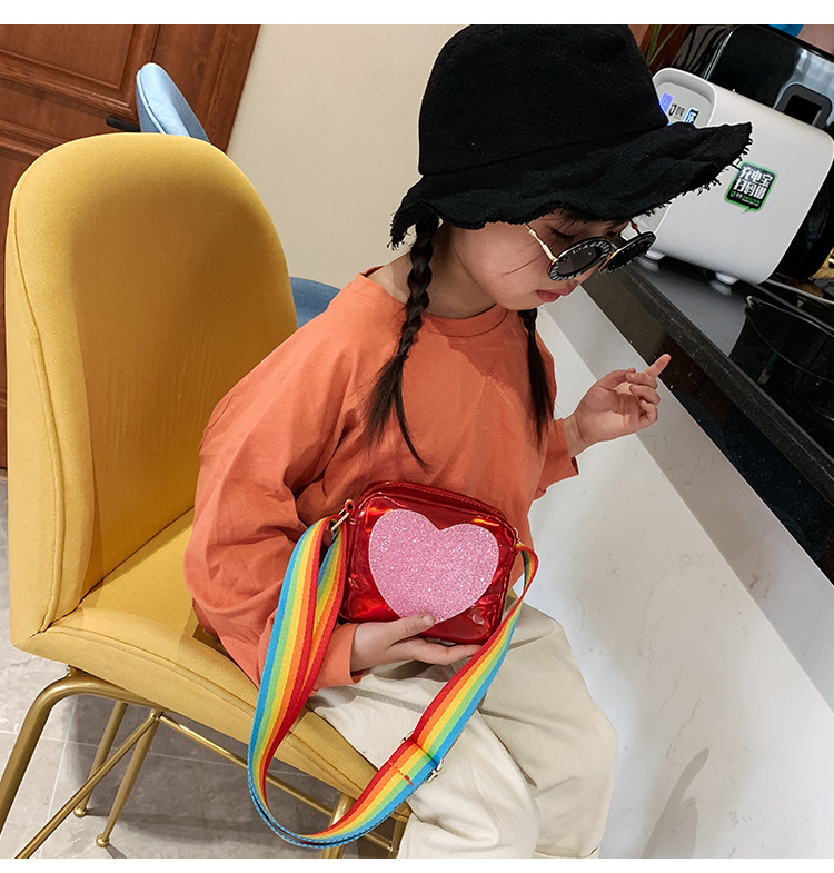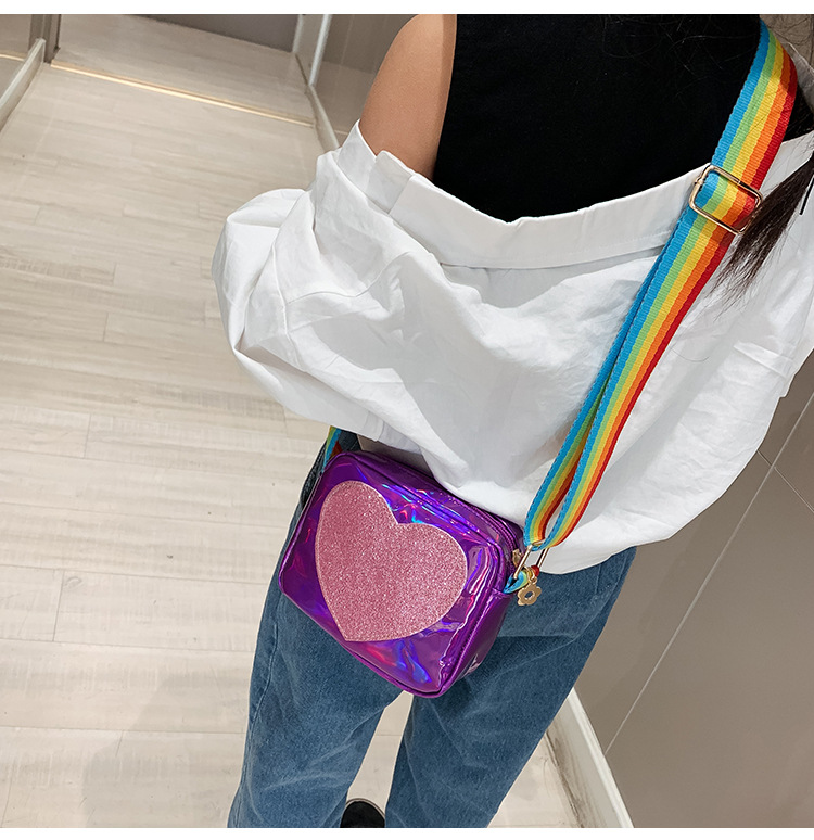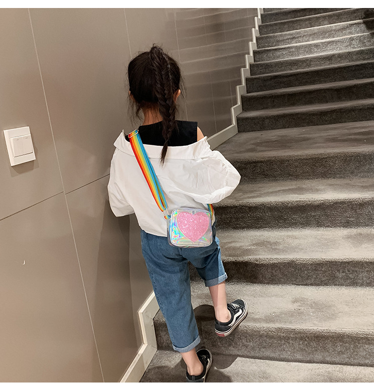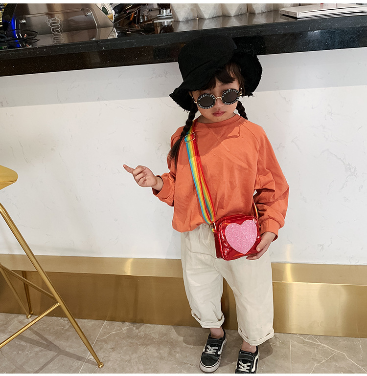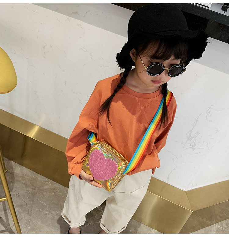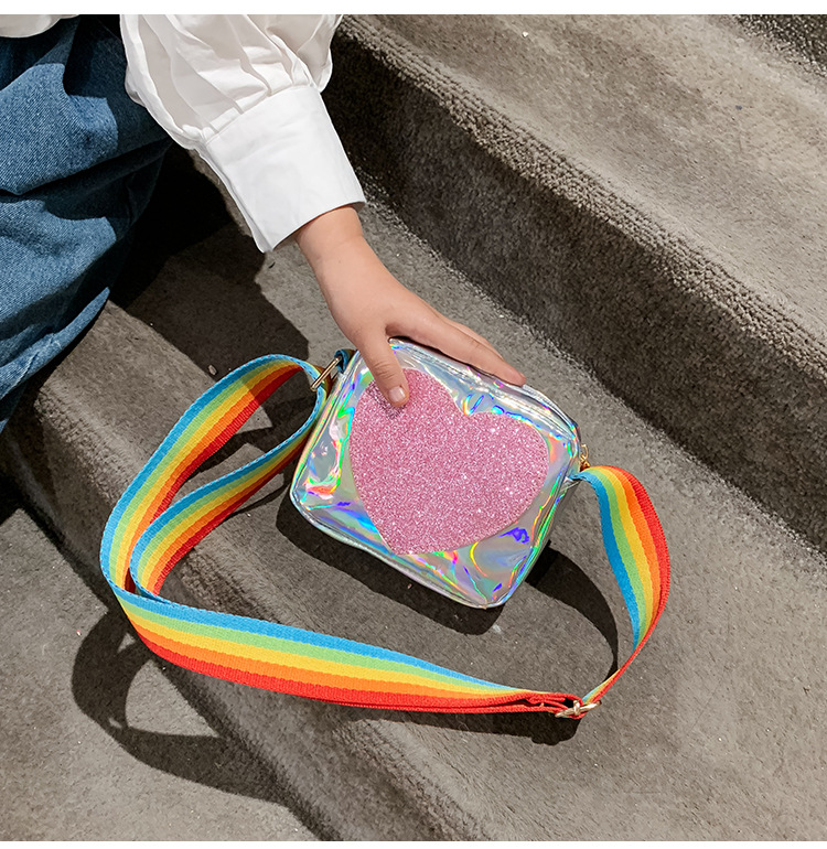 한국 스타일 어린이 미니 가방 레이저 Pu 광택 복숭아 심장 어깨 메신저 가방 소녀의 여름 장식 동전 지갑스토어 가기