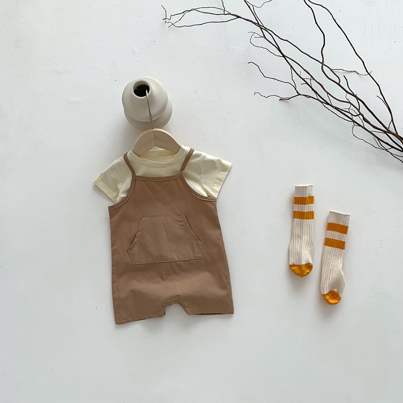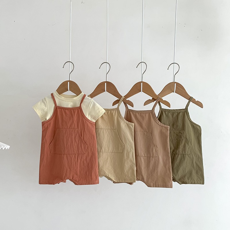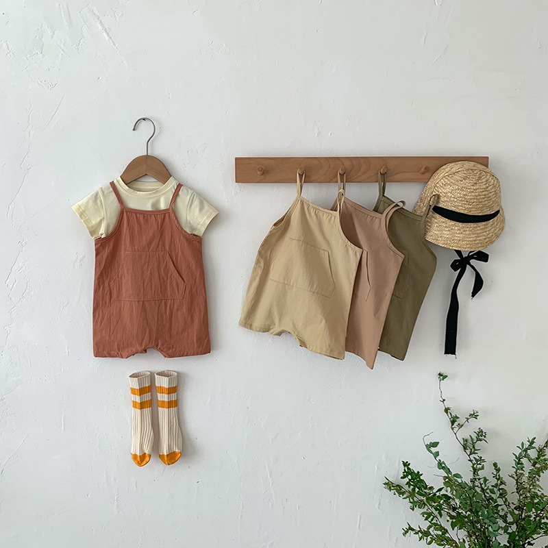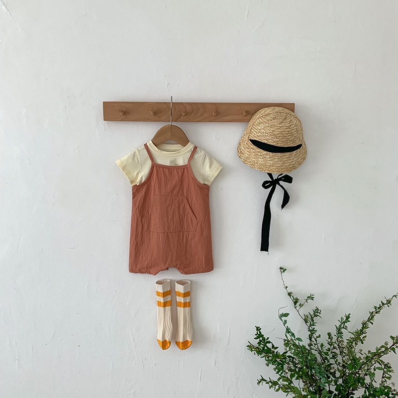 In 한국식 여름 옷 남자와 여자 아기 멜빵 티셔츠 등산 세트 투피스 아기 귀여운 원피스 멜빵 세트