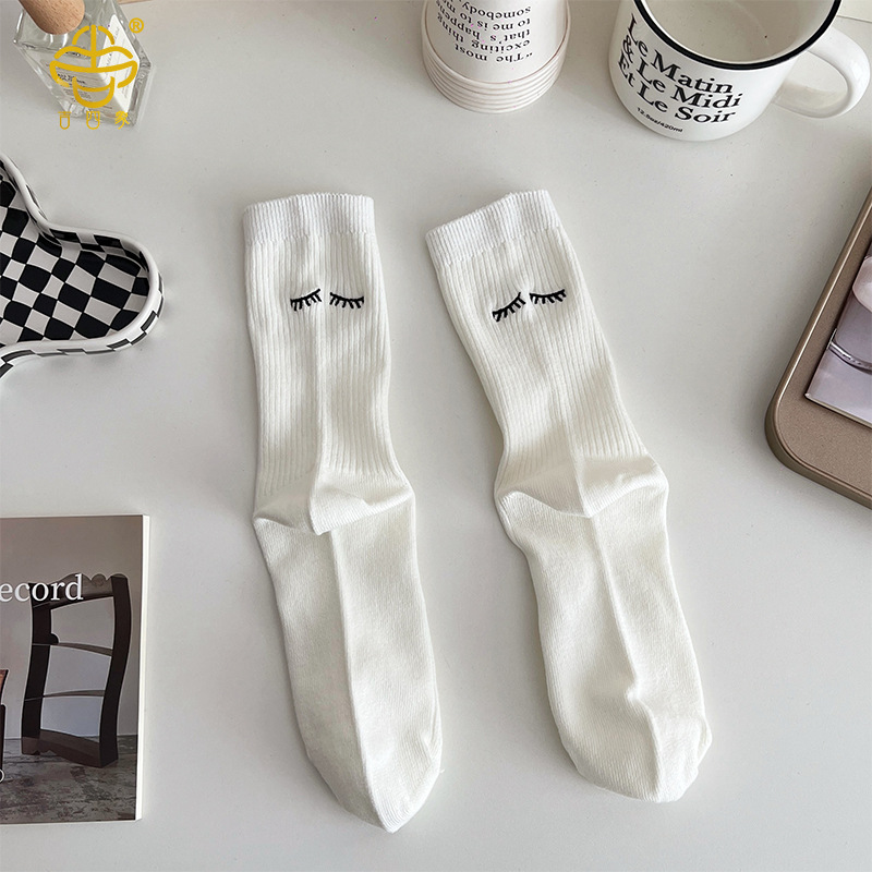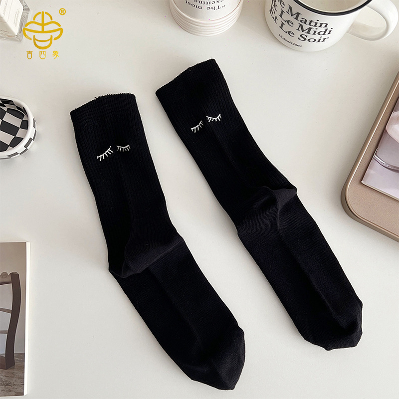 Ji Four 코끼리 양말 여성용 만화 자수 스마일 중간 길이 양말 빗질면 흑백 이중 바늘 여성 양말 긴 길이 쌓인 세련된 양말