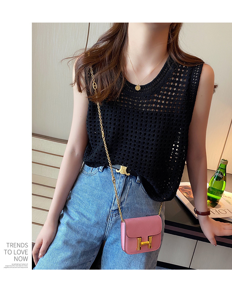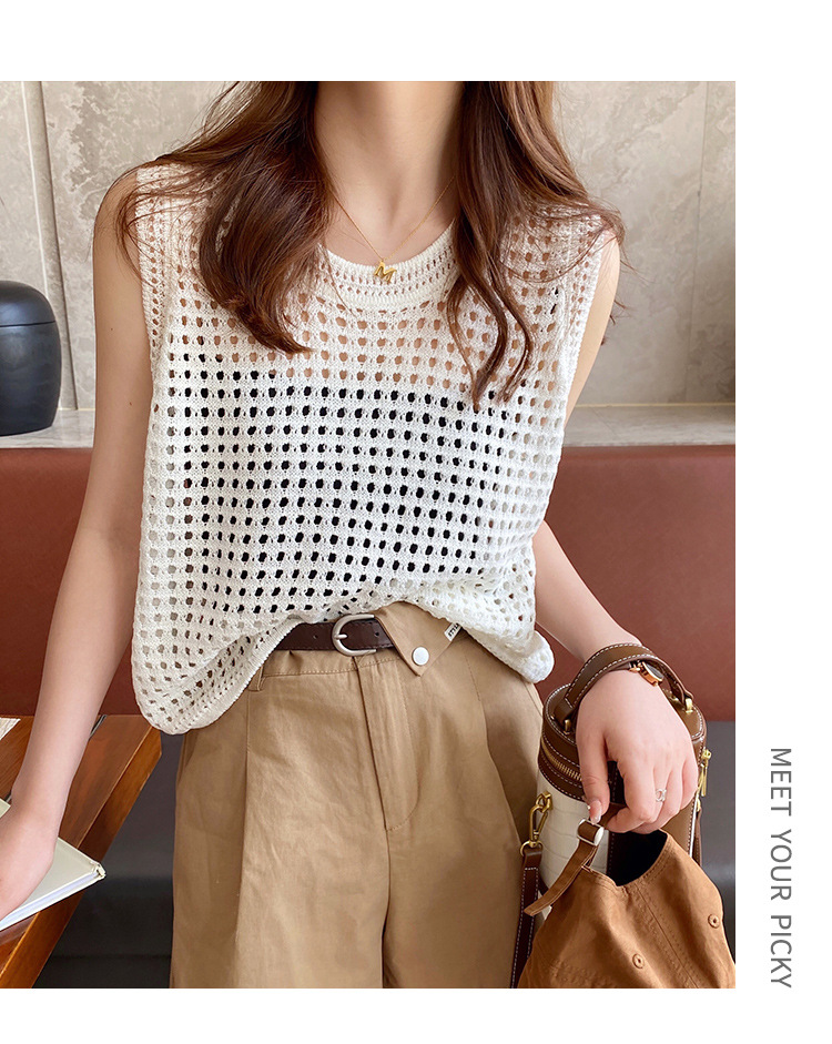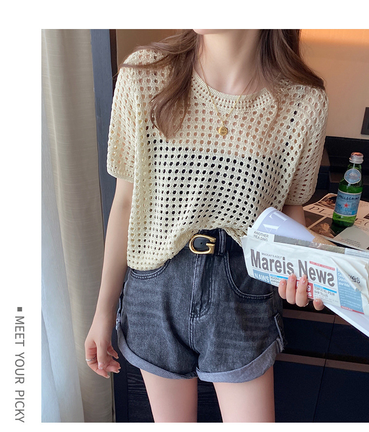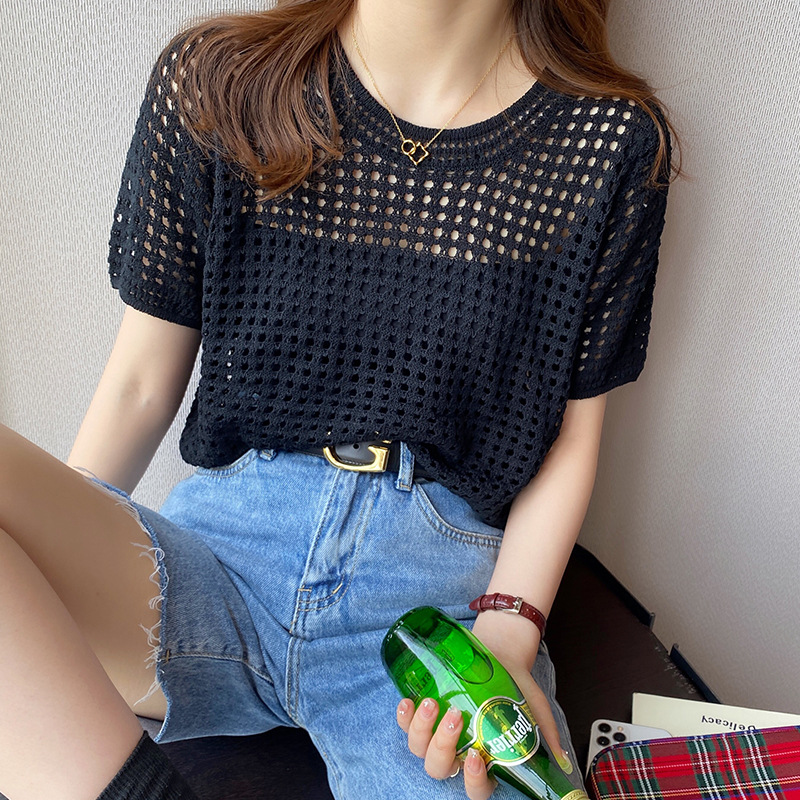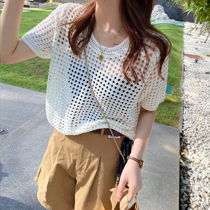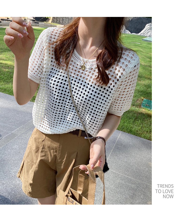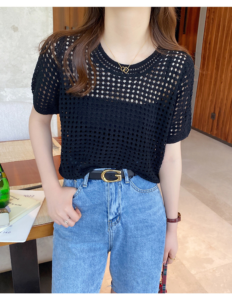 반팔 스웨터, 루즈한 라운드넥 아이스 실크 블라우스, 시크한 메쉬 스웨터