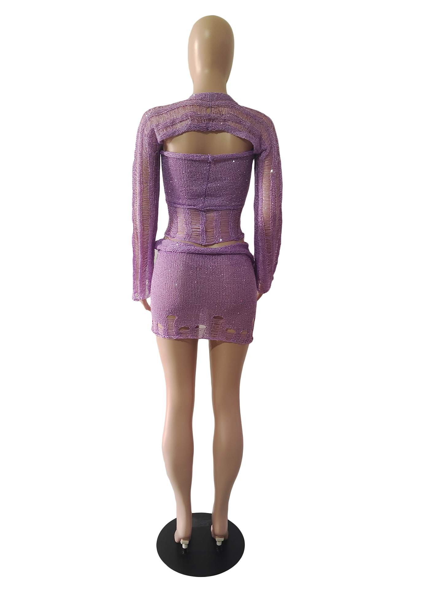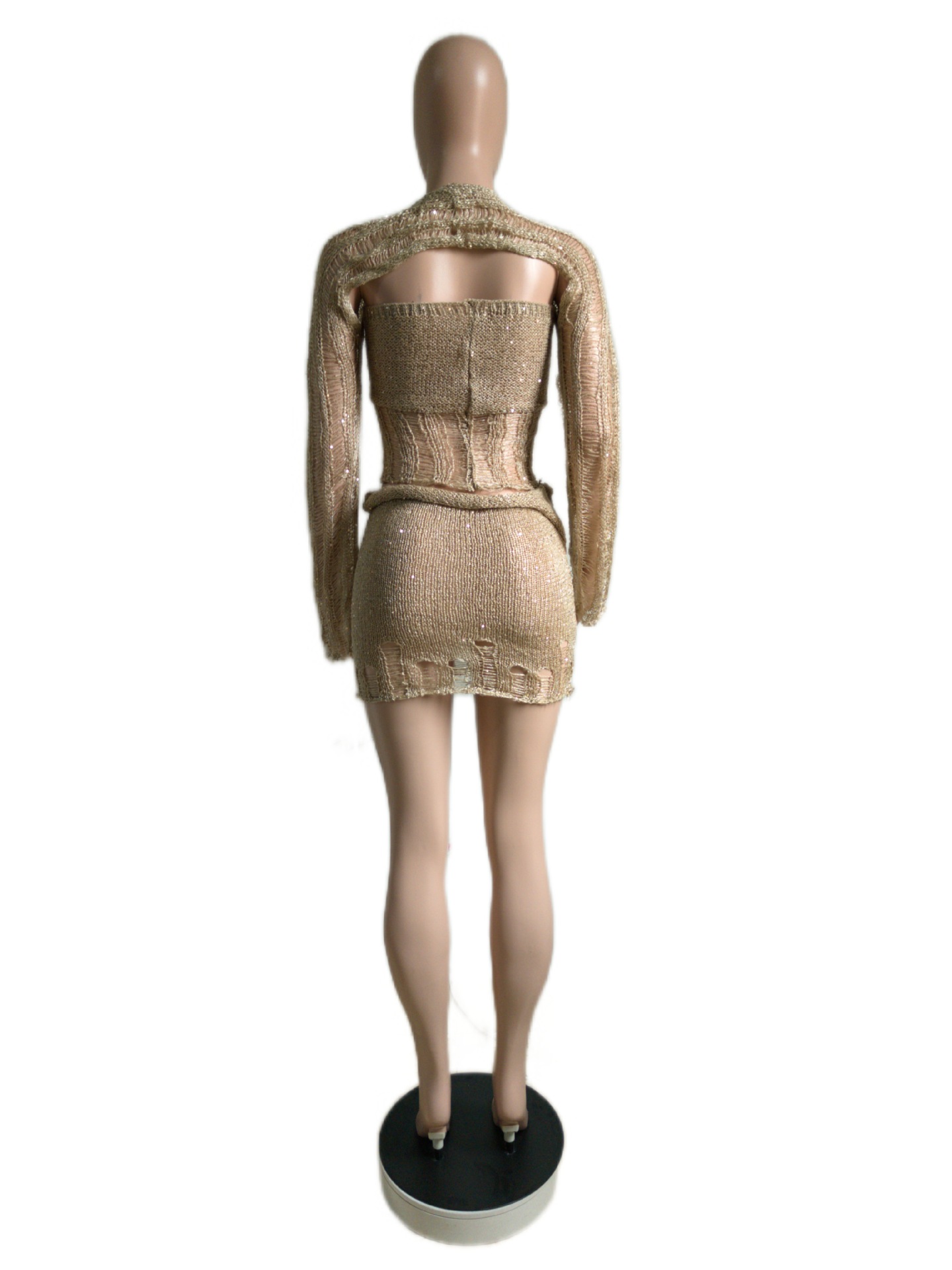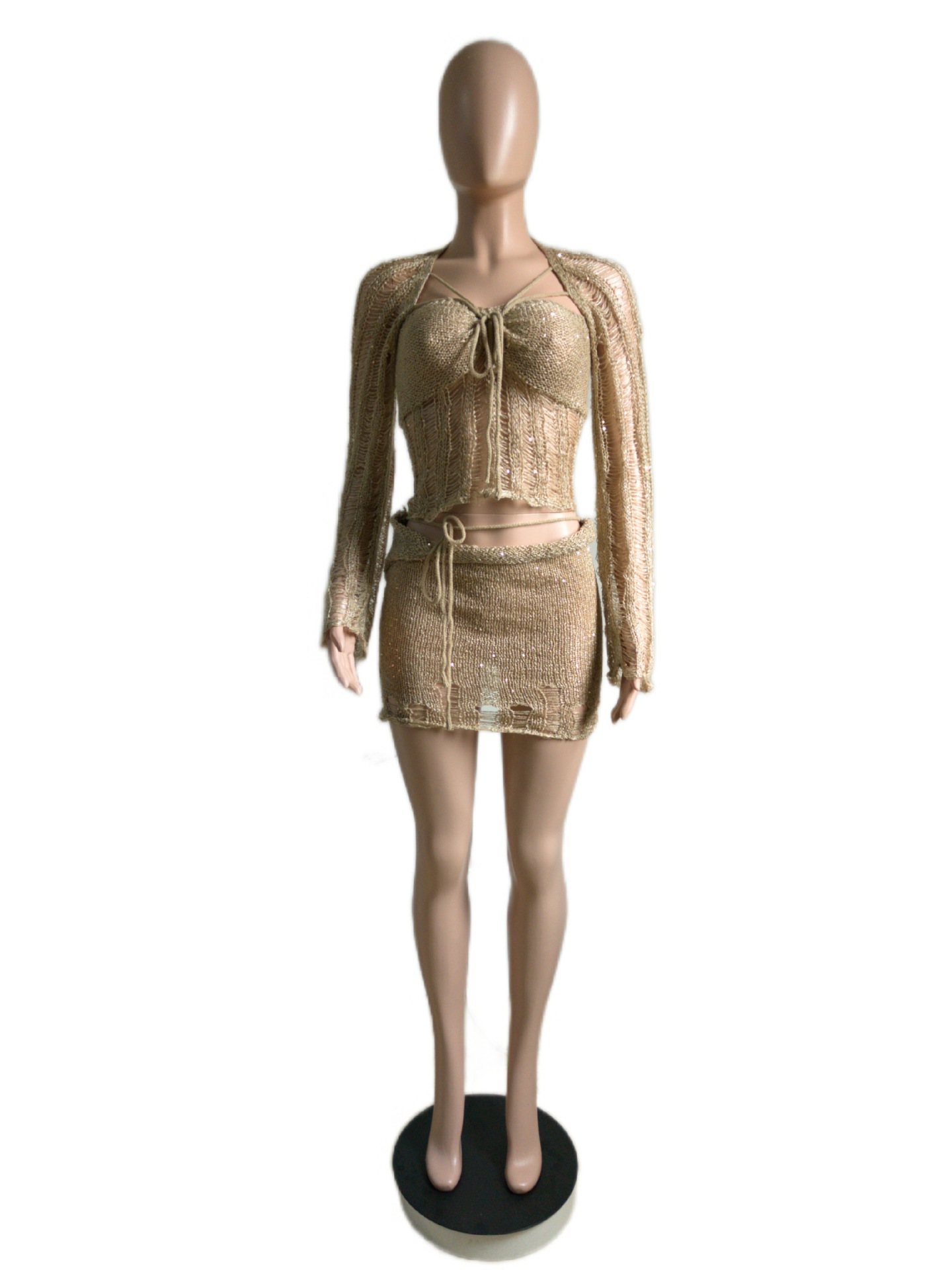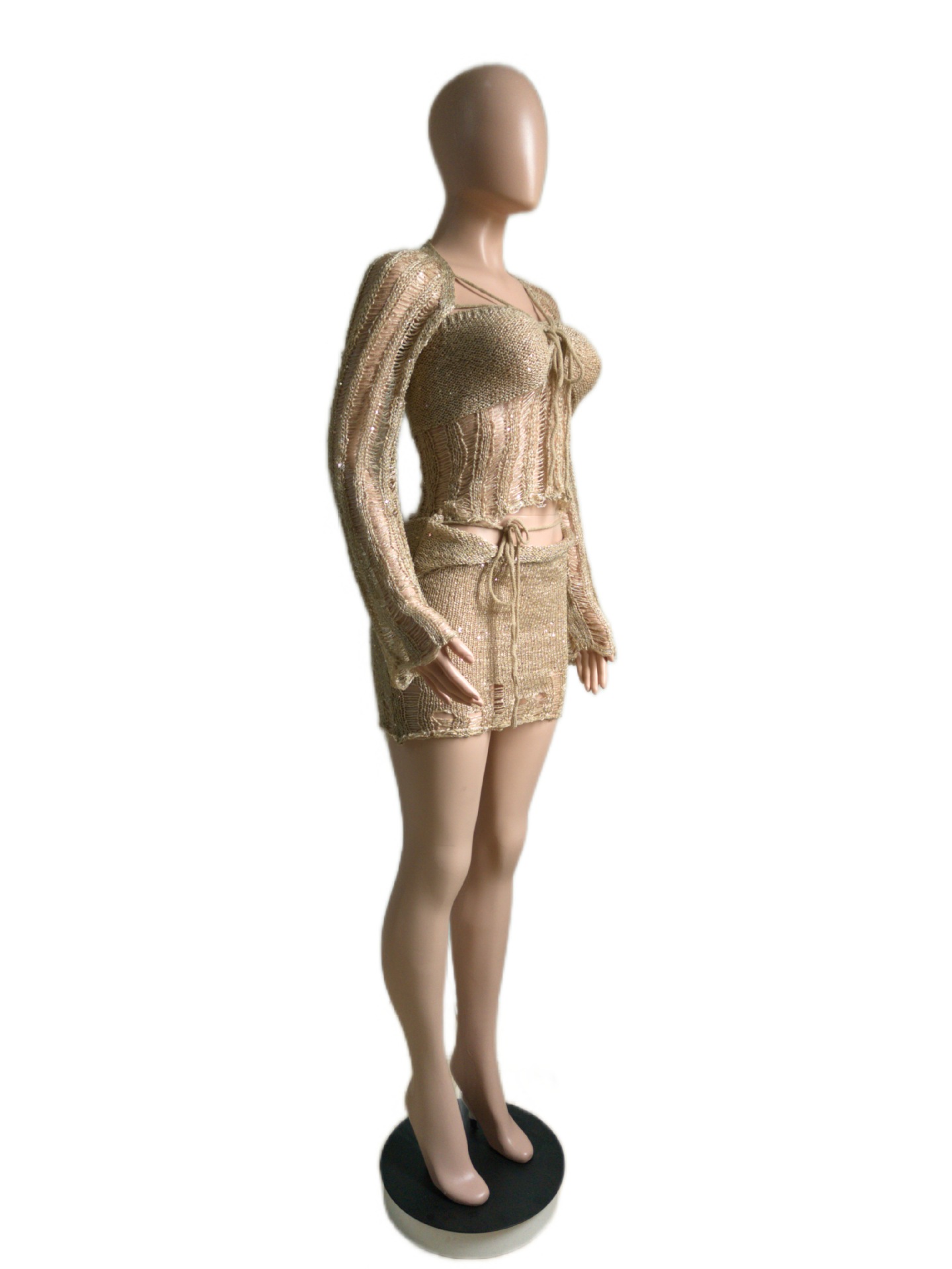 CN0288 유럽 및 미국 여성 의류 2023 새로운 독립 스테이션 AliExpress 스팽글 니트 스웨터 3 피스 세트 세트