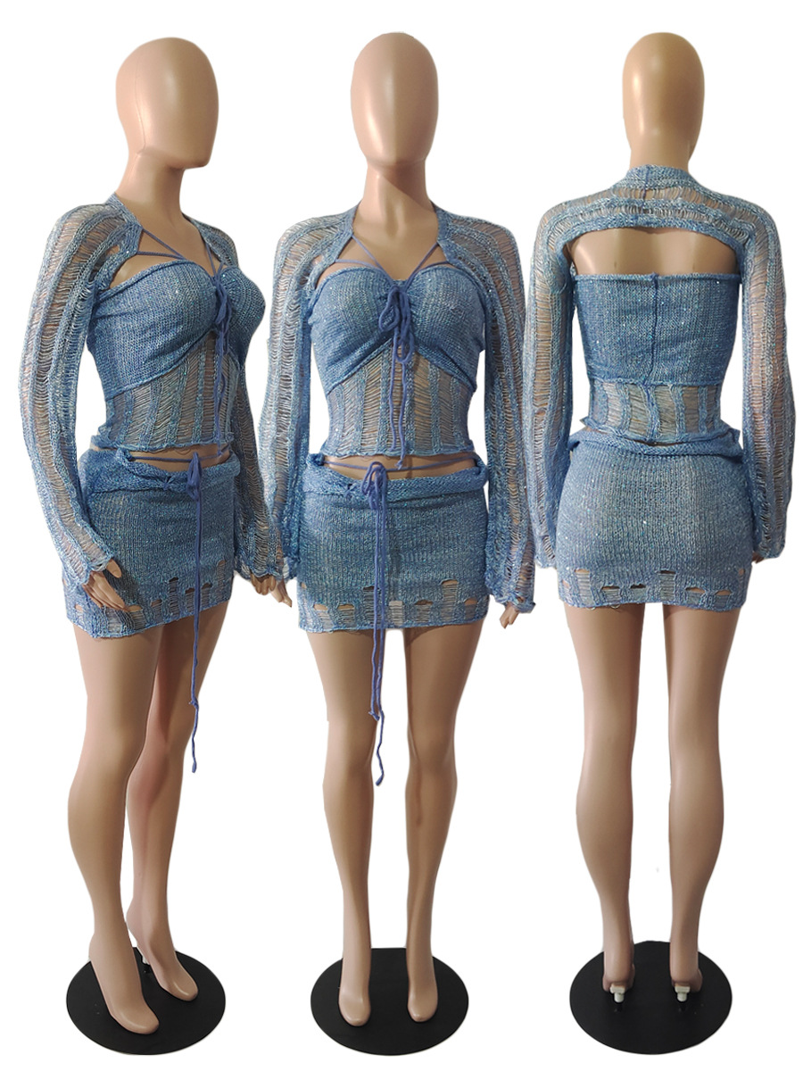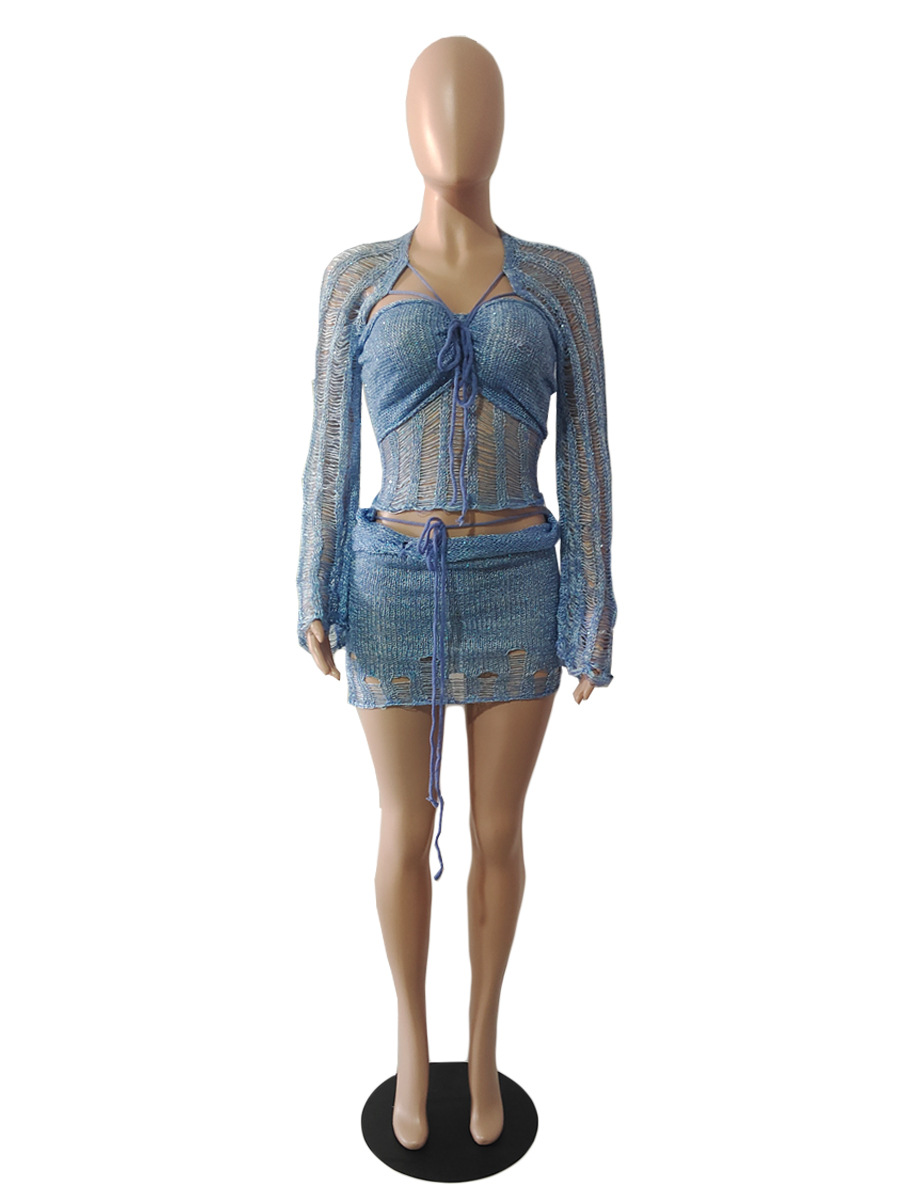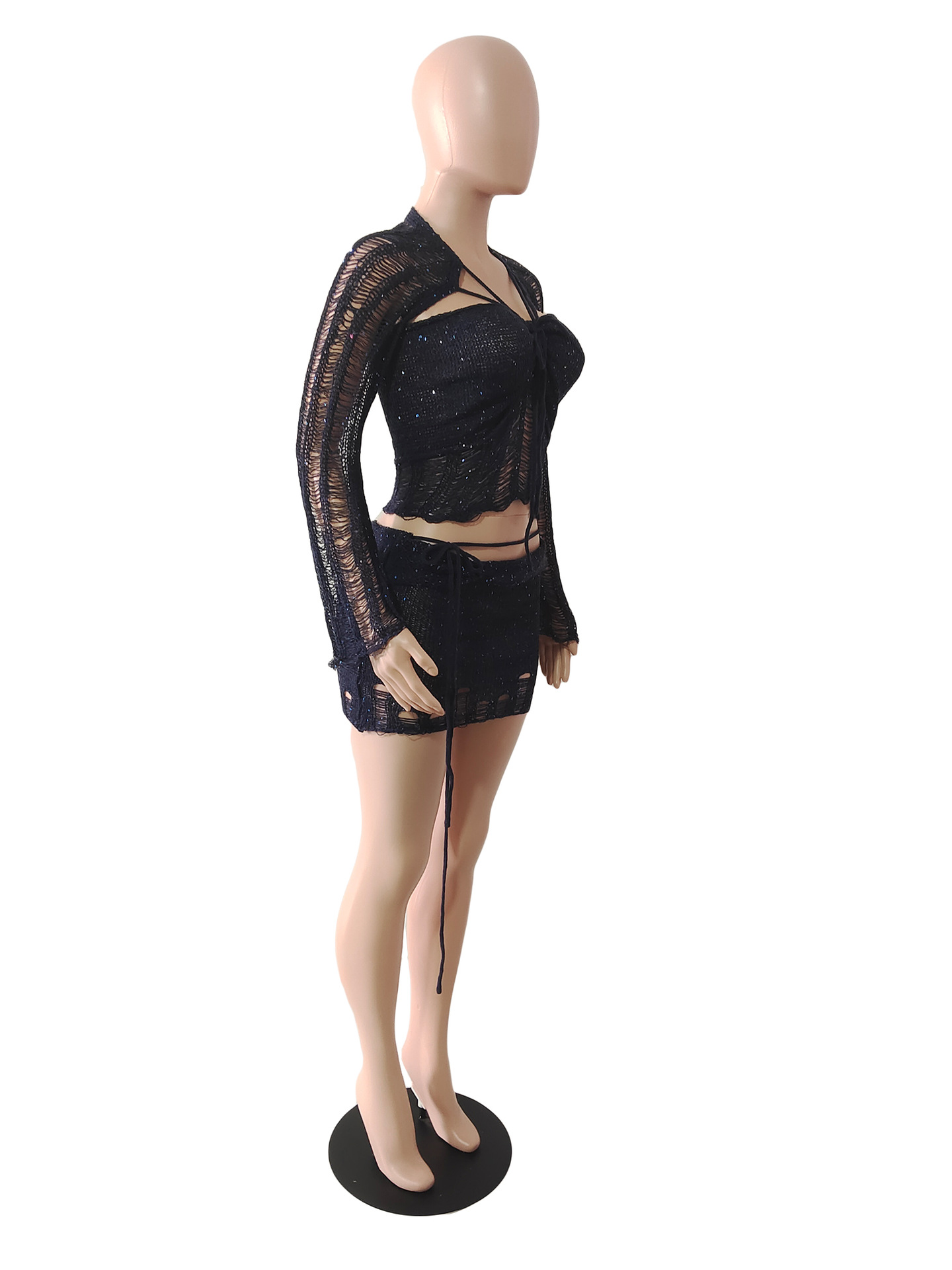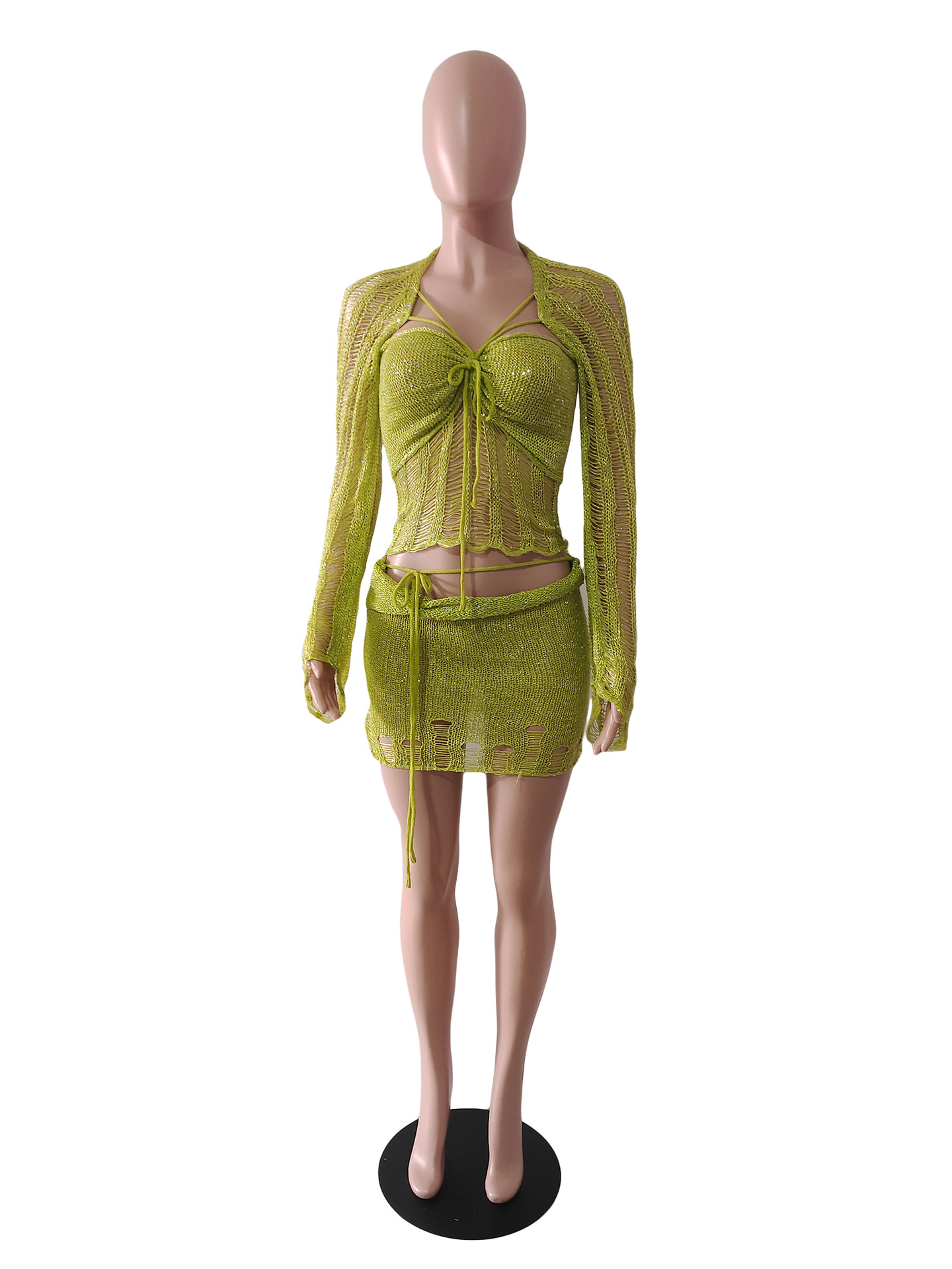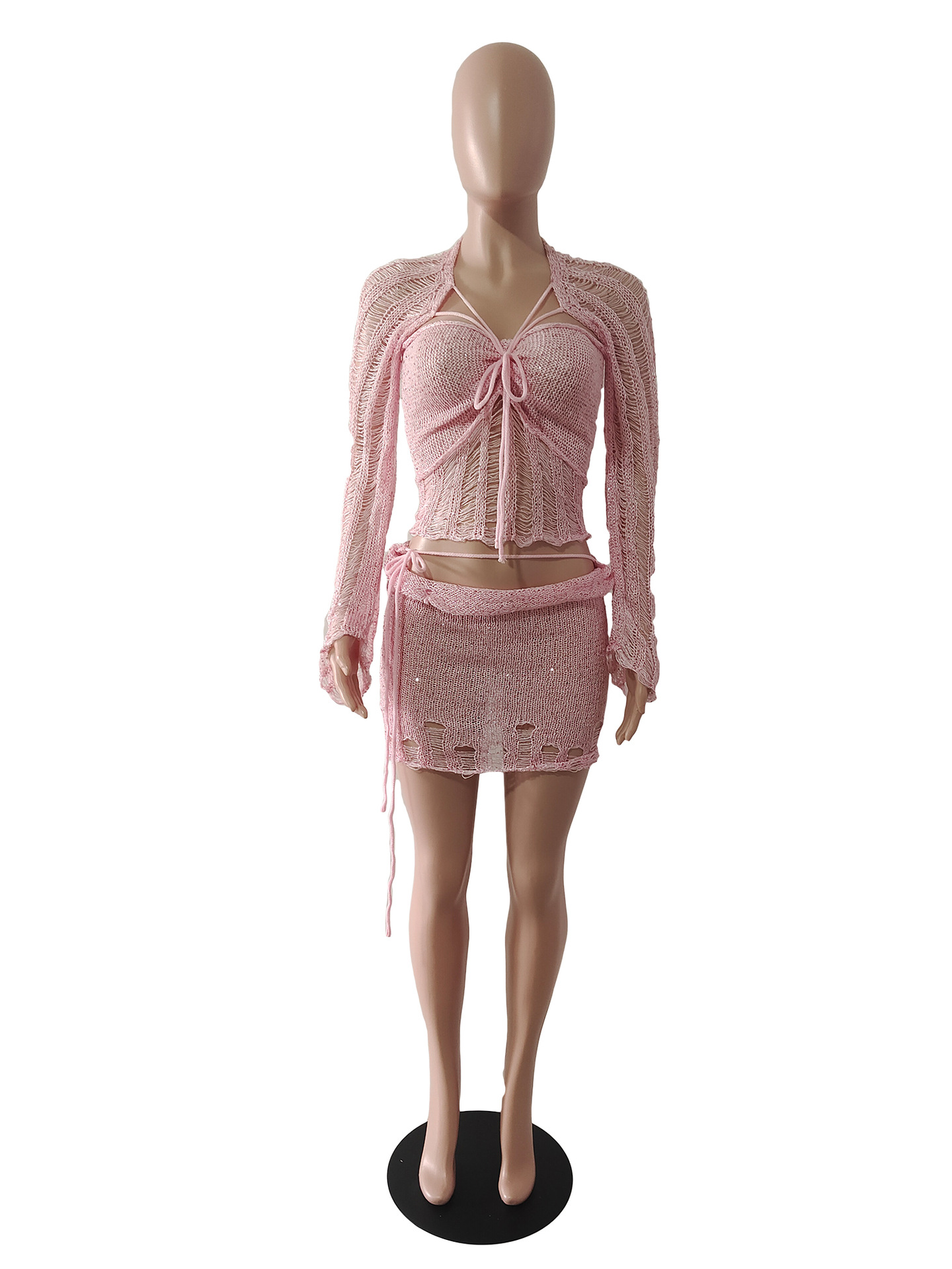 CN0288 유럽 및 미국 여성 의류 2023 새로운 독립 스테이션 AliExpress 스팽글 니트 스웨터 3 피스 세트 세트