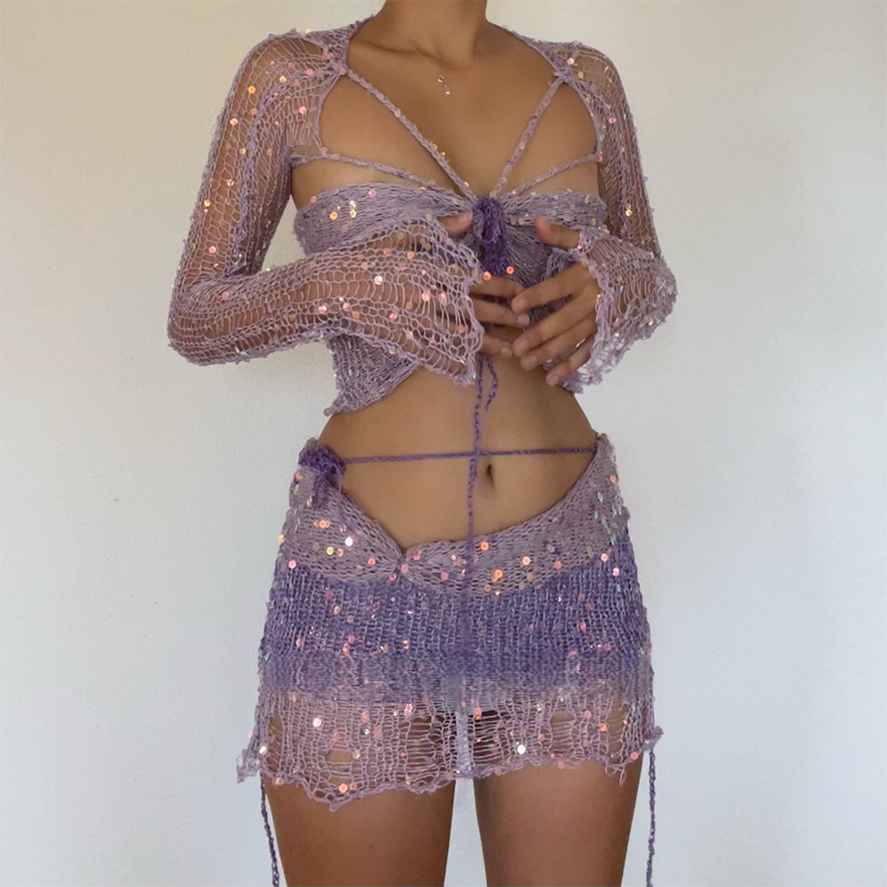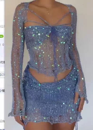 CN0288 유럽 및 미국 여성 의류 2023 새로운 독립 스테이션 AliExpress 스팽글 니트 스웨터 3 피스 세트 세트스토어 가기