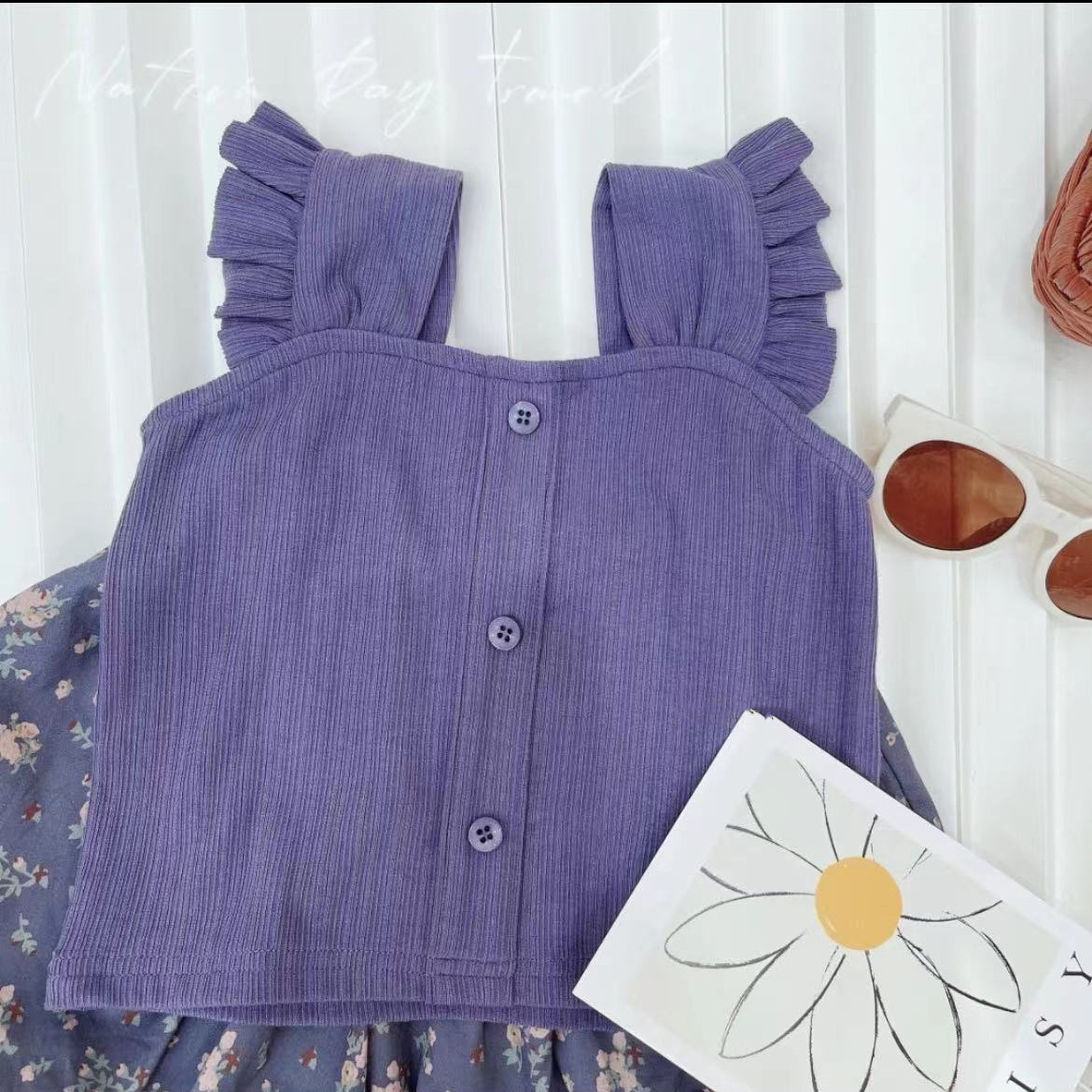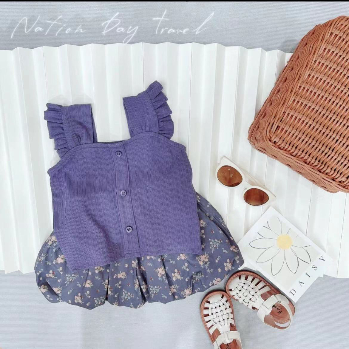 女童背心套装2023新款洋气飞袖上衣吊带短款花苞裤两件套碎花韩版