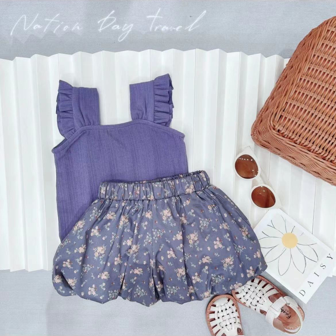 여아 조끼 세트 2023 새로운 스타일 플라잉 슬리브 탑 스트랩 짧은 꽃 봉오리 바지 투피스 세트 꽃무늬 한국 스타일스토어 가기