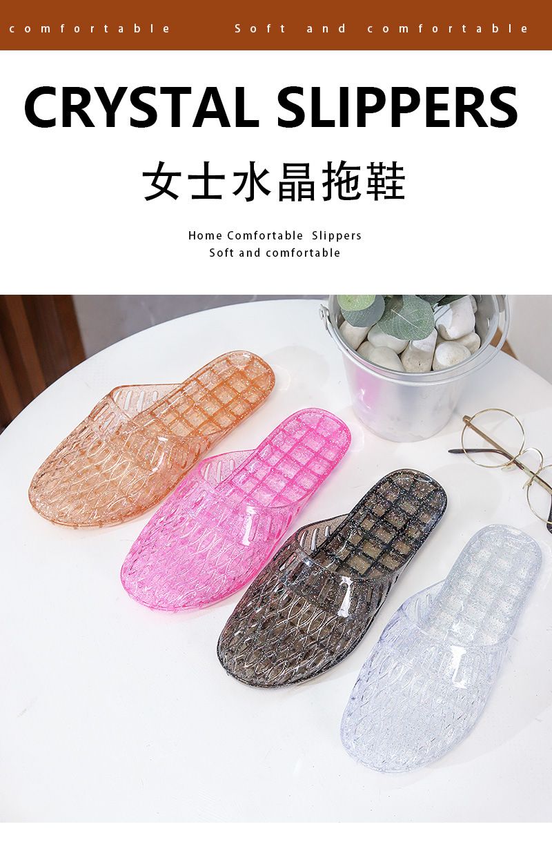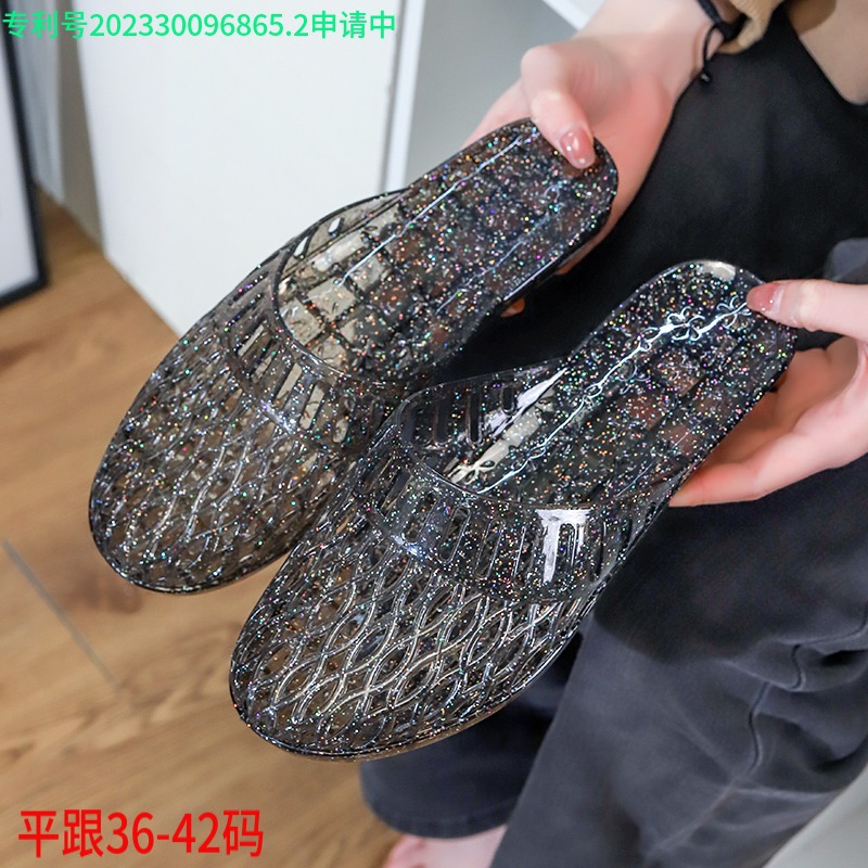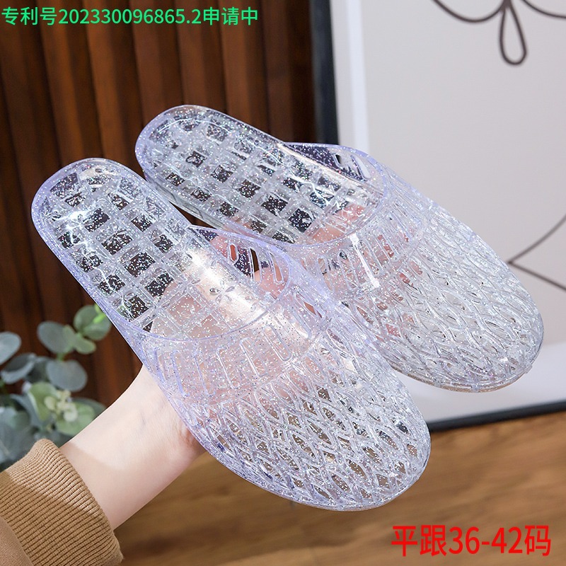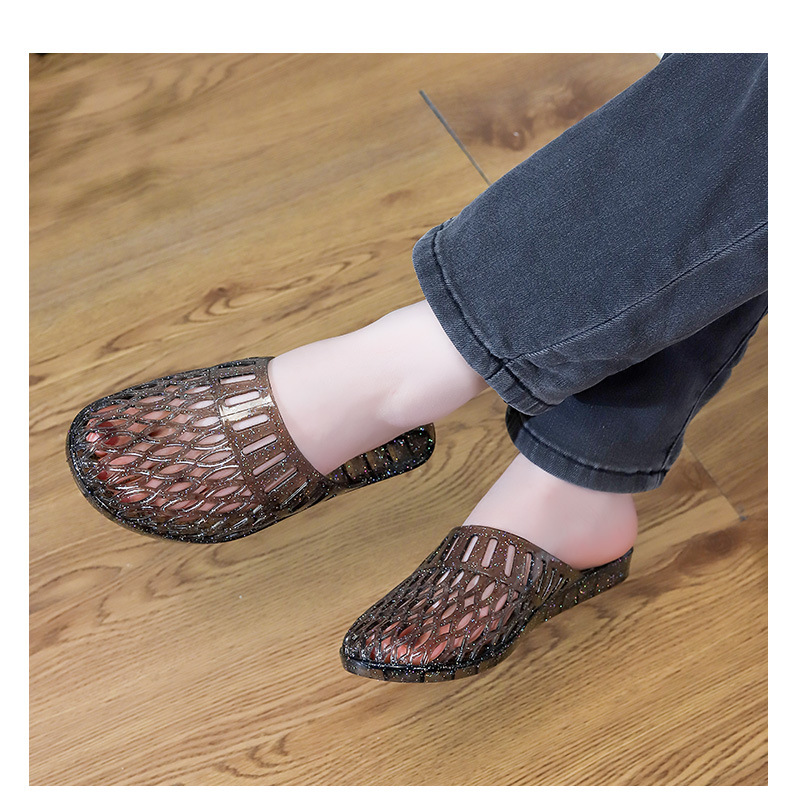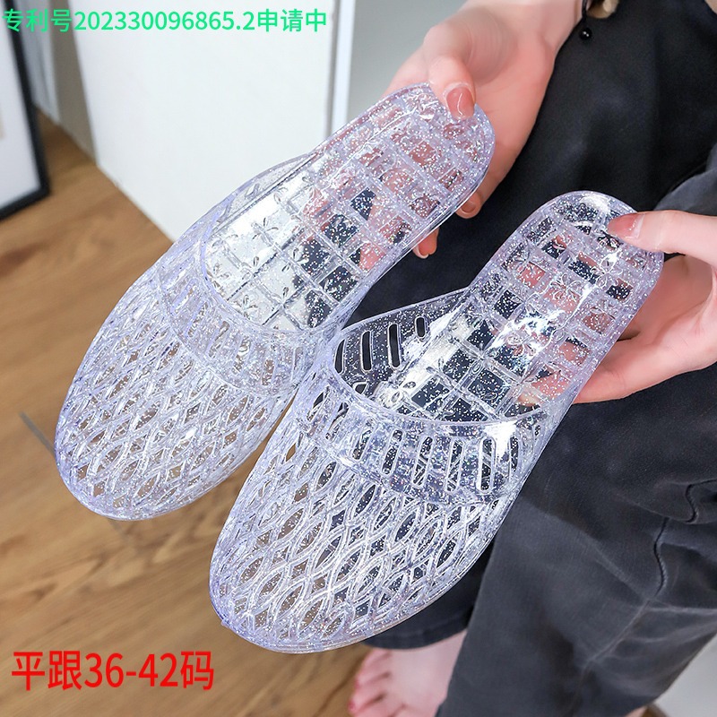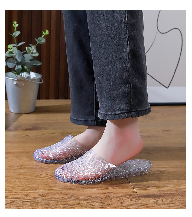 플랫 크리스탈 앞코가 막힌 반슬리퍼 여성용 투명 젤리 플라스틱 소재 중공 미끄럼 방지 욕실 실내외 여름용