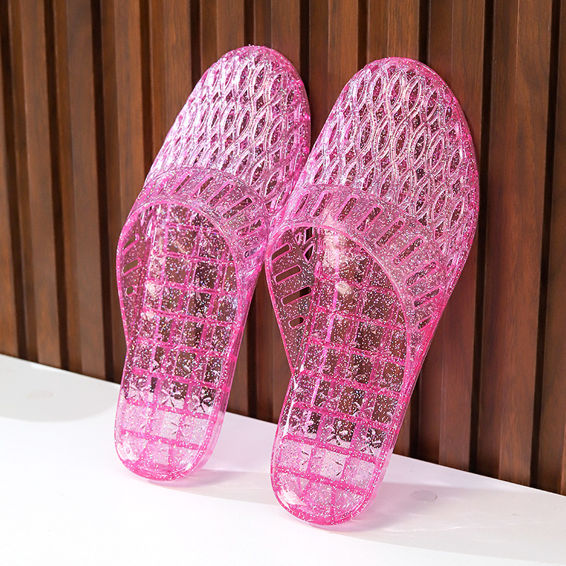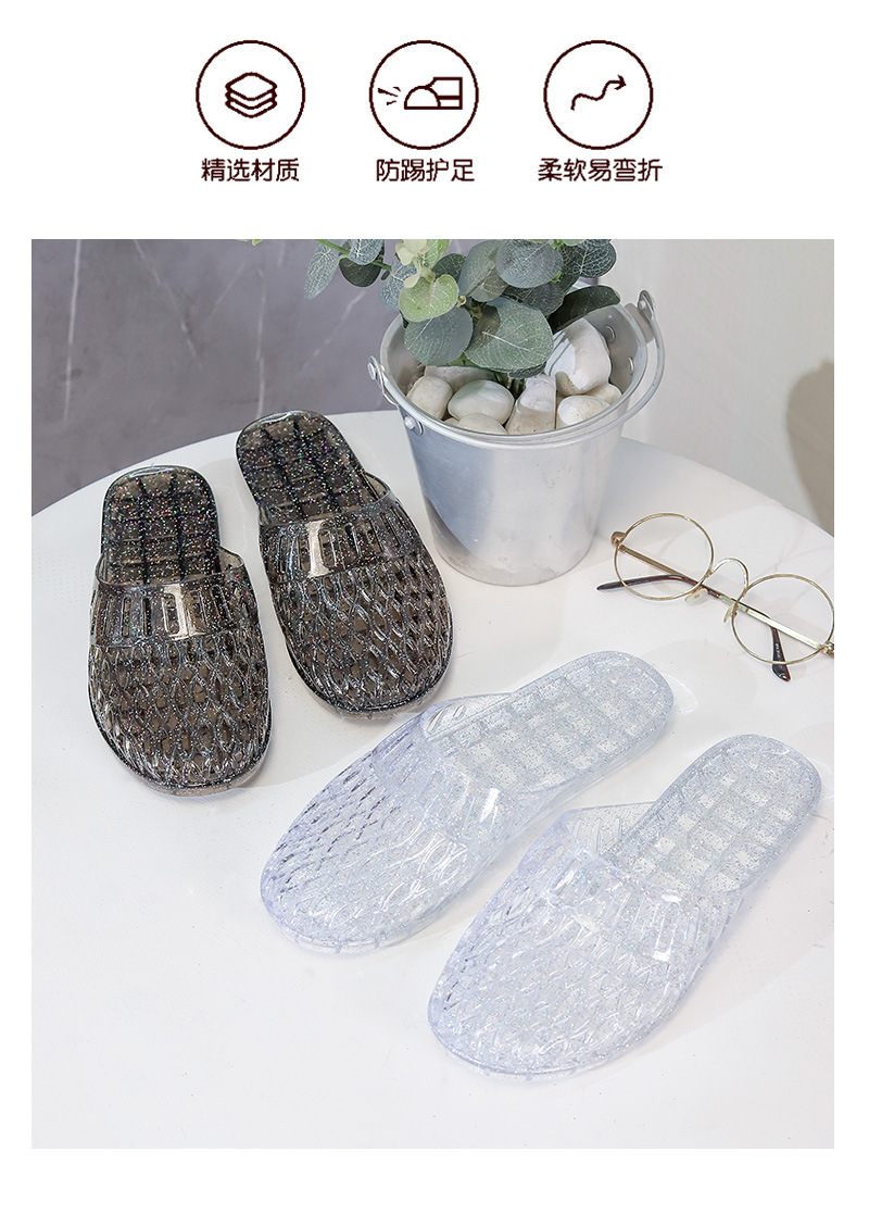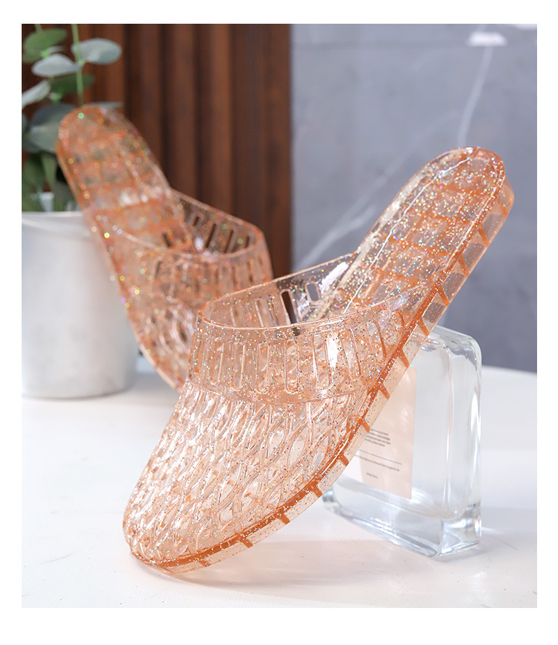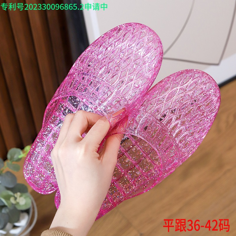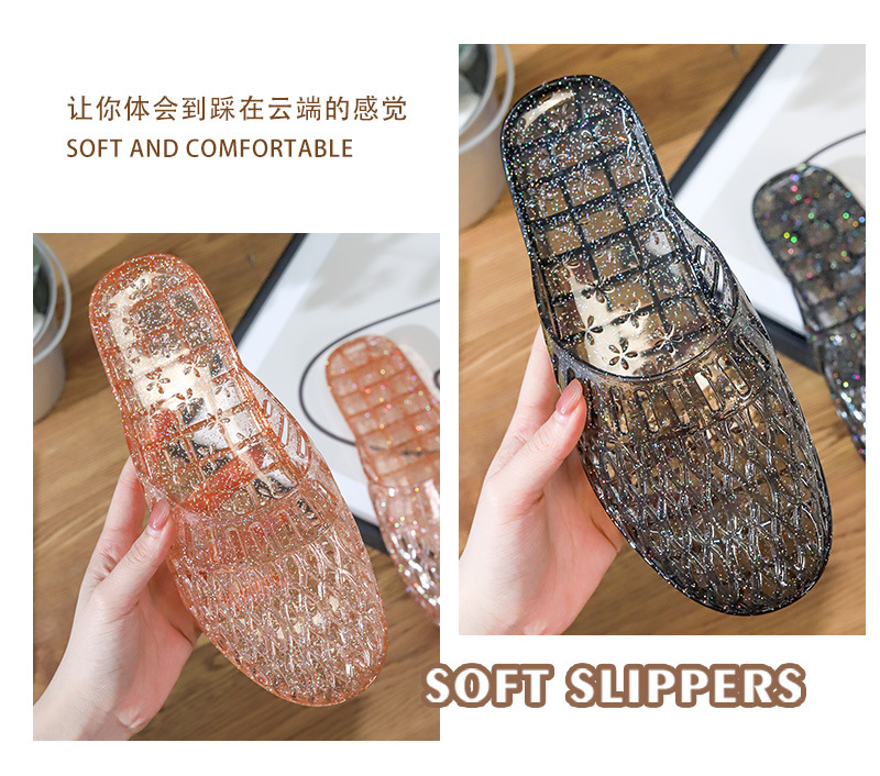 플랫 크리스탈 앞코가 막힌 반슬리퍼 여성용 투명 젤리 플라스틱 소재 중공 미끄럼 방지 욕실 실내외 여름용