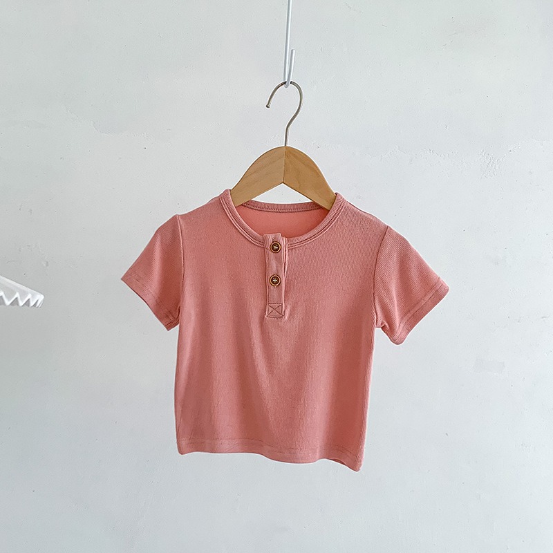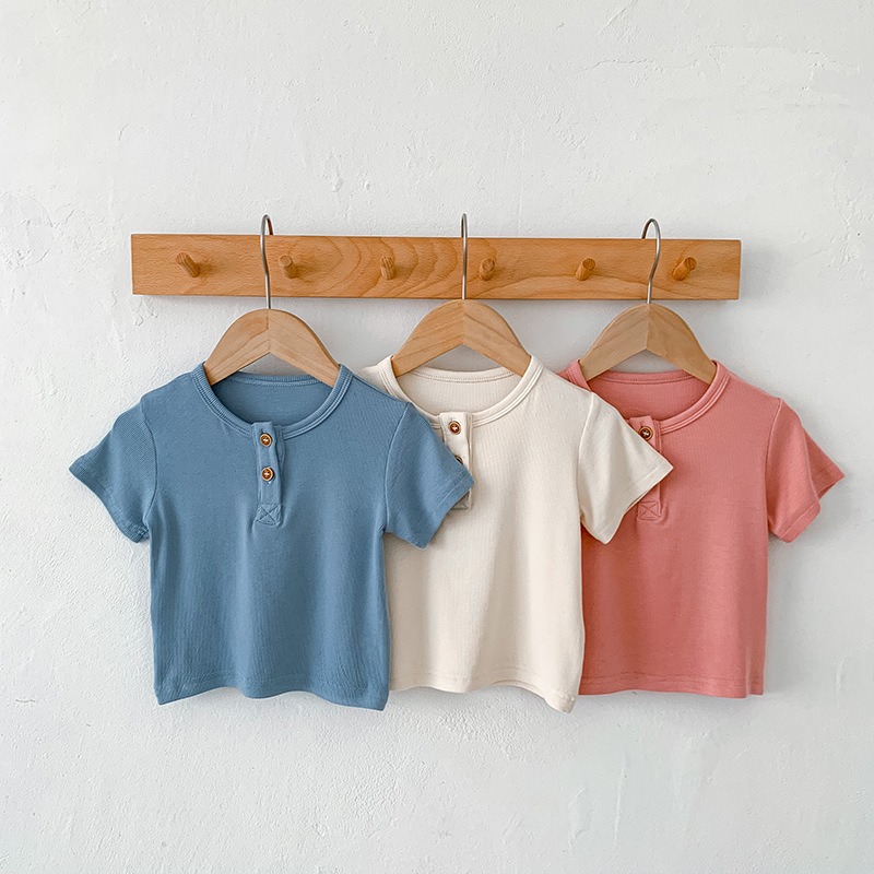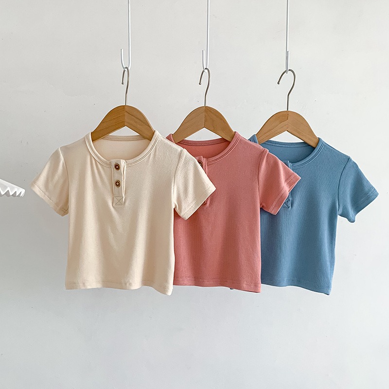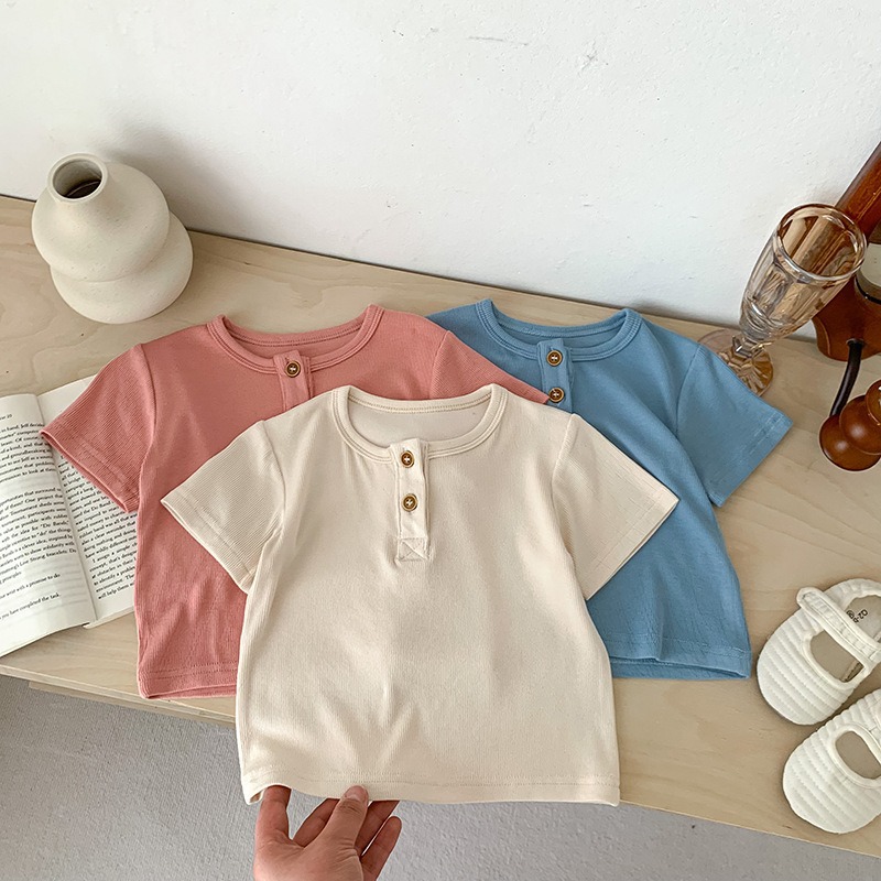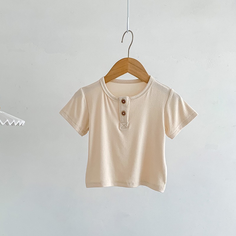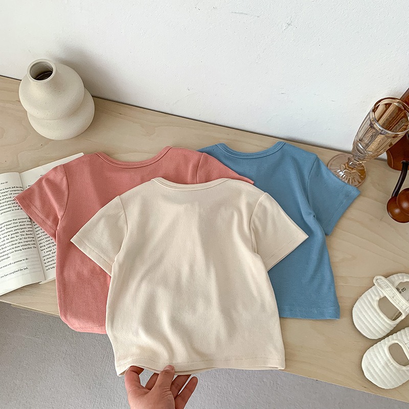 2024 여름 아기 반팔 티셔츠 얇은 아기 크루 넥 반소매 탑 어린이 솔리드 컬러 올매치 베이스 셔츠 트렌디스토어 가기