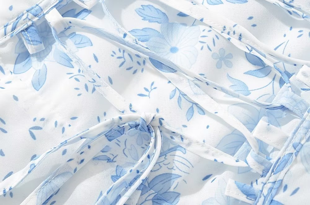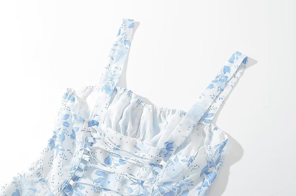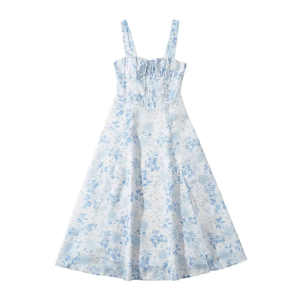 프렌치 빈티지 로우 넥 와이드 스트랩 슬링 원피스 졸라매는 끈 허리 슬리밍 롱 스커트 사이드 슬릿 프린트 스커트