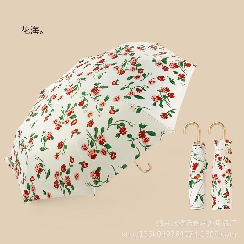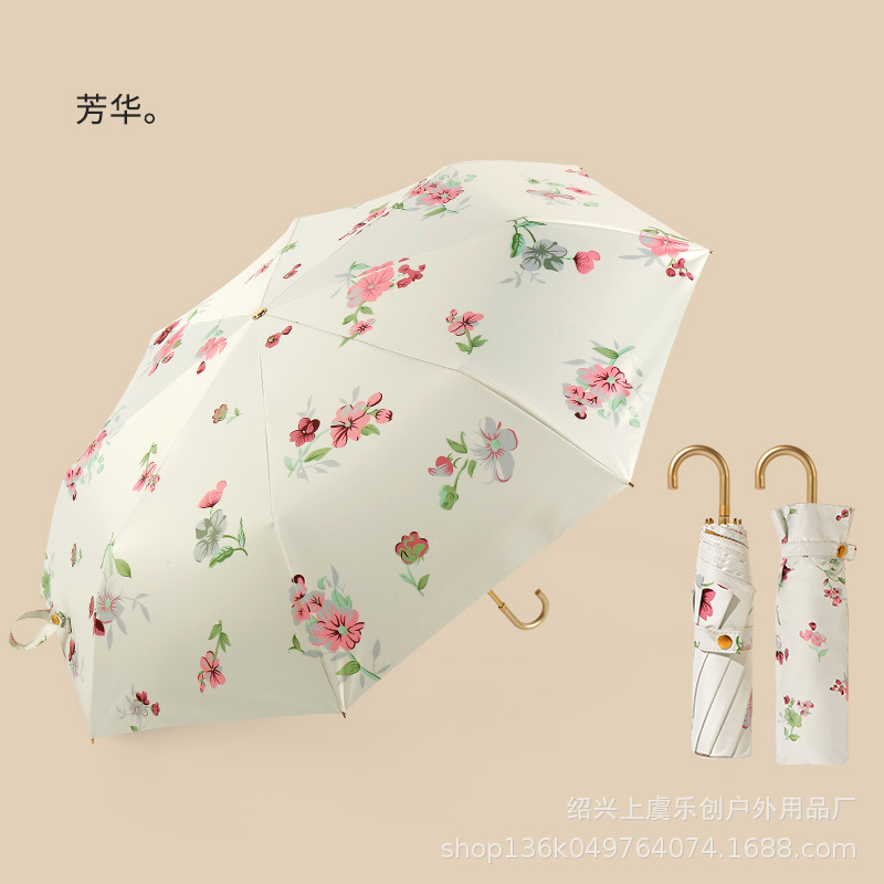 3 배 컬러 접착제 울트라 라이트 골드 후크 곡선 핸들 우산 태양 보호 자외선 접이식 복고풍 여성 이중 사용 태양 우산