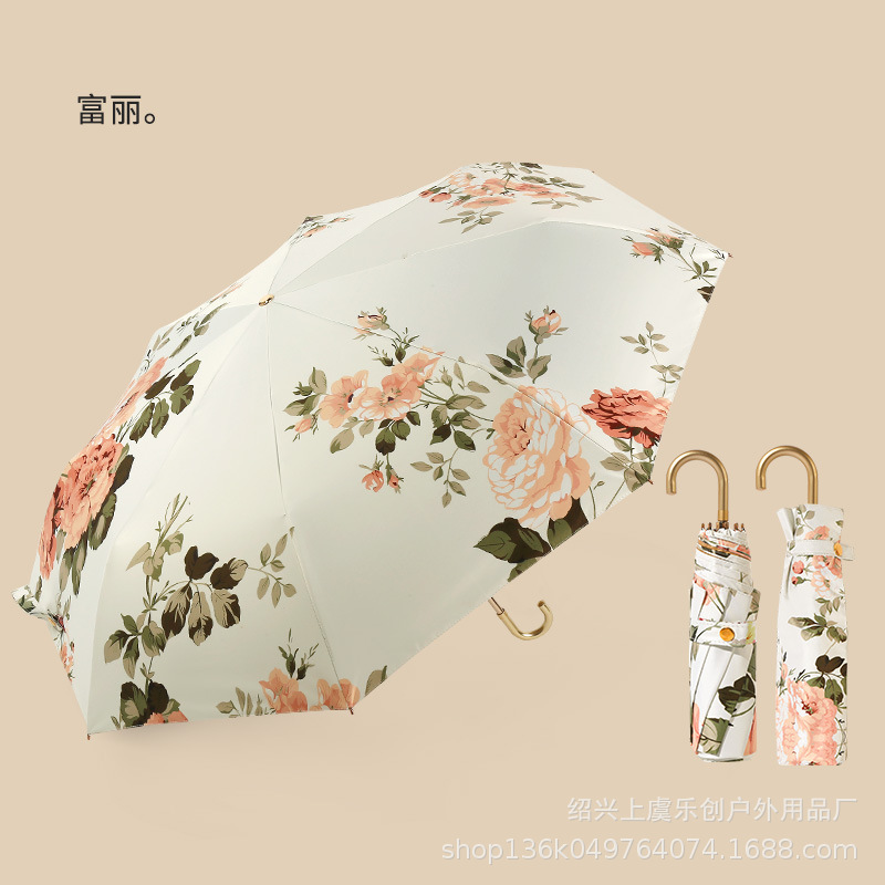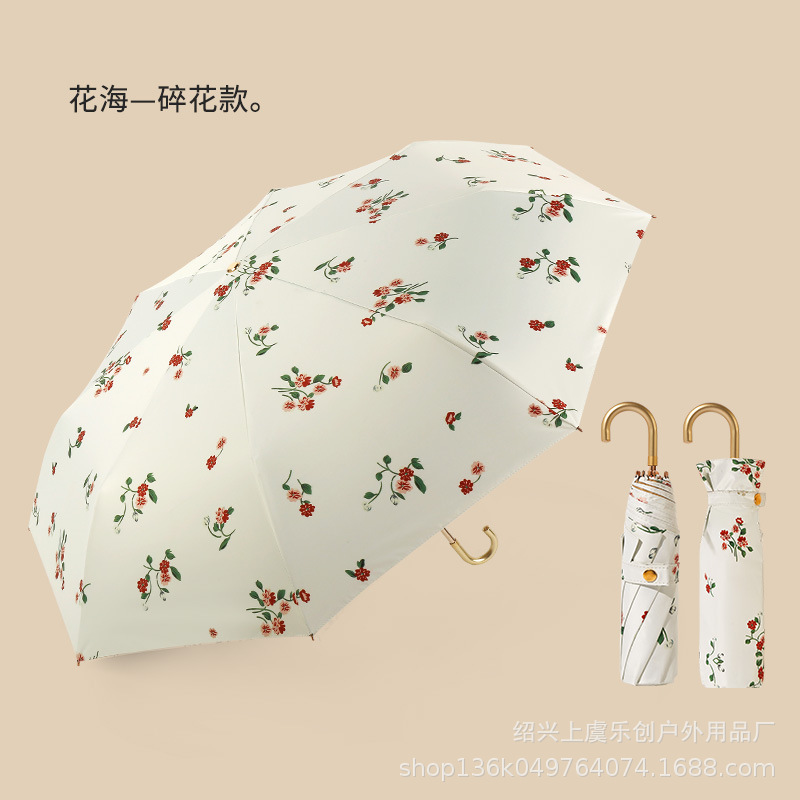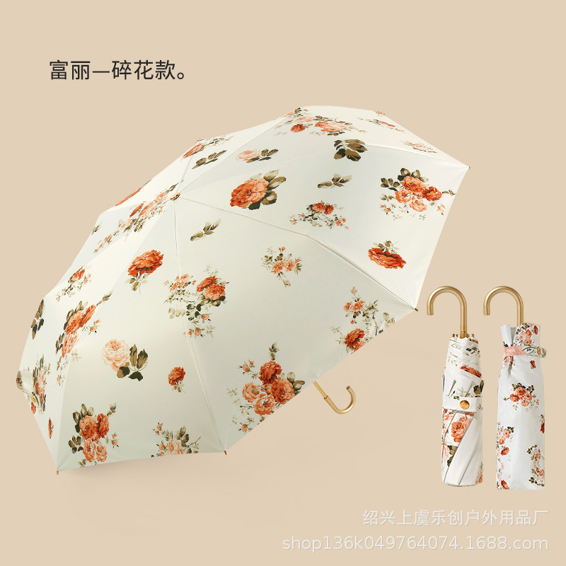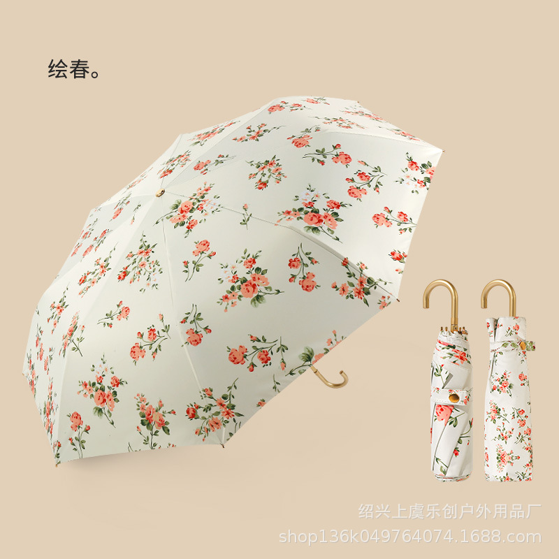 3 배 컬러 접착제 울트라 라이트 골드 후크 곡선 핸들 우산 태양 보호 자외선 접이식 복고풍 여성 이중 사용 태양 우산스토어 가기