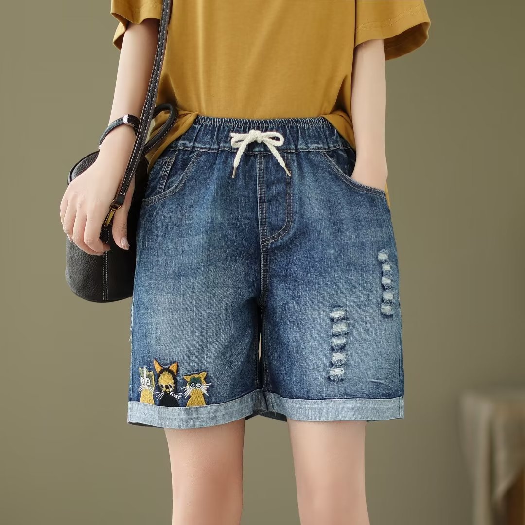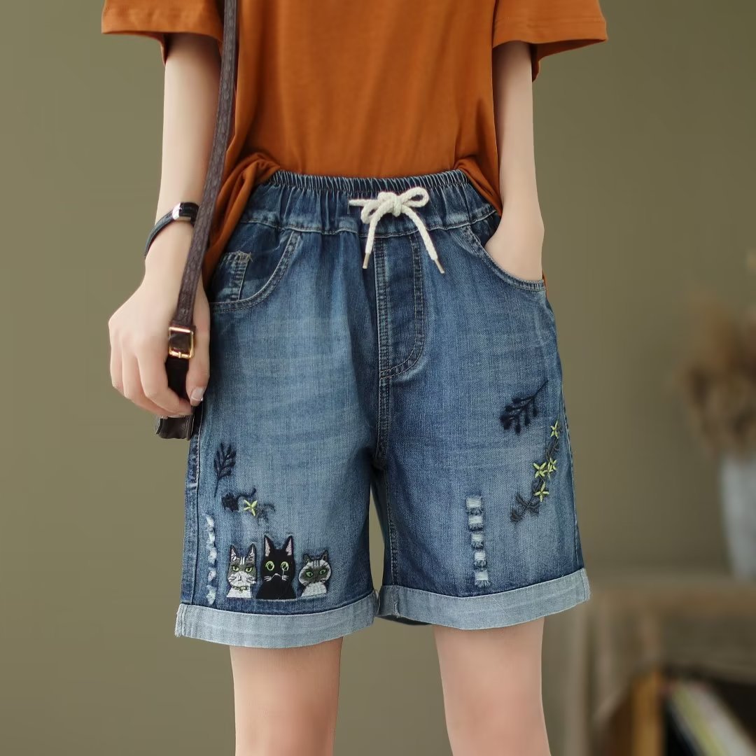 일본식 데님 반바지 여자의 여름 얇은 느슨한 슬리밍 빈티지 캐주얼 자수 트리플 바지 와이드 레그 팬츠스토어 가기