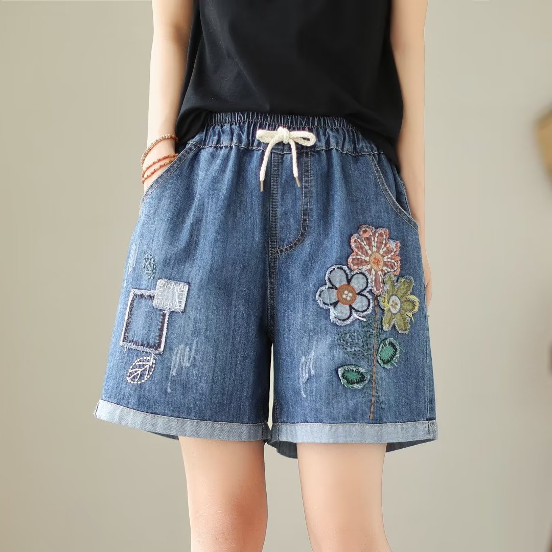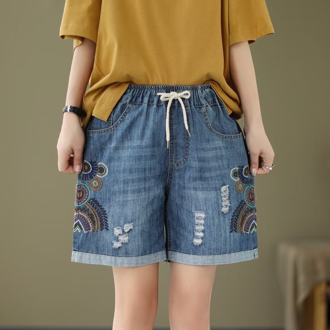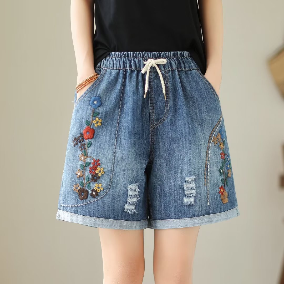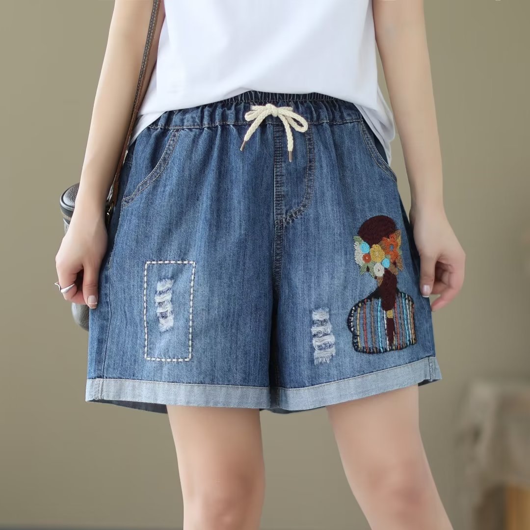 일본식 데님 반바지 여자의 여름 얇은 느슨한 슬리밍 빈티지 캐주얼 자수 트리플 바지 와이드 레그 팬츠