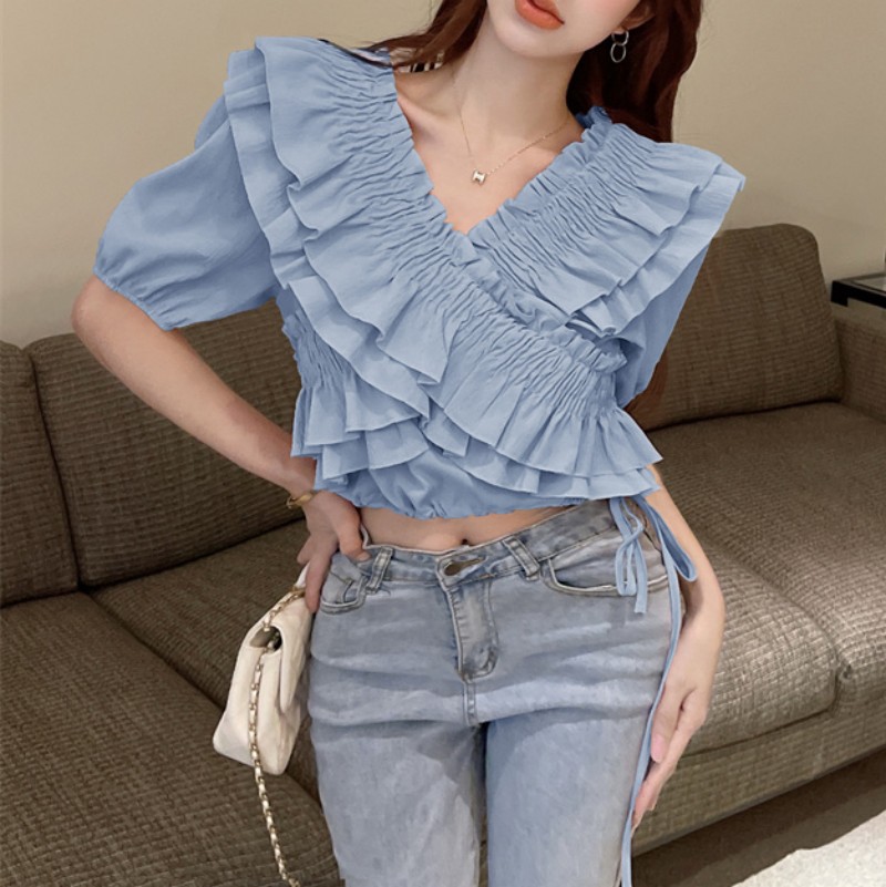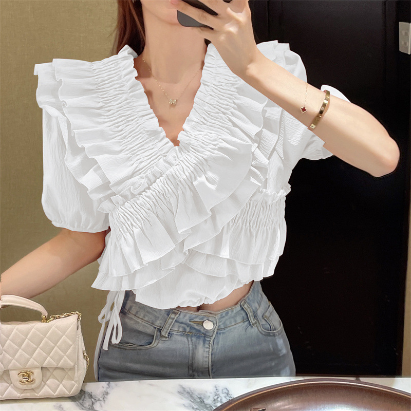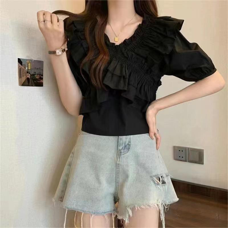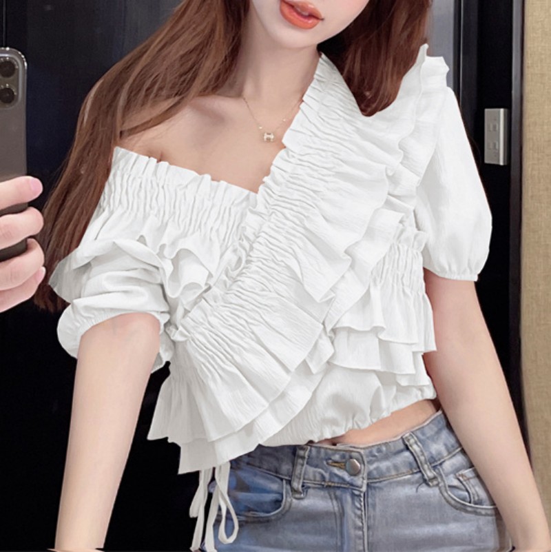 2023 여름 새로운 한국 스타일 달콤한 프릴 탄성 어깨 반팔 슬림 셔츠 여성용 스트레이트 칼라 탑스토어 가기