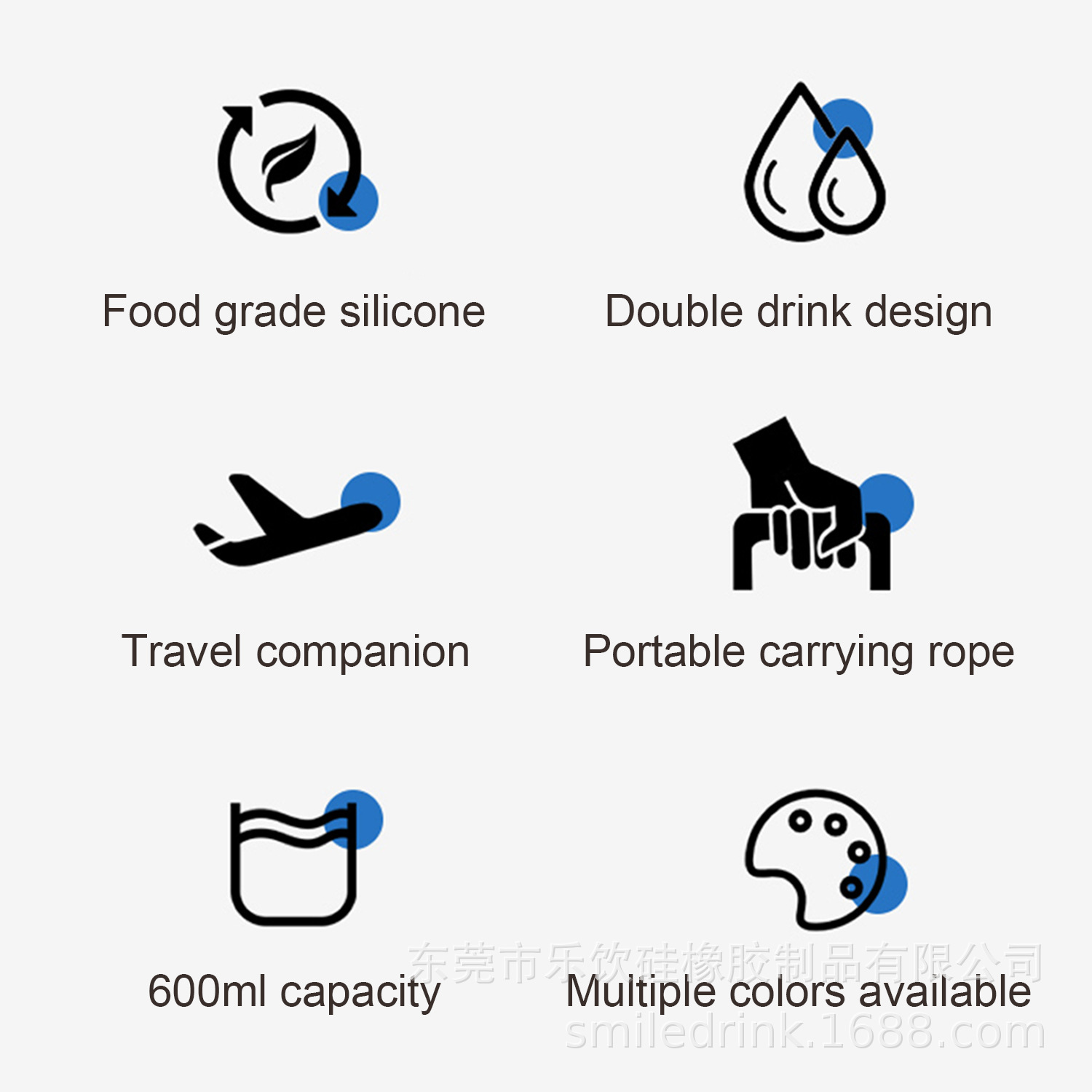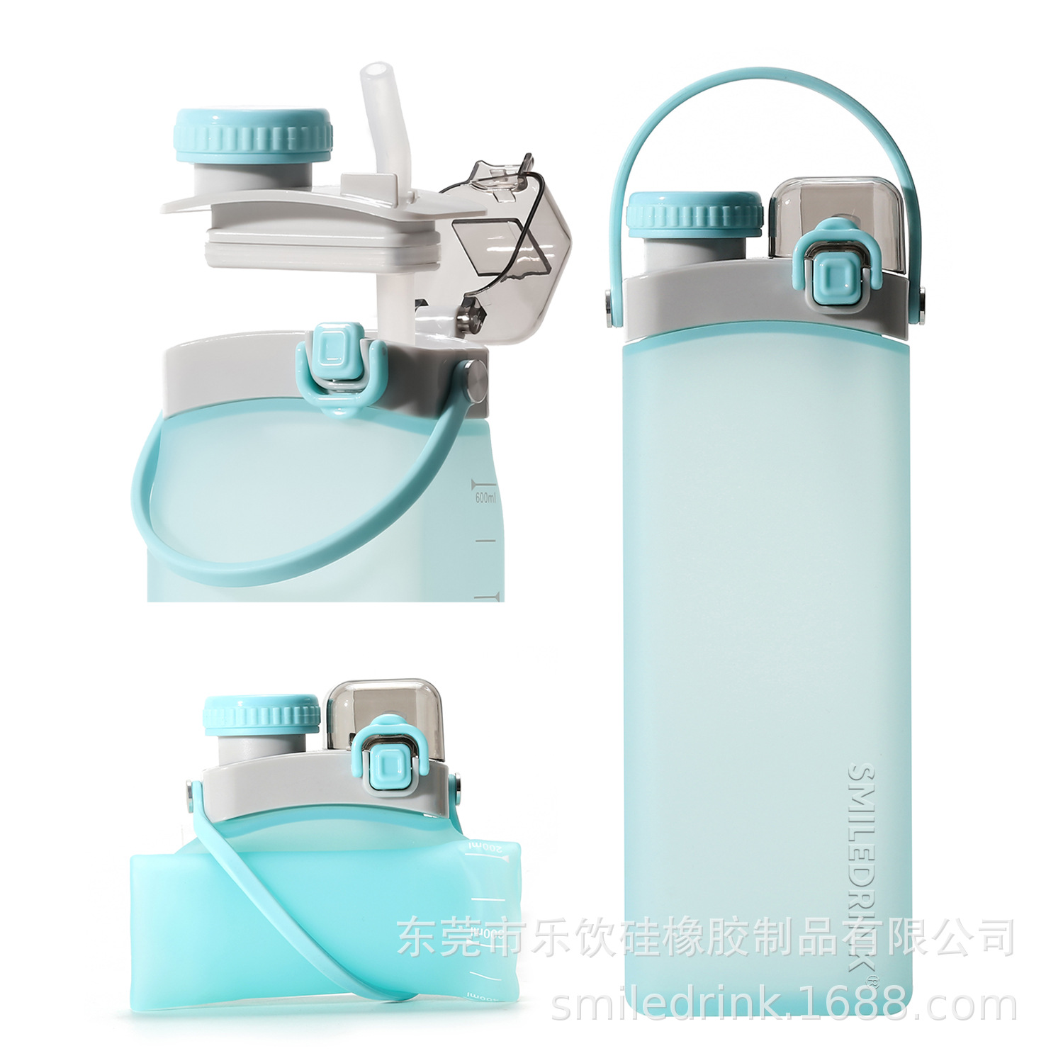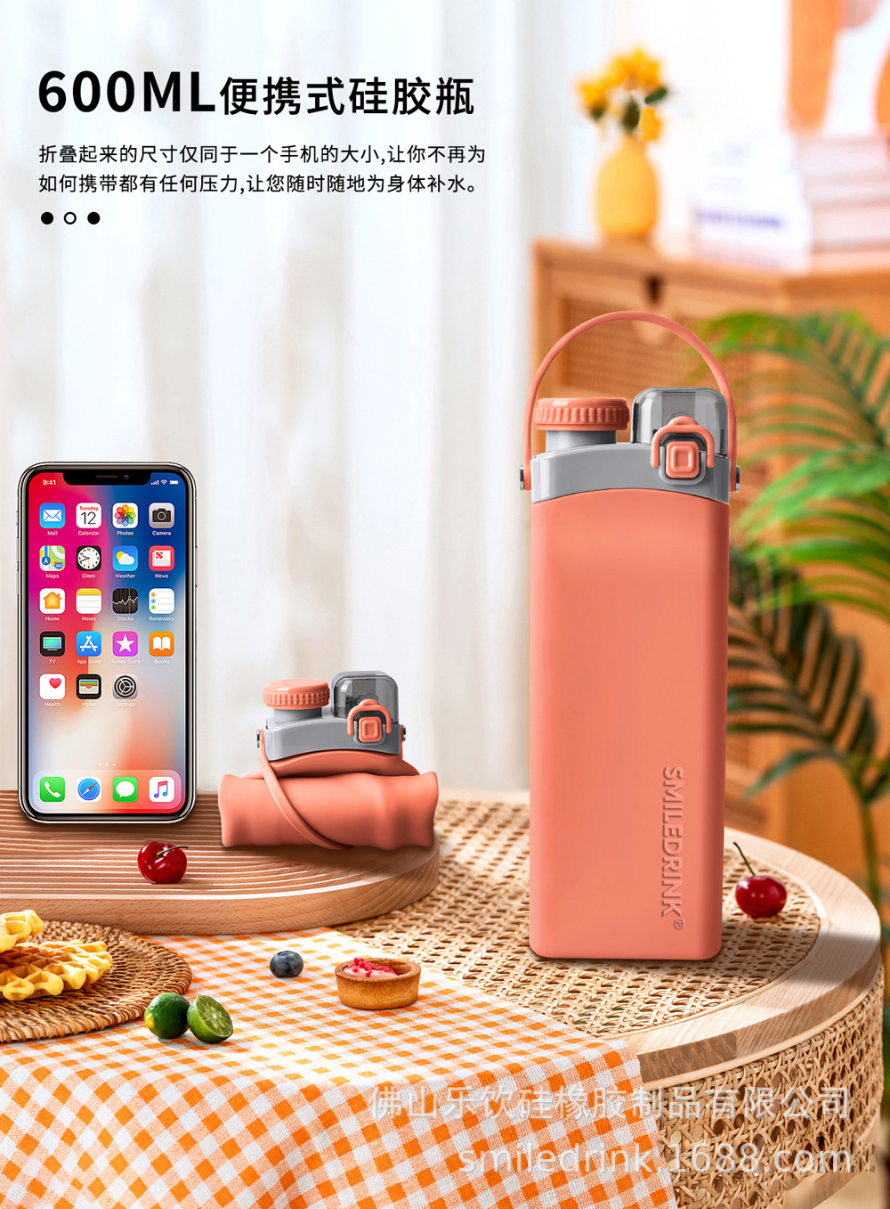5.【轻巧方便】600ML便携式硅胶瓶, 折叠起来的尺寸仅同于一个手机的大小。该产品充分利用柔软硅胶的特性,携带方便。