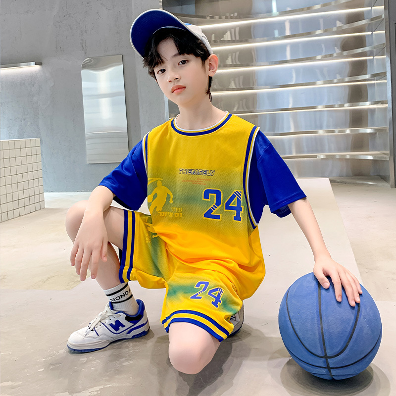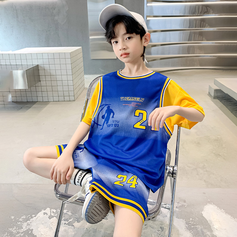 아동 의류 소년 여름 의류 세트 2023 새로운 잘 생긴 반팔 스포츠 농구 세트 투피스 어린이 세트 패션