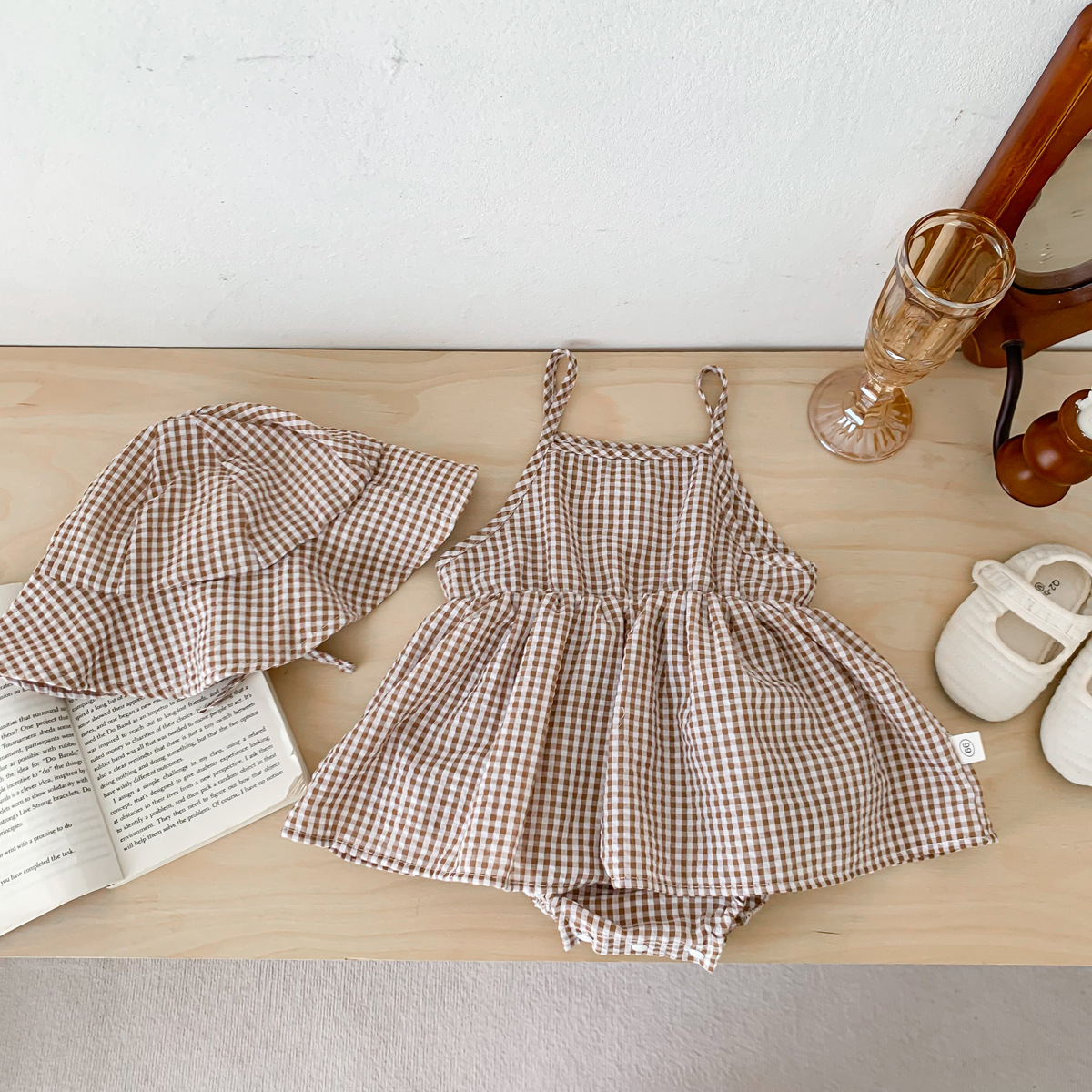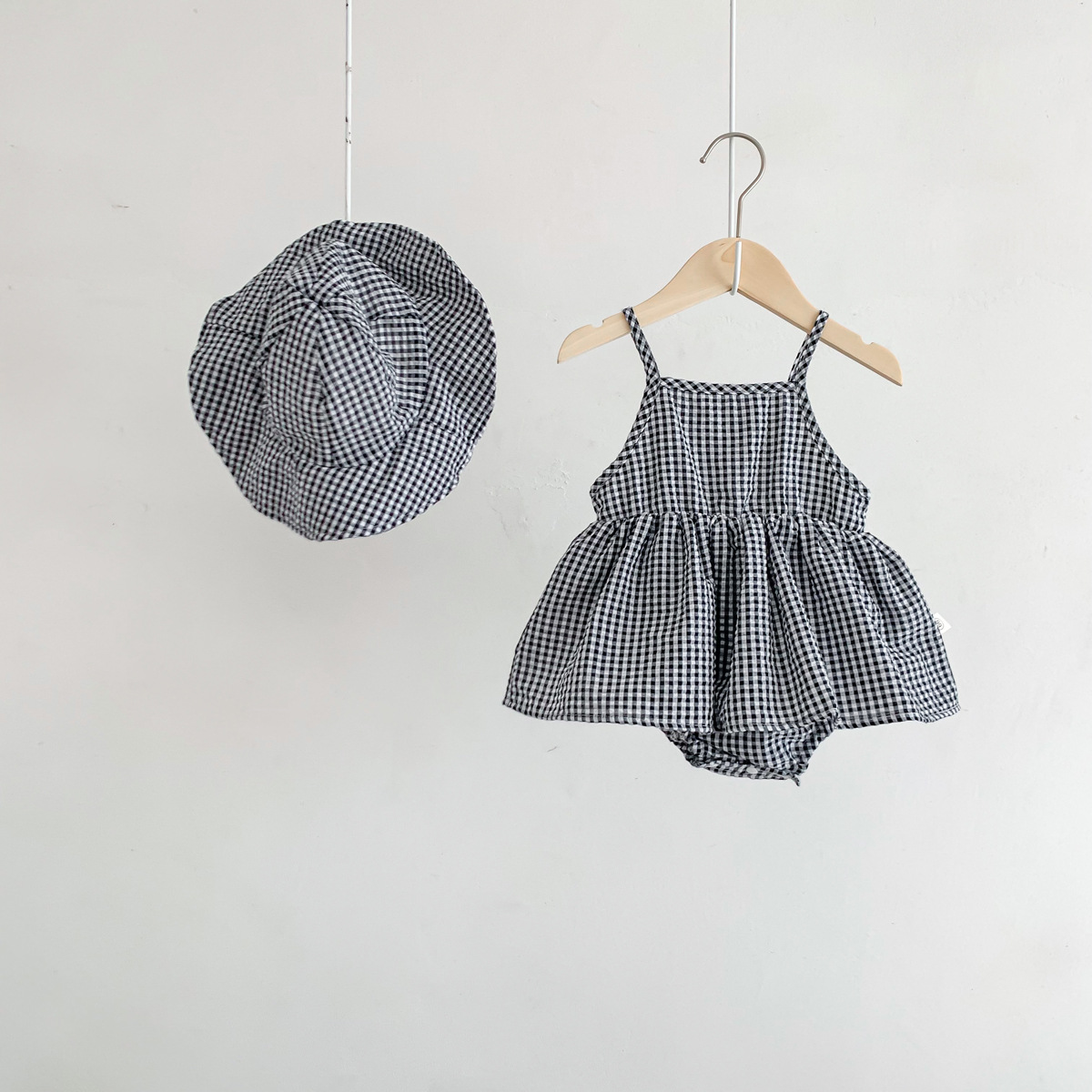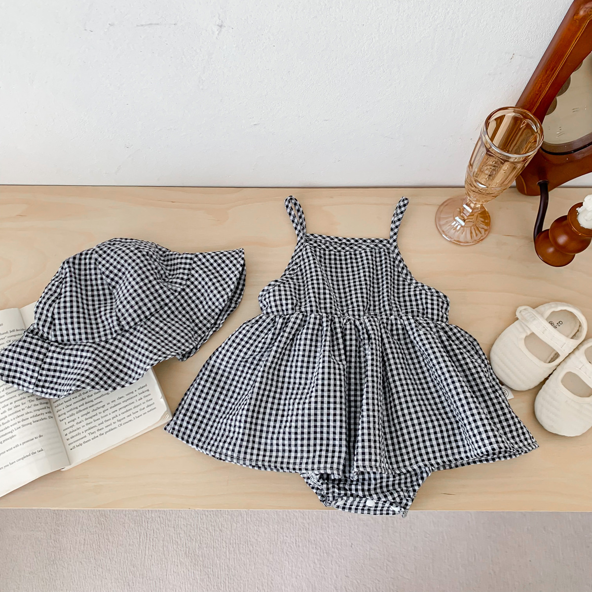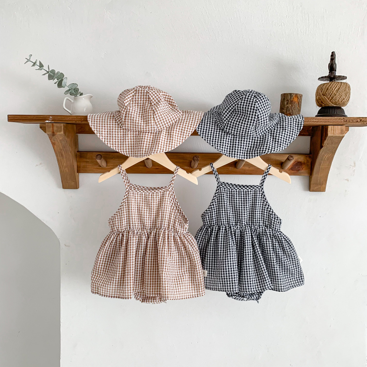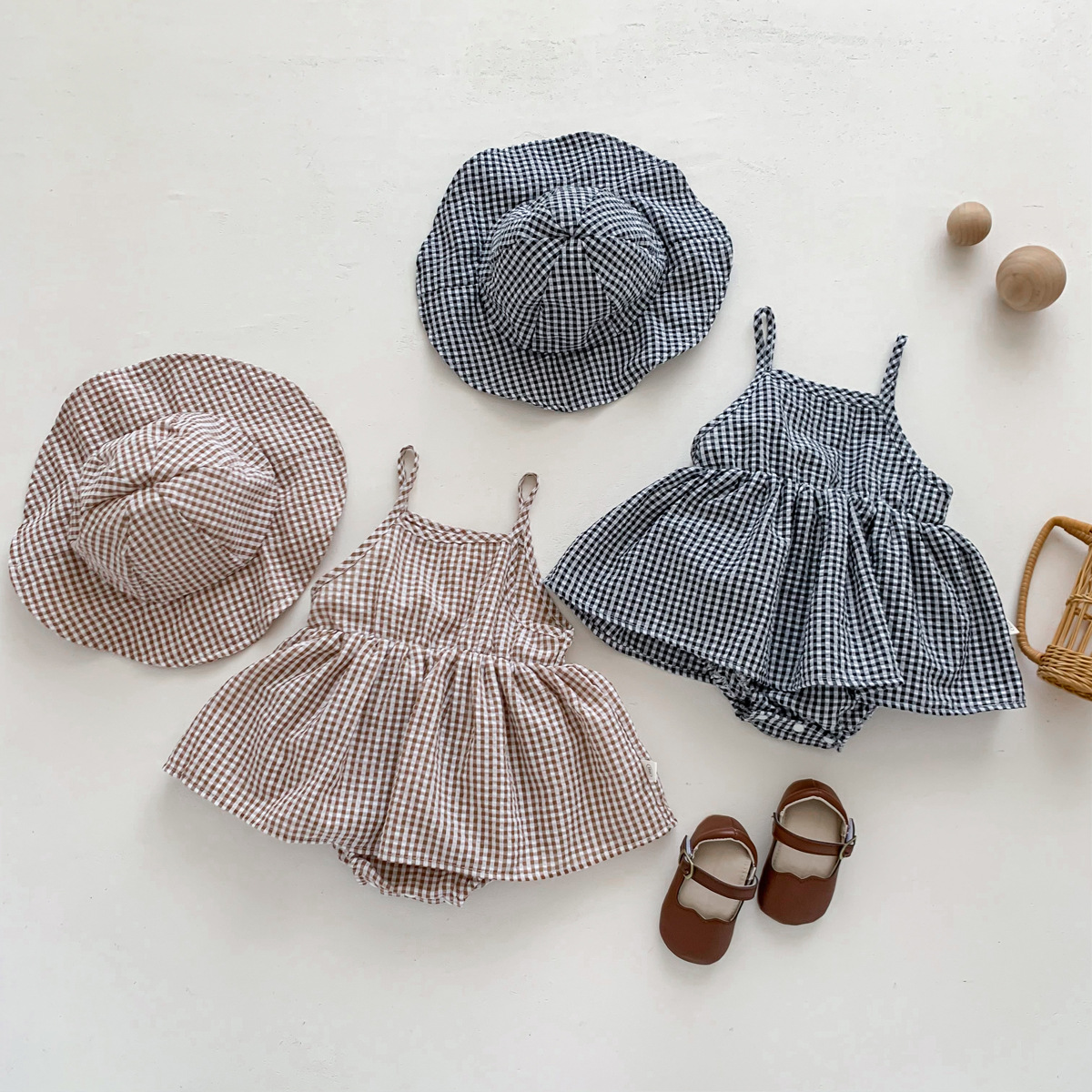 2025 여름 여아 민소매 바디수트, 영유아용 한국식 체크무늬 서스펜더 원피스, 모자 포함스토어 가기