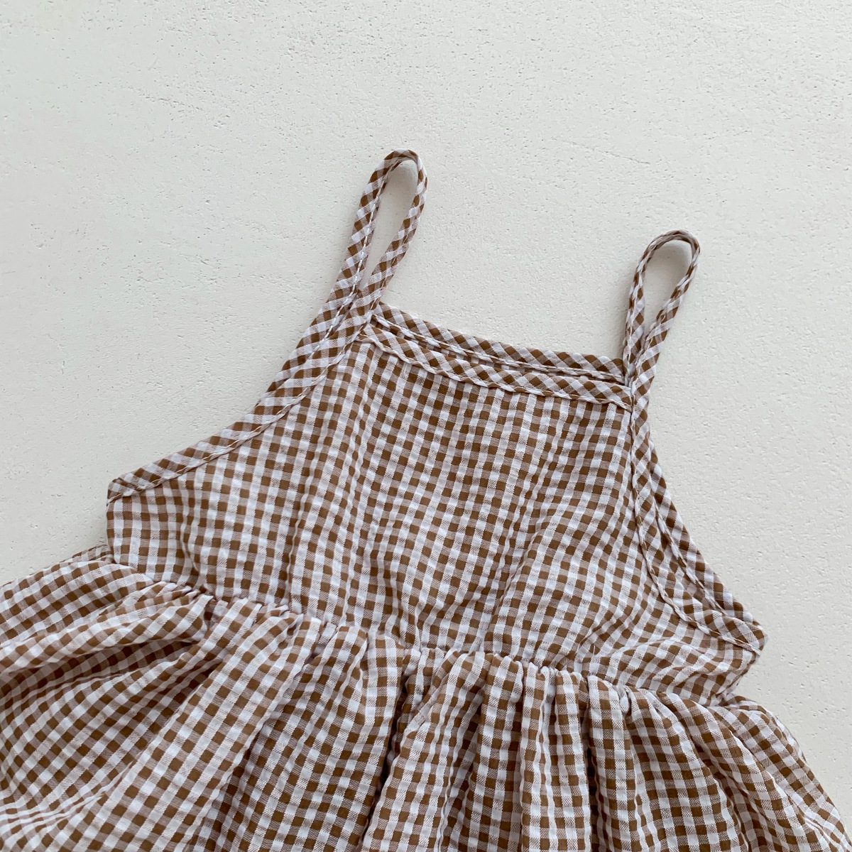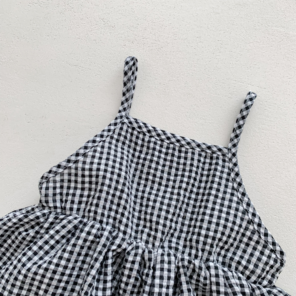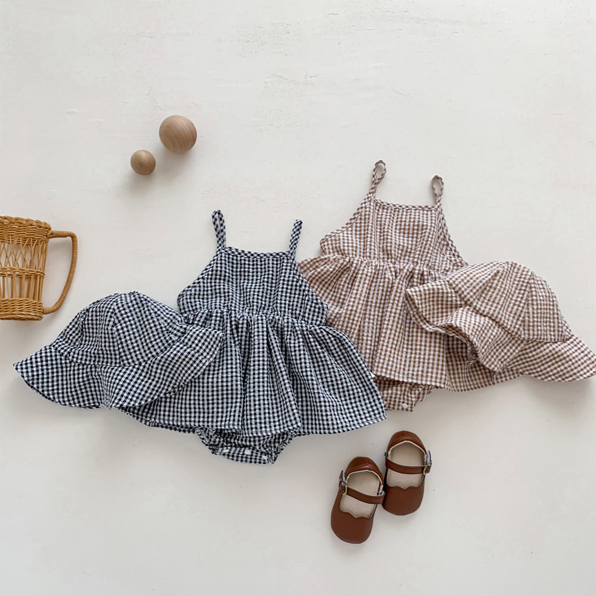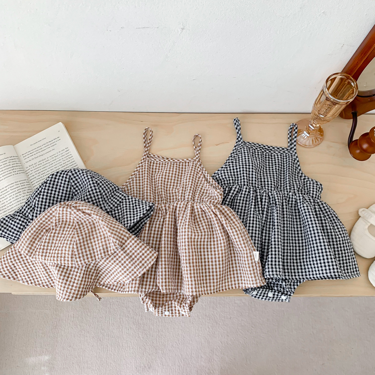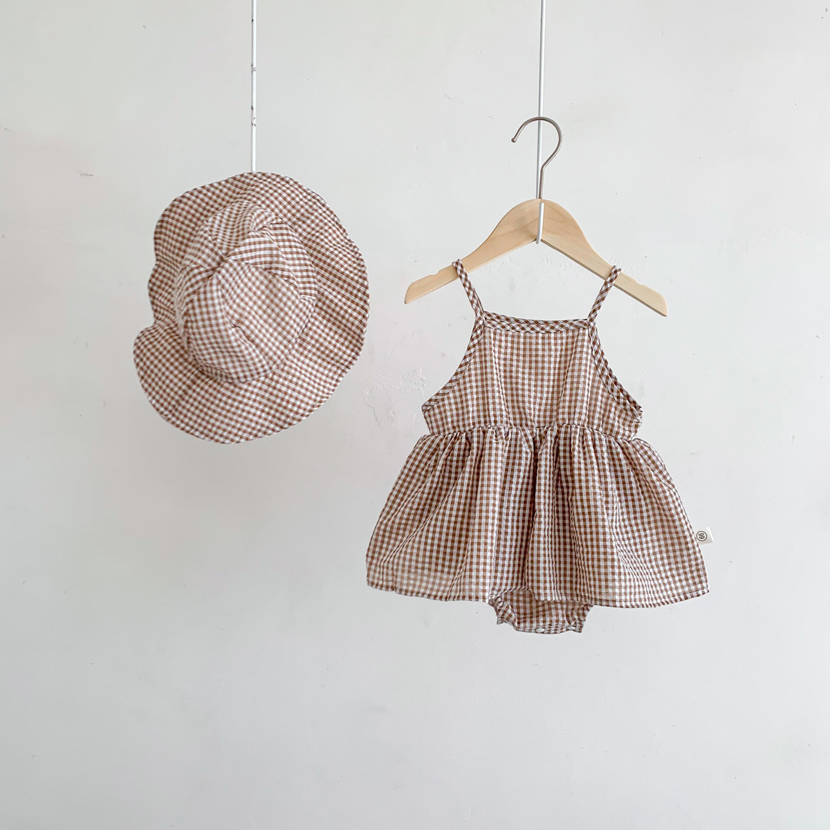 2025 여름 여아 민소매 바디수트, 영유아용 한국식 체크무늬 서스펜더 원피스, 모자 포함스토어 가기