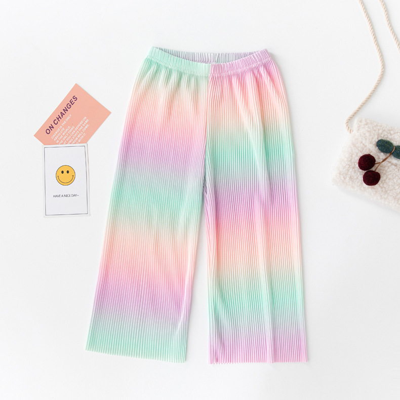 2024 인기 여름 어린이 바지 어린이 넓은 다리 바지 소녀 레깅스 주름진 무지개 넓은 다리 바지 모기 방지 바지
