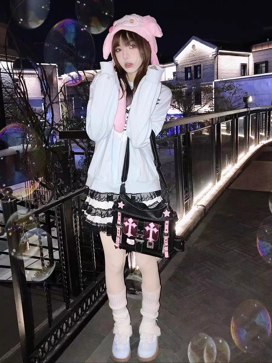 원래 틈새 아시아 문화 밀레니엄 핫 소녀 휴대용 가죽 가방 y2g 멋진 소녀 키티 고양이 검은 핑크 대비 컬러 메신저 가방스토어 가기