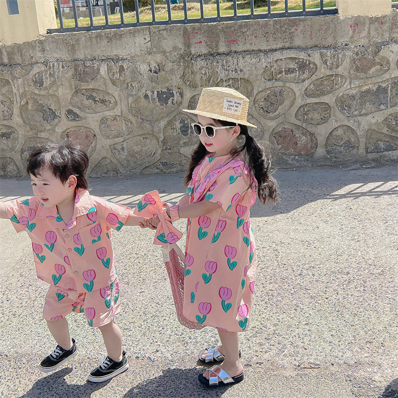 형제와 자매 의류 ~ 여름 튤립 소녀 헤어 벨트 원피스 소년 반팔 반바지 세트 자매 의류의 한국어 버전스토어 가기