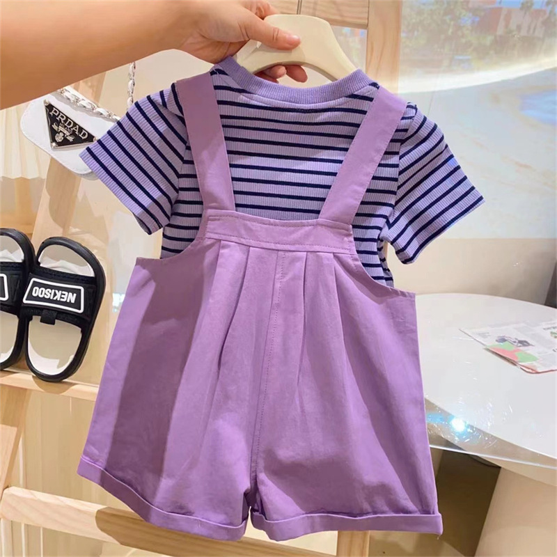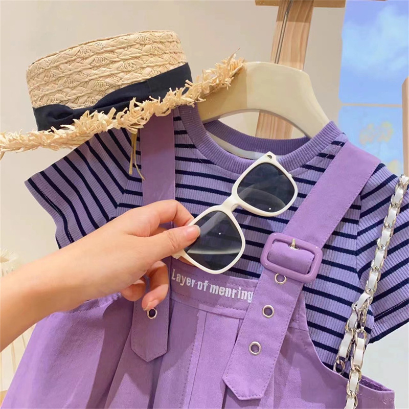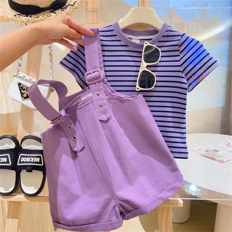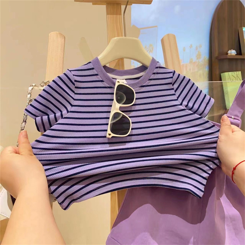• 보라색 줄무늬 티셔츠 + 멜빵 세트