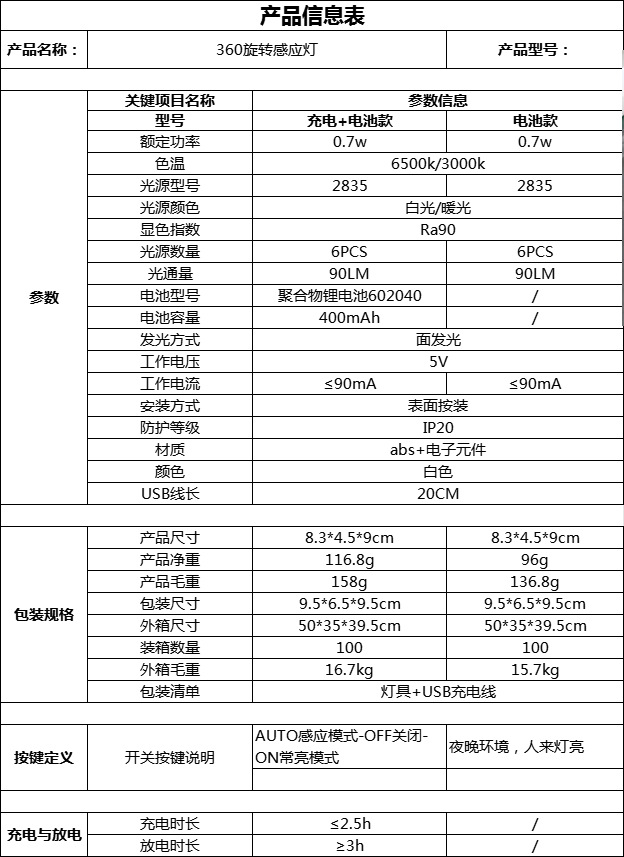 电池款不带拨动开关控制关闭电源/常亮模式/夜间感应模式 AUTO-OFF-ON 参考以下实拍图片。安装7号电池后开始工作夜间没有灯光情况下人体感应亮灯,没有常亮模式。灯头位置可安装拆卸三节7号电池,赠送背胶,灯头底座带磁吸,磁吸安装,另外7号电池是不赠送的,需要客户收到货后自行购买电池安装使用。没有充电口。