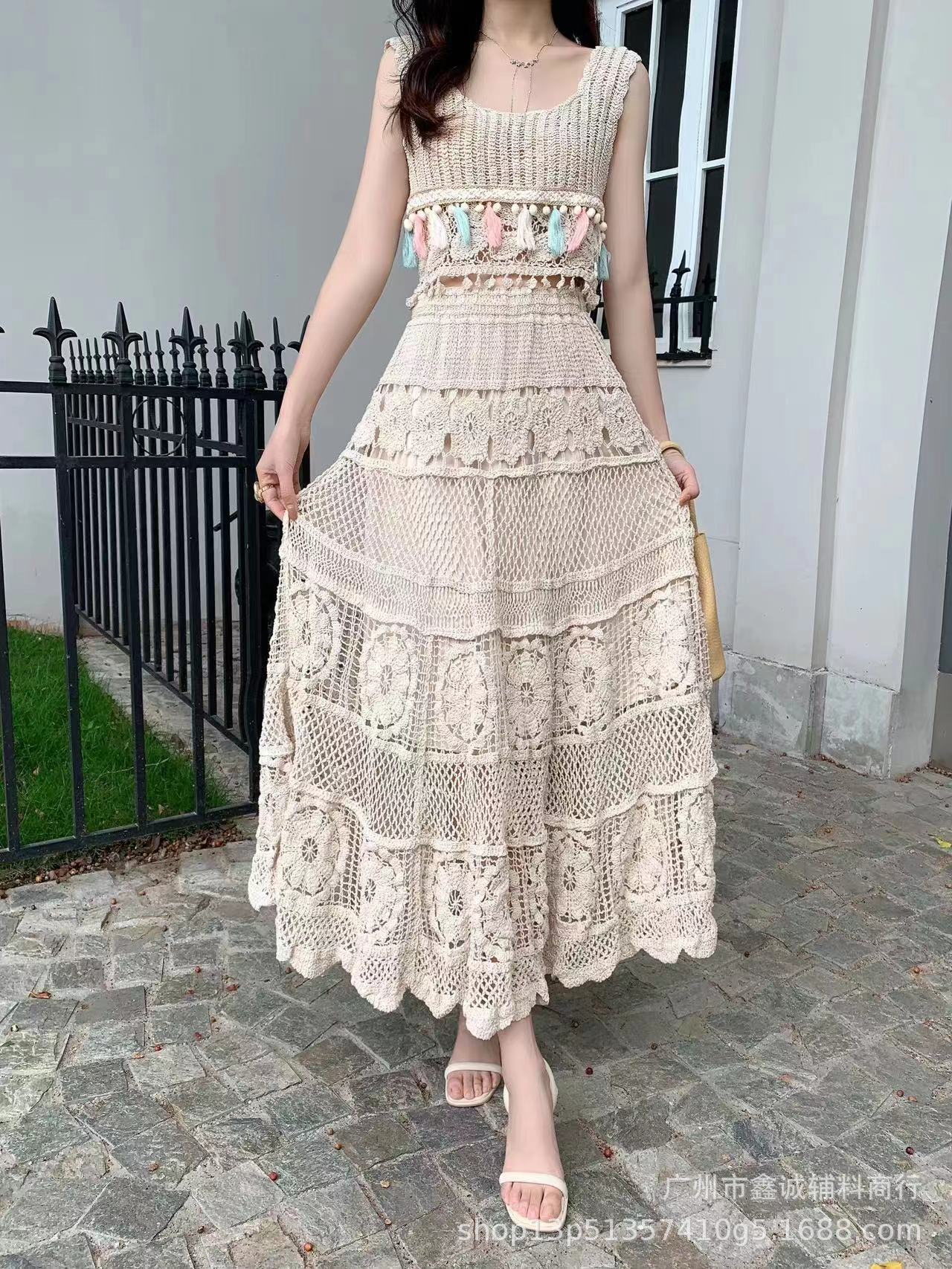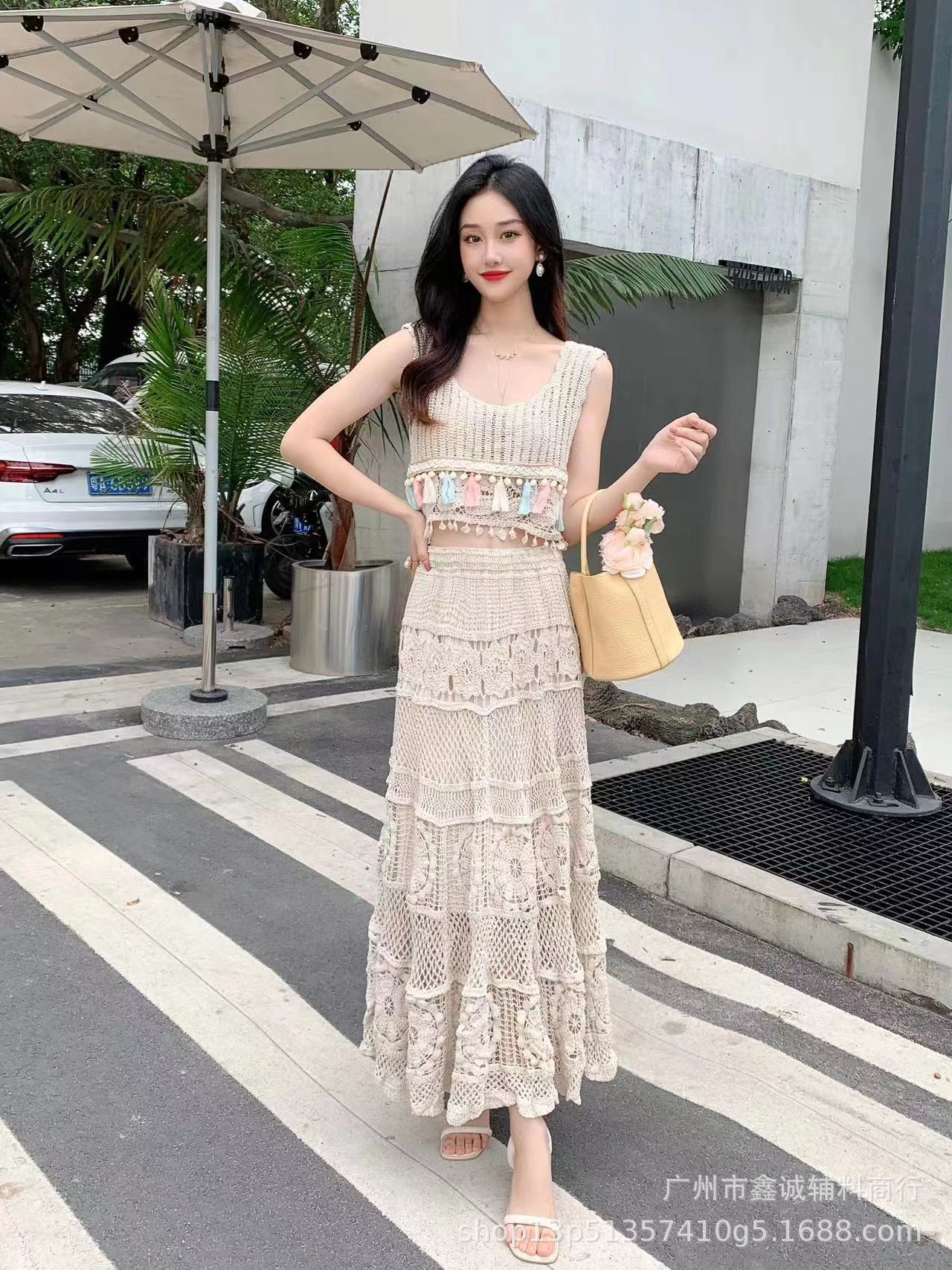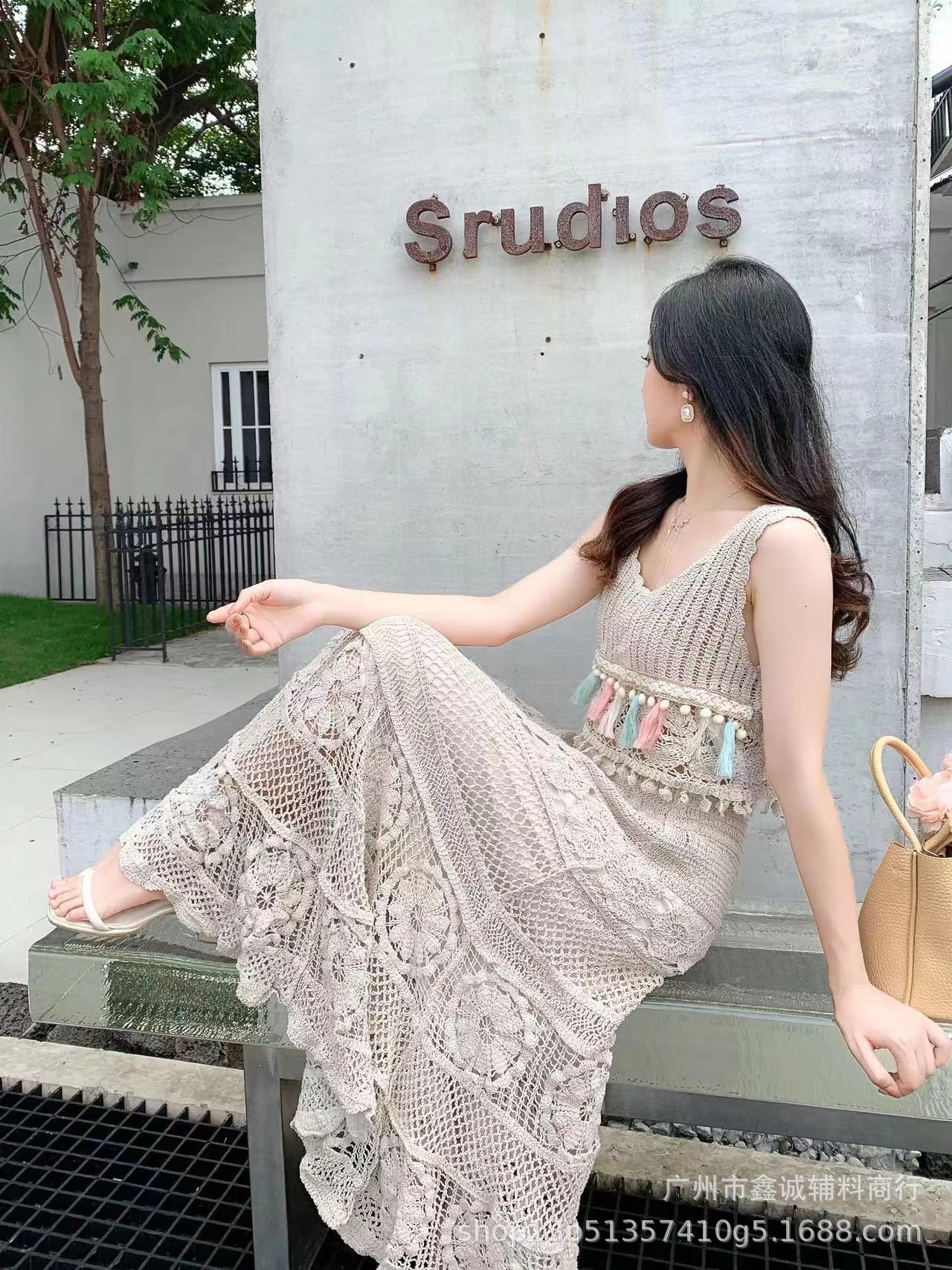 새로운 레트로 하이 엔드 센스 중공 술 캐미솔 여성용 여름 크로 셰 뜨개질 모든 매치 루즈한 미디 원피스 투피스 세트