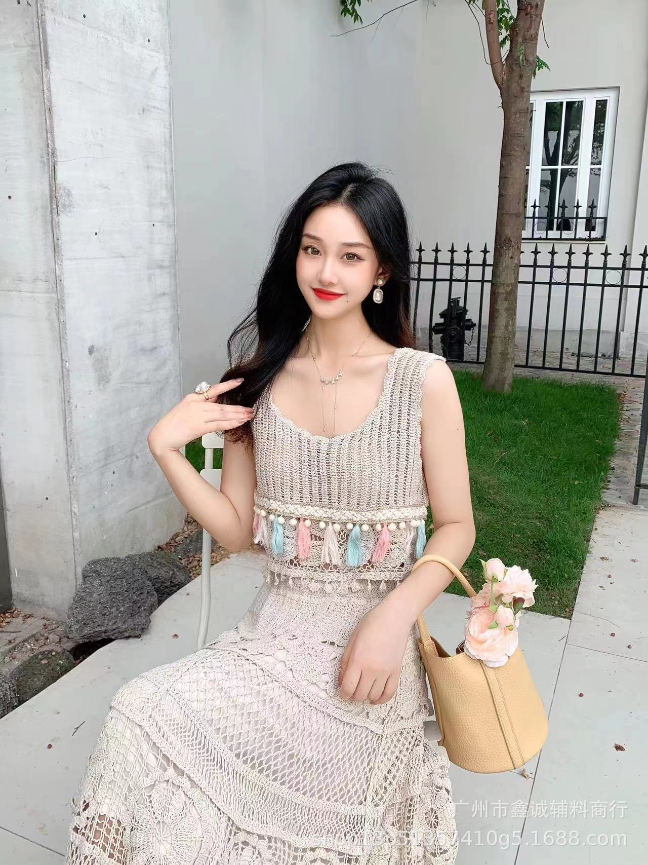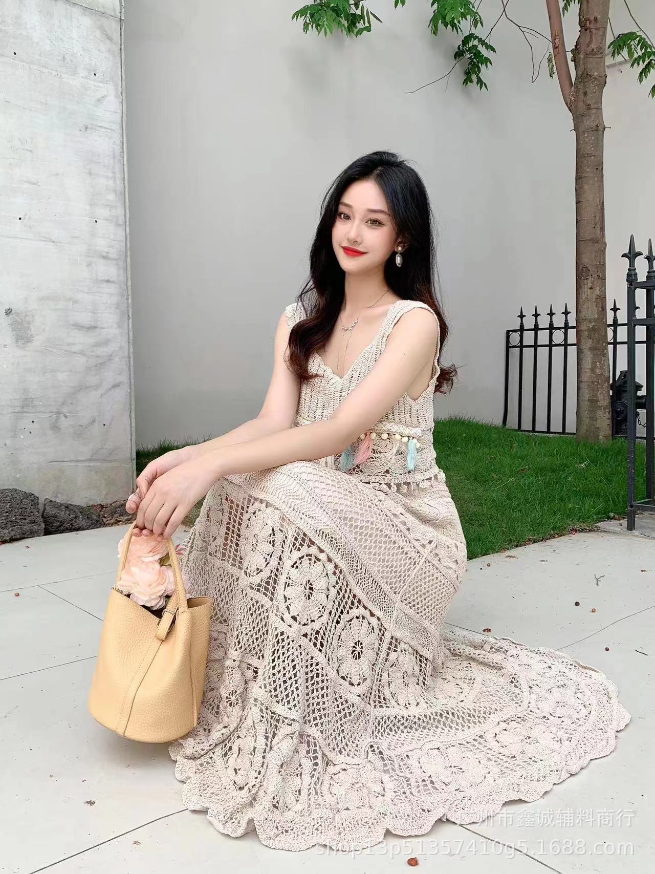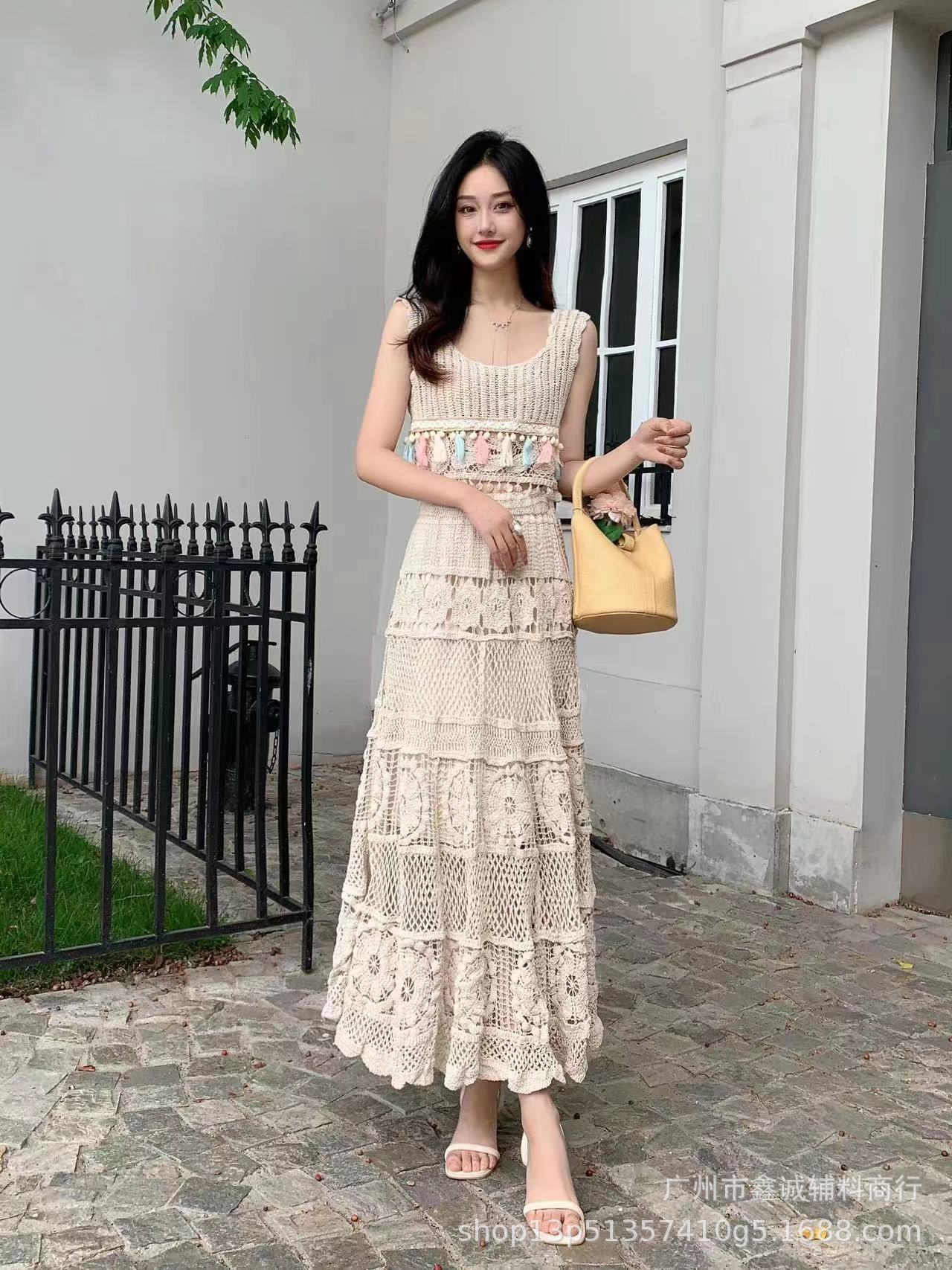 새로운 레트로 하이 엔드 센스 중공 술 캐미솔 여성용 여름 크로 셰 뜨개질 모든 매치 루즈한 미디 원피스 투피스 세트