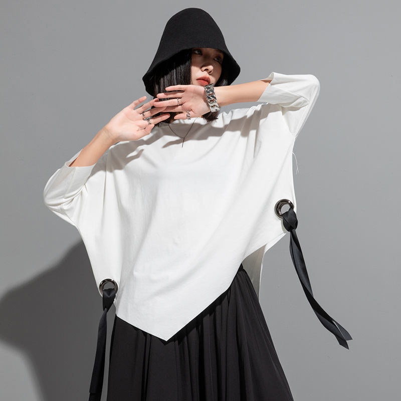 유럽과 미국 여름 새로운 큰 옥수수 반팔 티셔츠 캐주얼 박쥐 소매 리본 최고 성격 어두운 숙녀 여성 의류스토어 가기