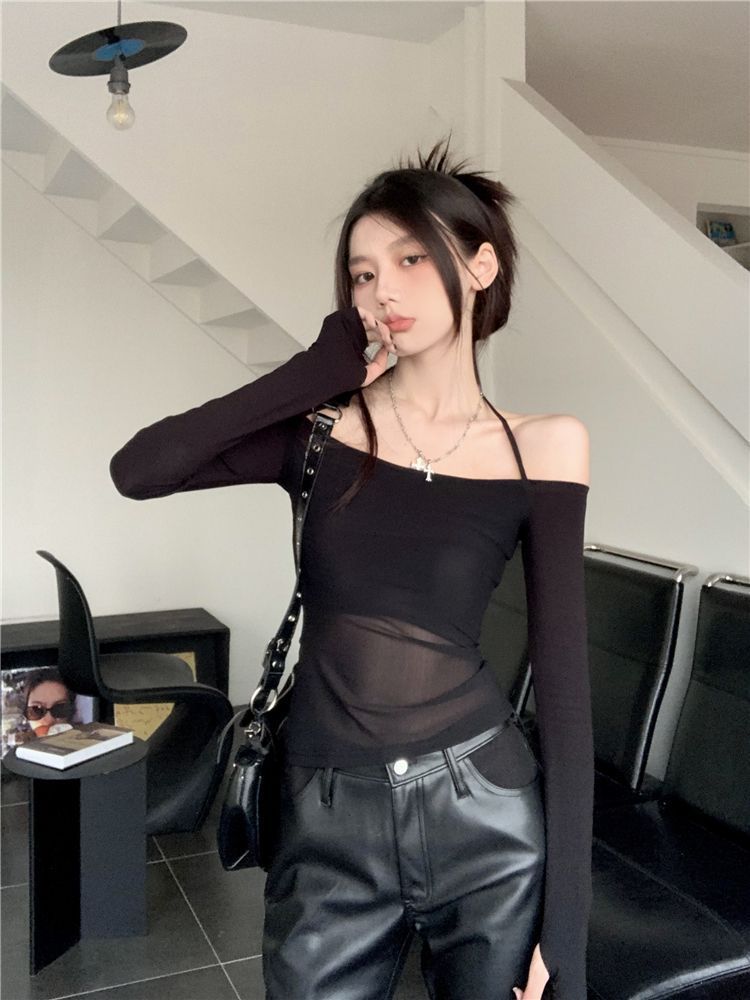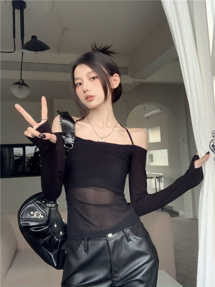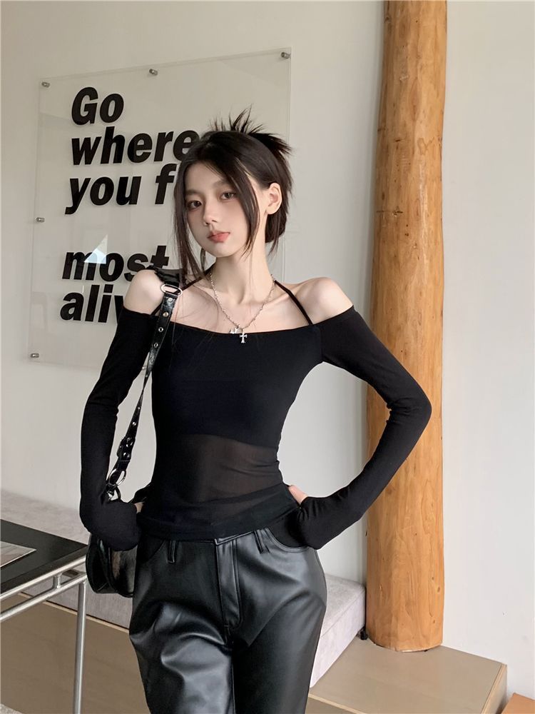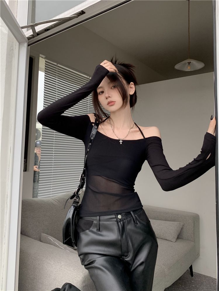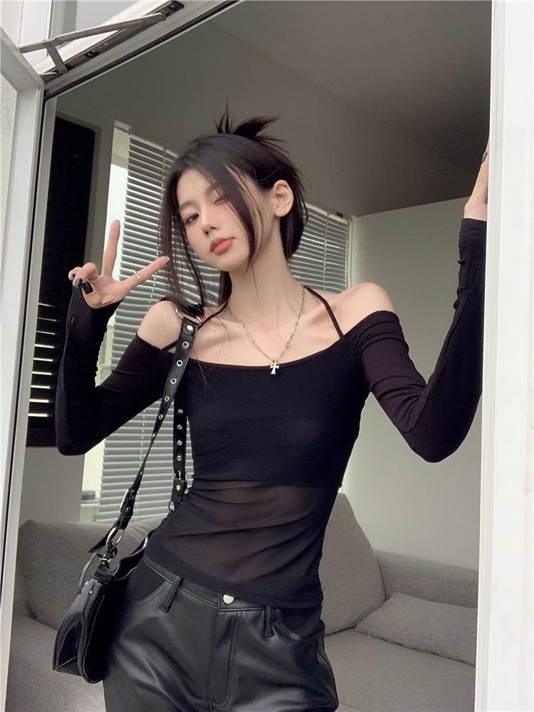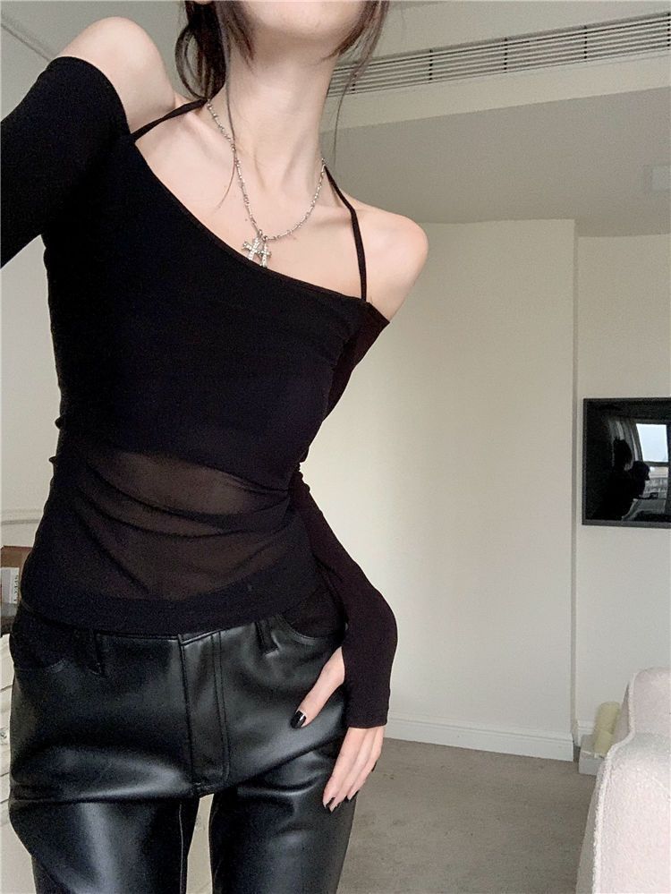 2023 새로운 티셔츠 시크 리틀 섹시 블랙 퓨어 메쉬 스티칭 디자인 슬림베이스 셔츠 탑스토어 가기